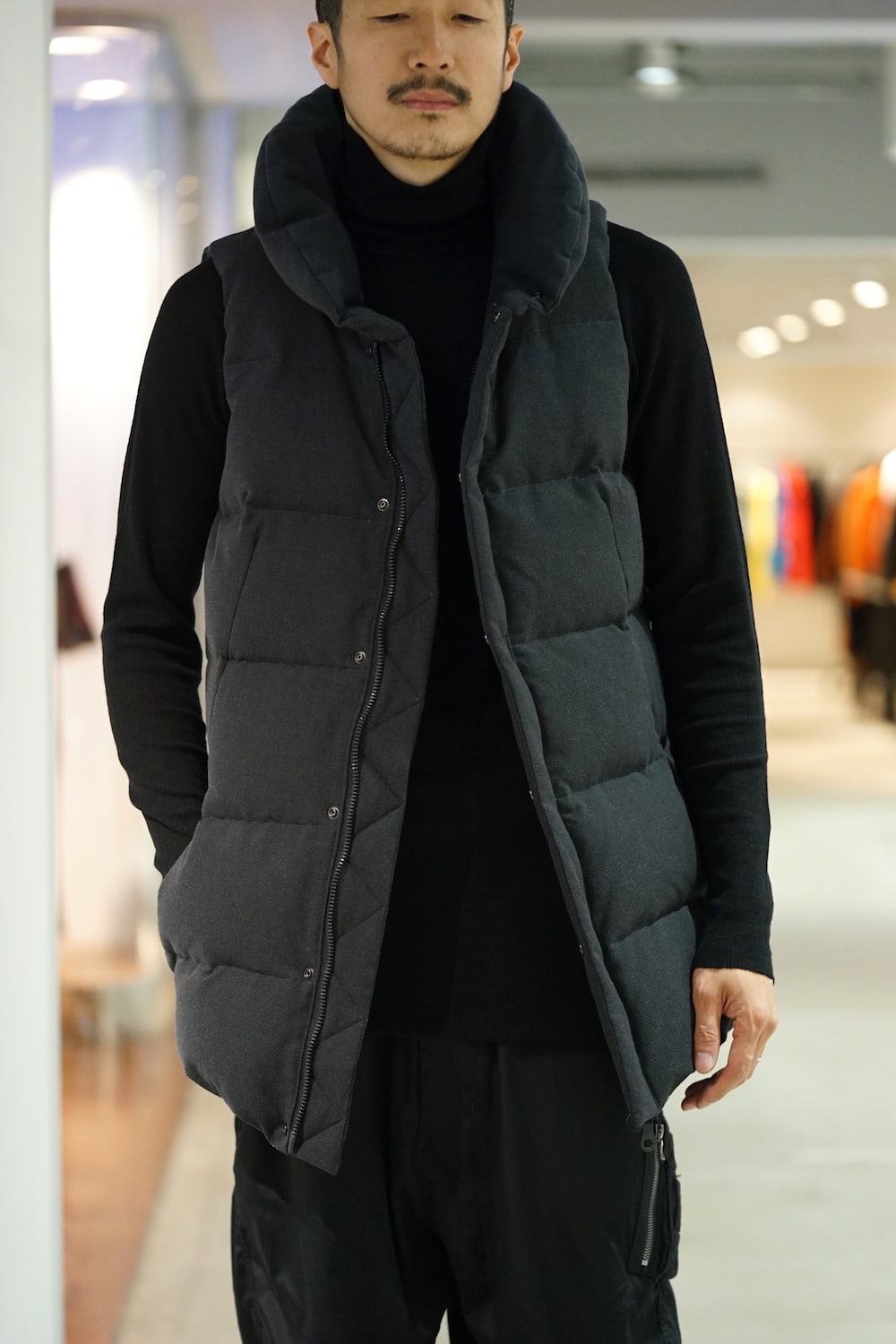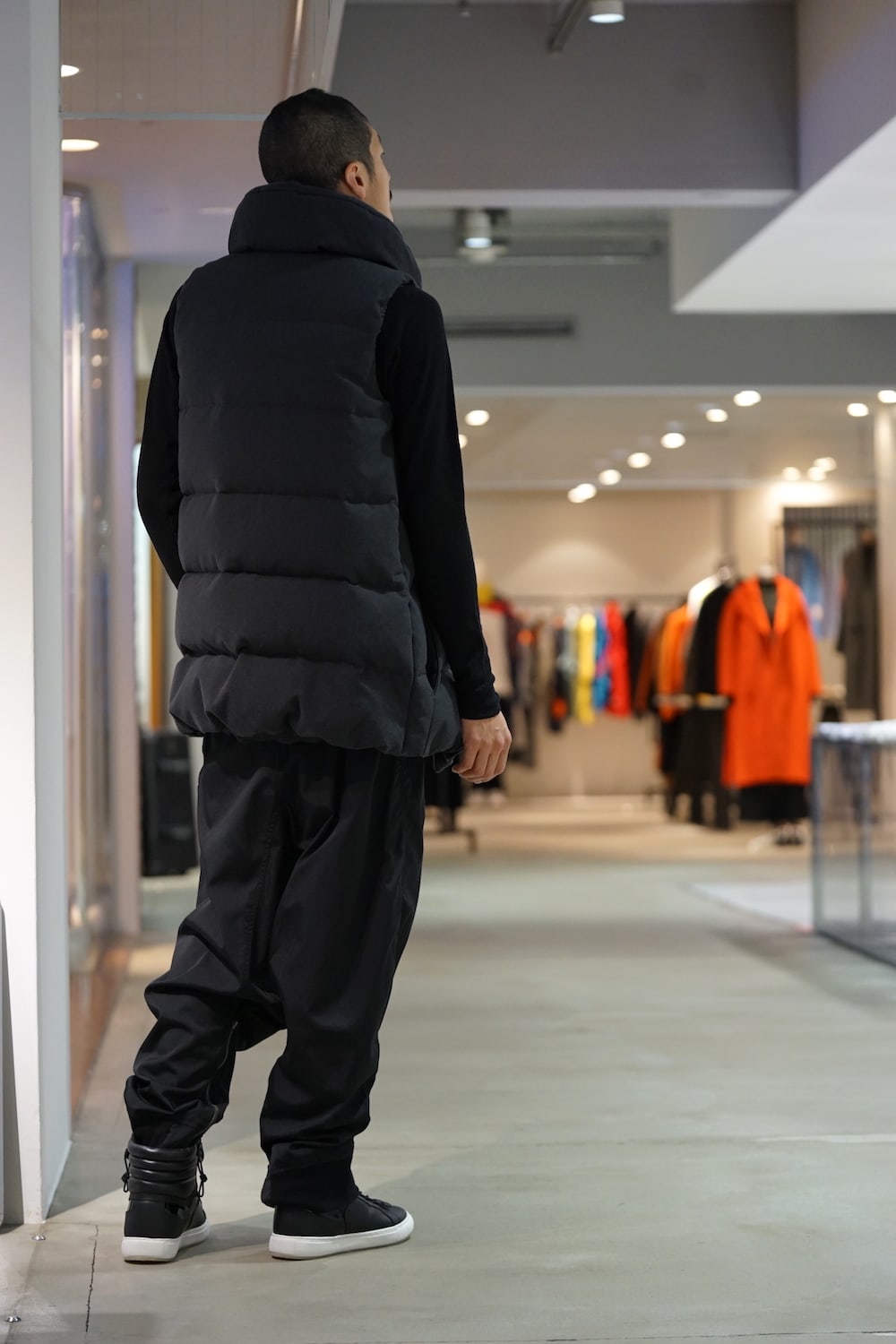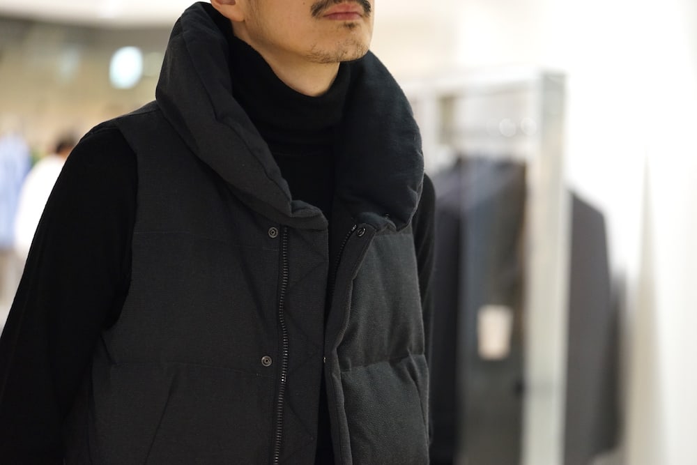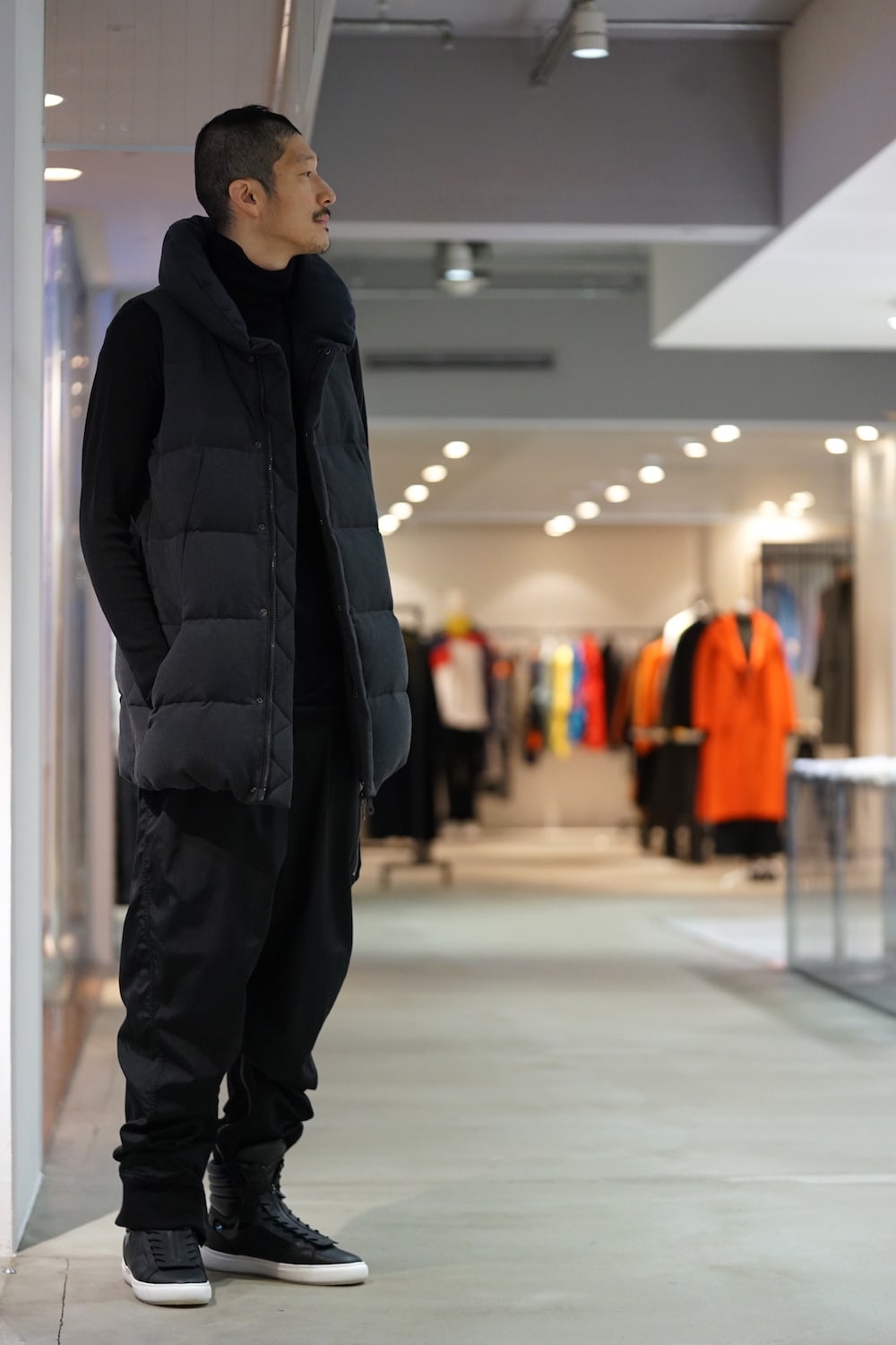 がっちりと太いシルエットに負けないよう、アウターにはRIPVANWINKLEのDOWN VESTを合わせました。