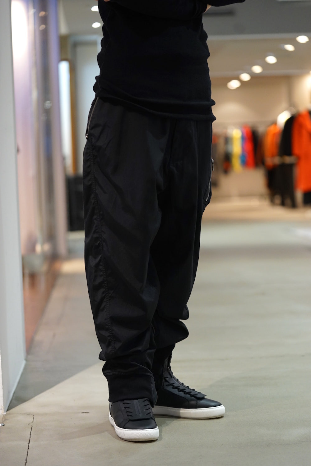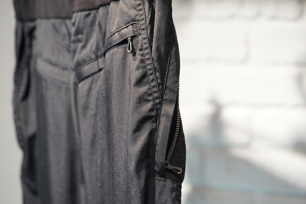 サイドにはポケットを配備させ、ミリタリーライクなディテールに仕上げながら、裾のゴム+ZIPで機能性を持たせた1本に仕上がっています。