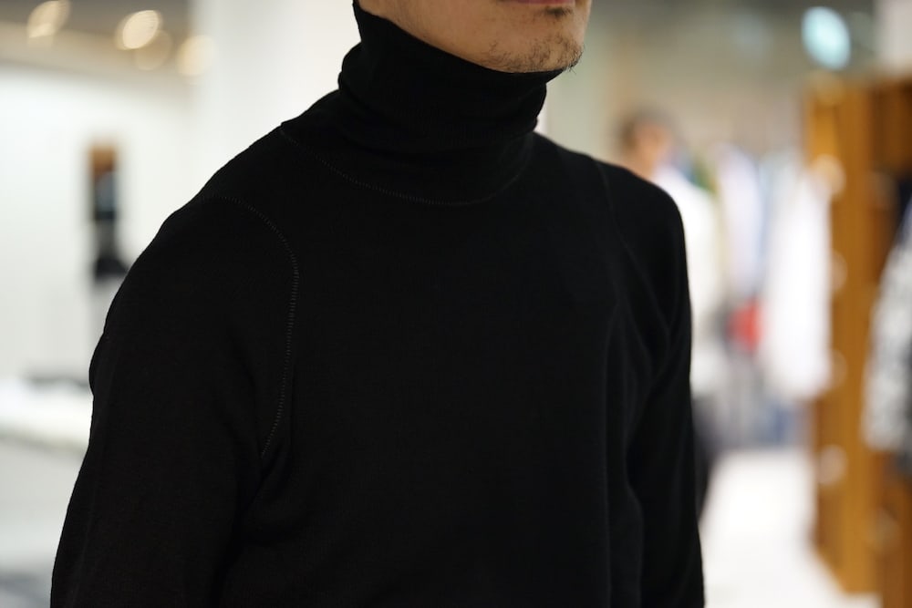 トップスにはコントラストが効くようにThe Virid-ianneのタートルネックを選び、メリハリがつくようにスタイリングしてみました。