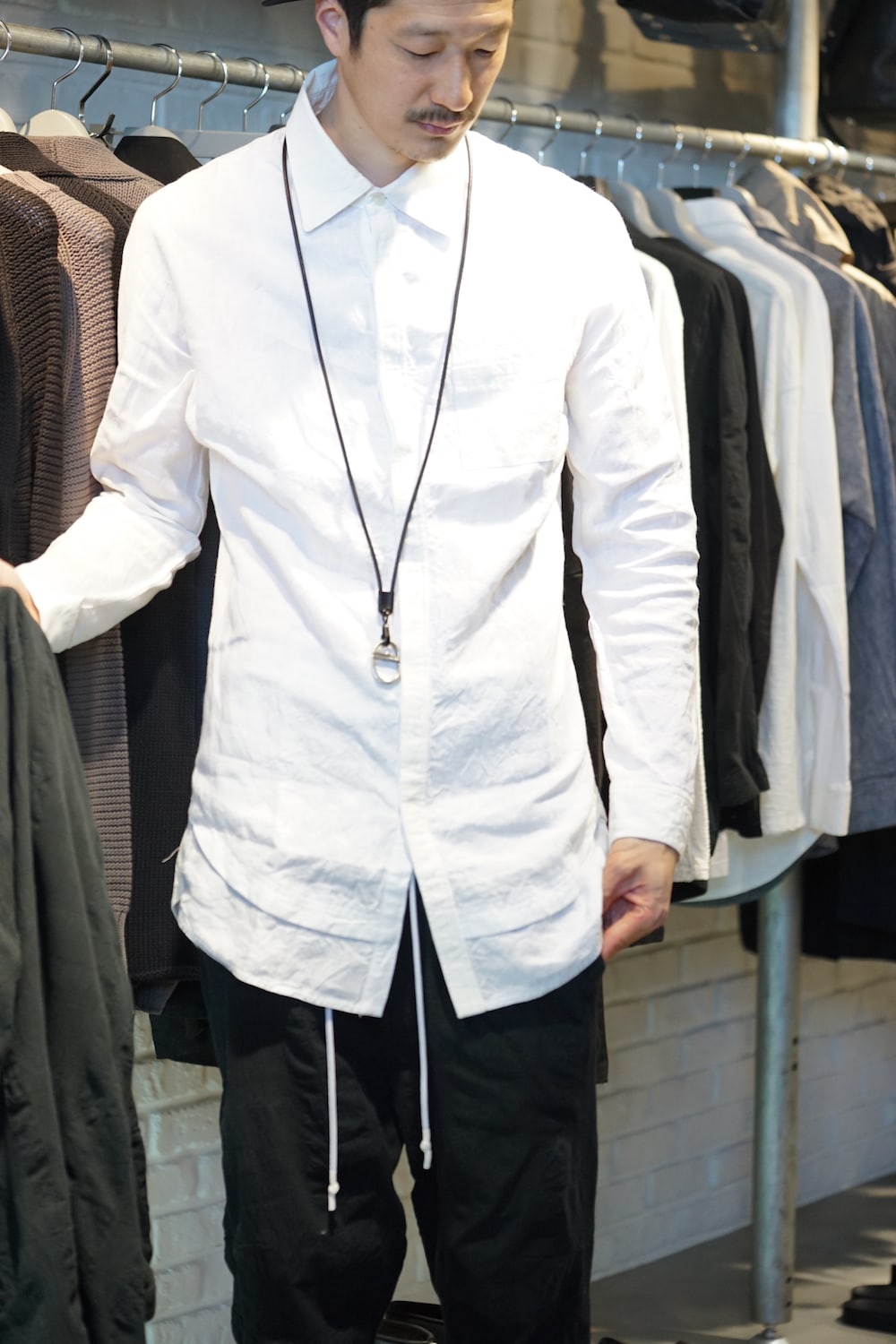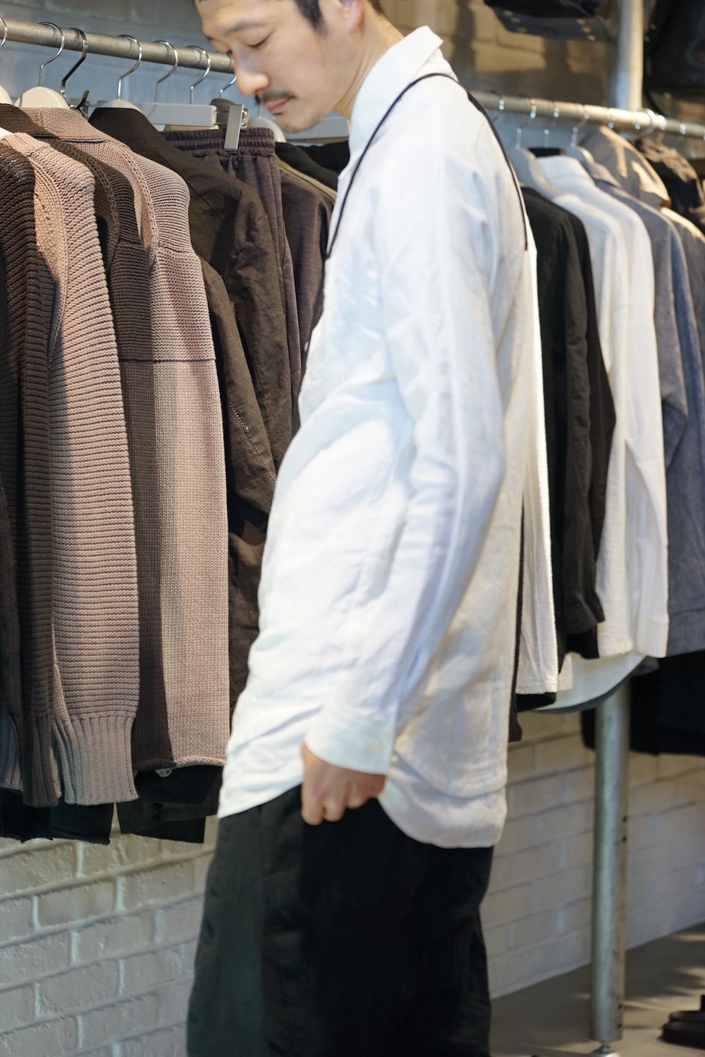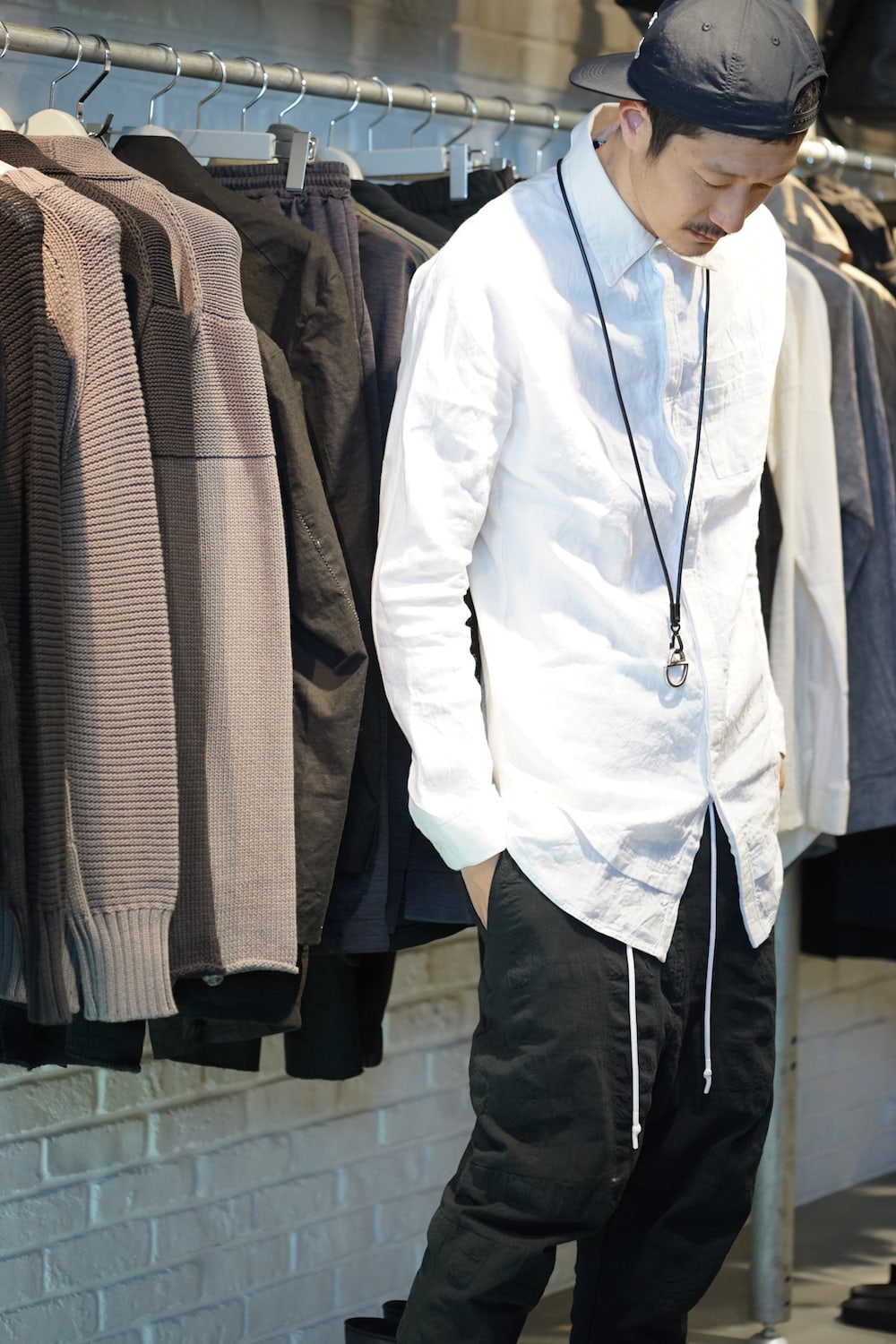 前身頃にシャリ感のあるさらっとしたリネンシャンブレー100%を使用し、後身頃には綿麻の清涼感があるコットンダンガリーを使用した生地を用いることで、シンプルなクレイジーパターンを形成。ナチュラル感のある生地に製品洗いしたもので仕上げています。パターンはブランドらしくドルマンスリーブで、シャープなシルエットながら着やすくなっています。