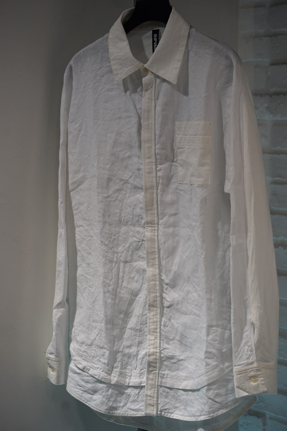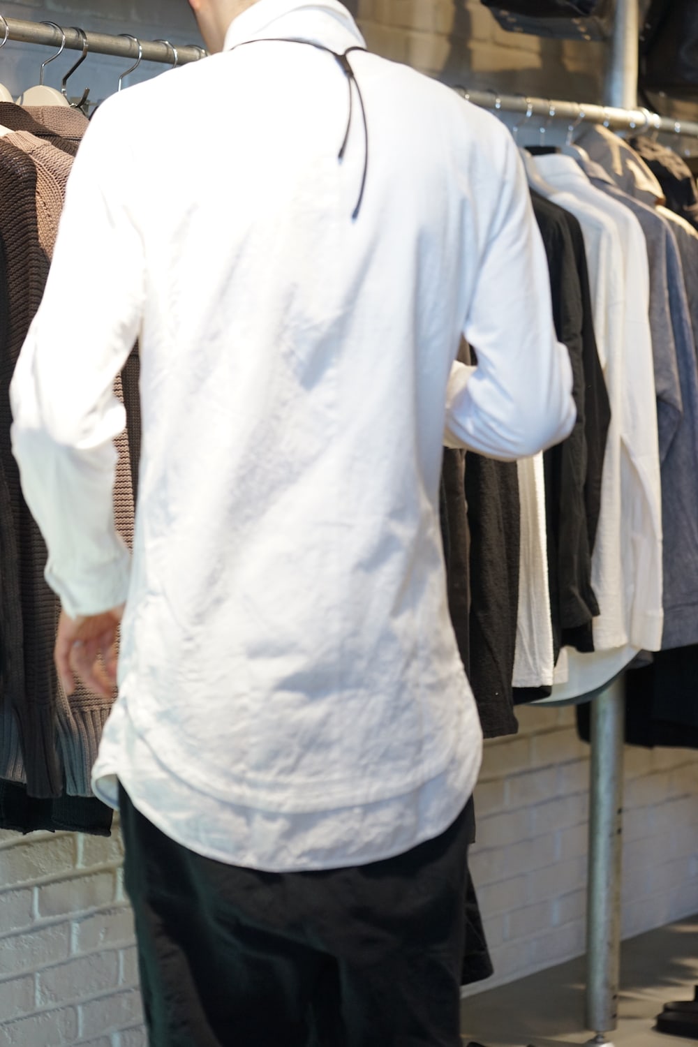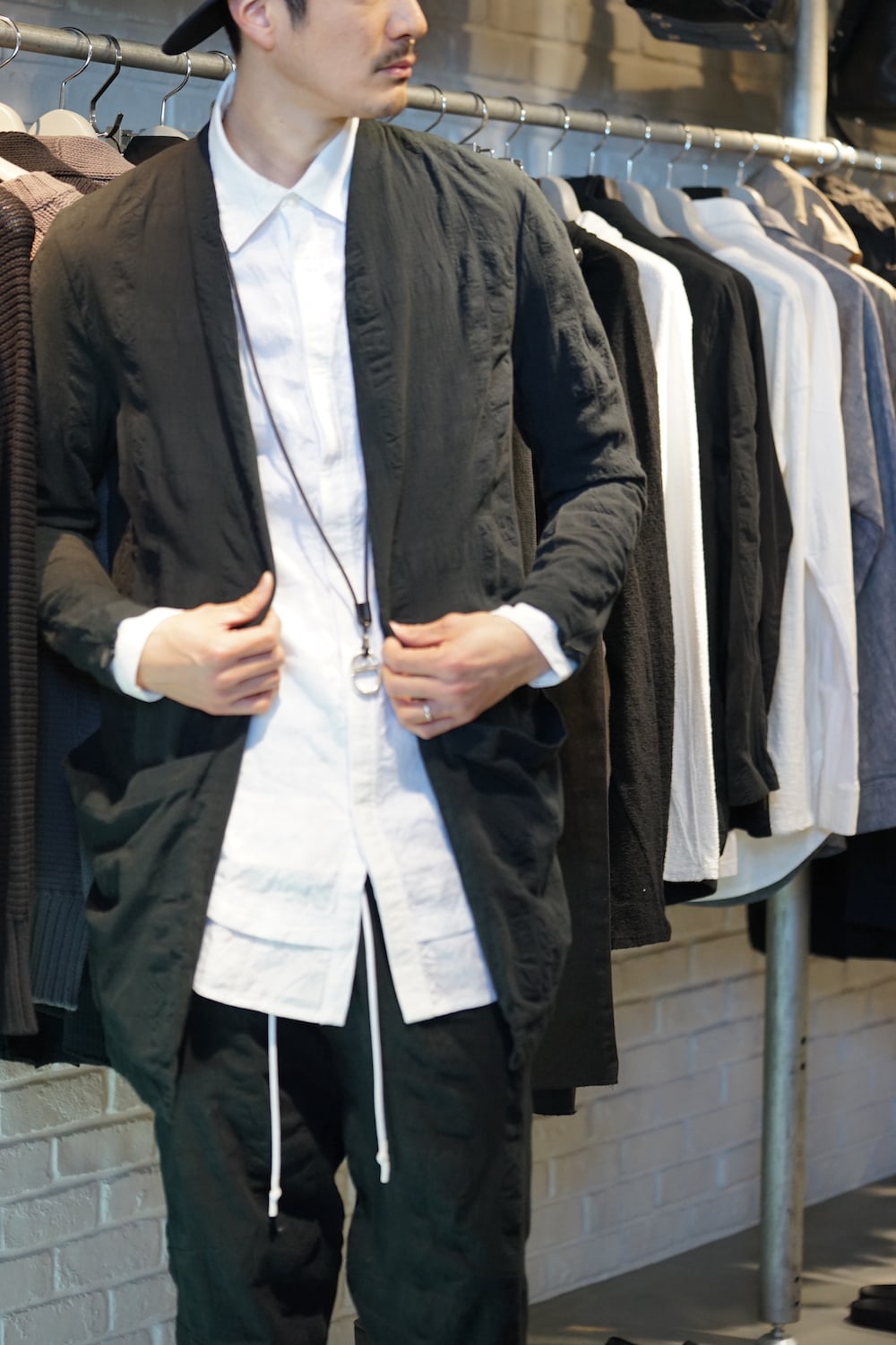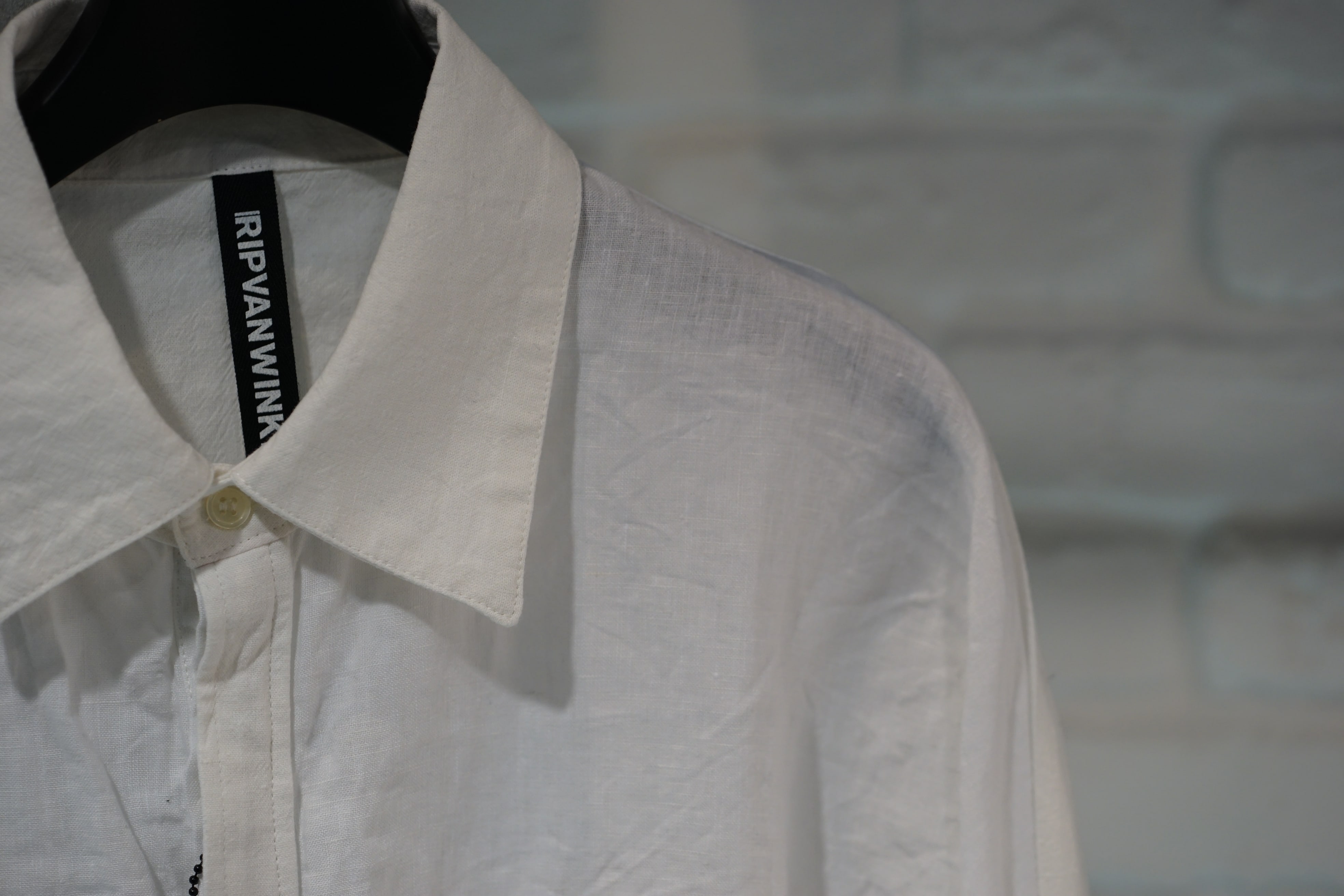 前身頃にシャリ感のあるさらっとしたリネンシャンブレー100%を使用し、後身頃には綿麻の清涼感があるコットンダンガリーを使用した生地を用いることで、シンプルなクレイジーパターンを形成。ナチュラル感のある生地に製品洗いしたもので仕上げています。パターンはブランドらしくドルマンスリーブで、シャープなシルエットながら着やすくなっています。