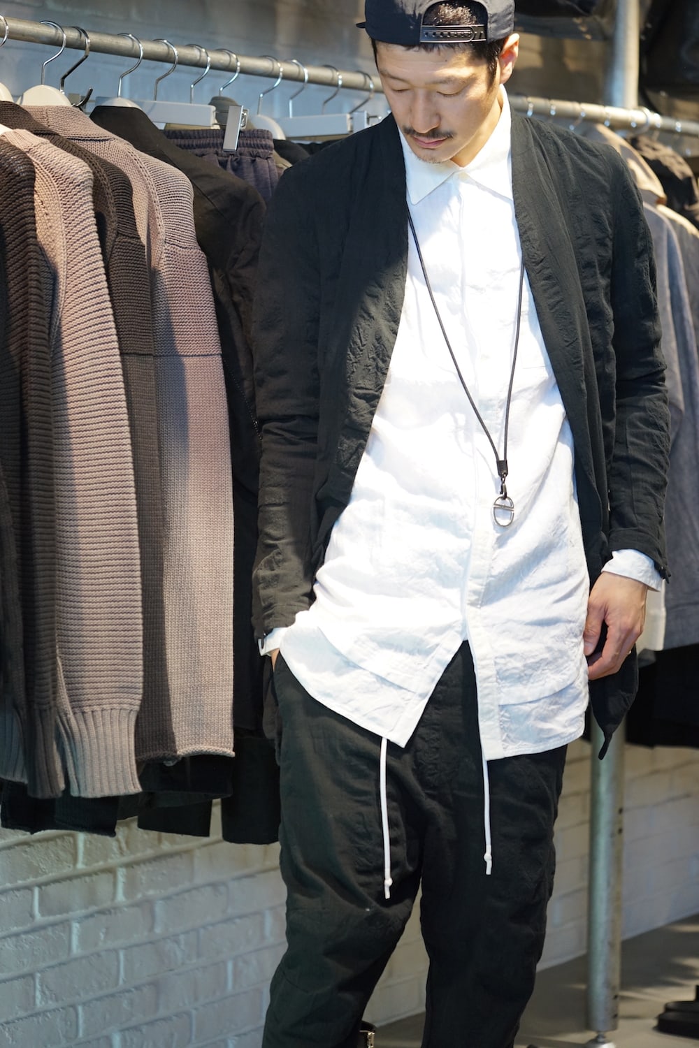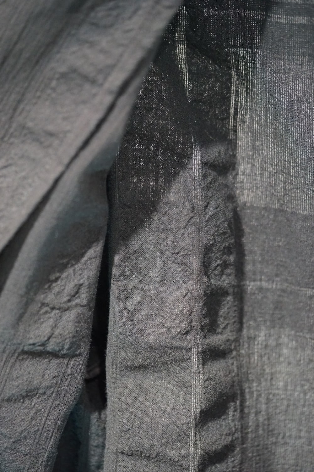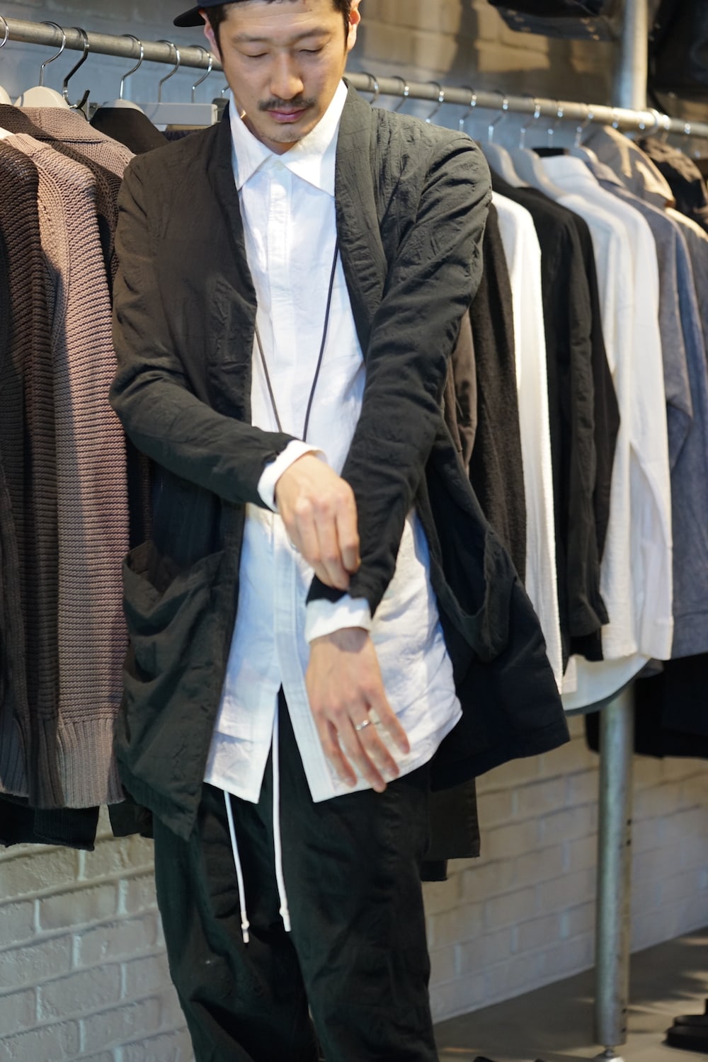 この素材はブランドが不定期ではありますが過去にも何度か出していた素材です。RIPVANWINKLEを昔から知る人なら見たことがある素材にはなるかと思いますが、表情が実に面白く、”チェック柄ほどカジュアルすぎず、BLACKほどクール過ぎないところがよい”、そんな着やすい雰囲気が漂います。