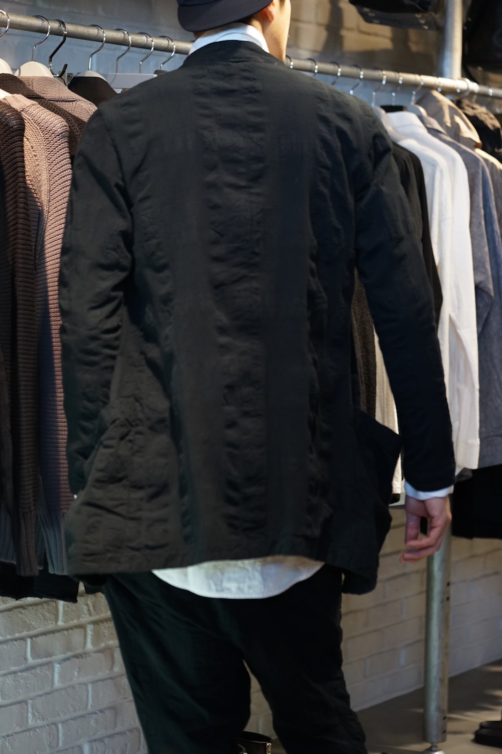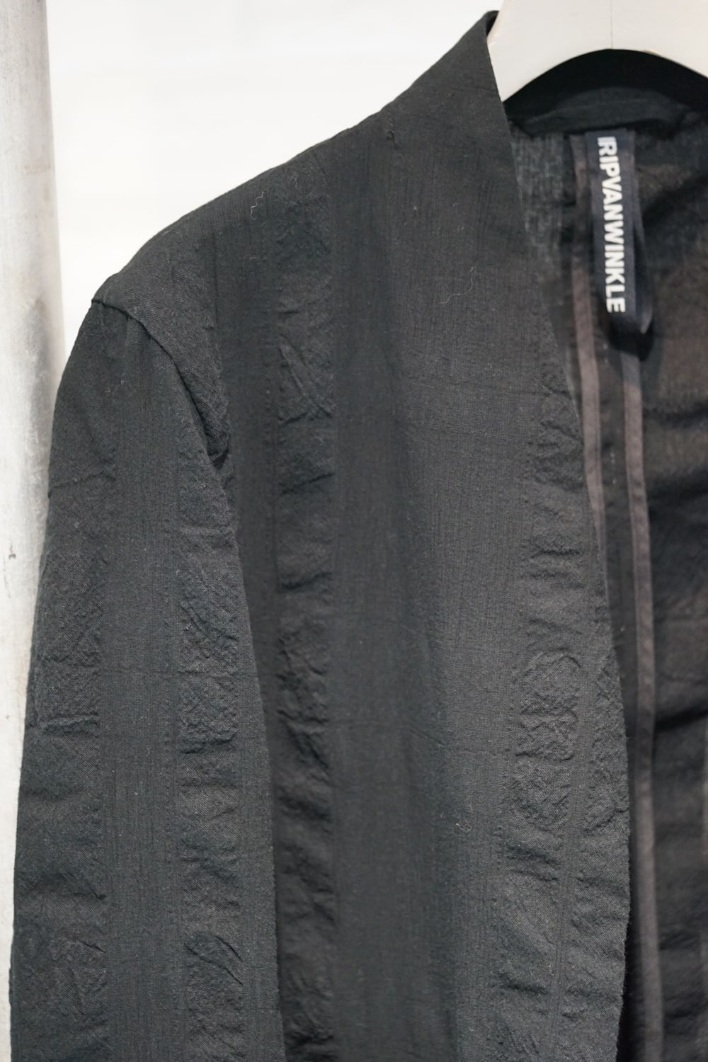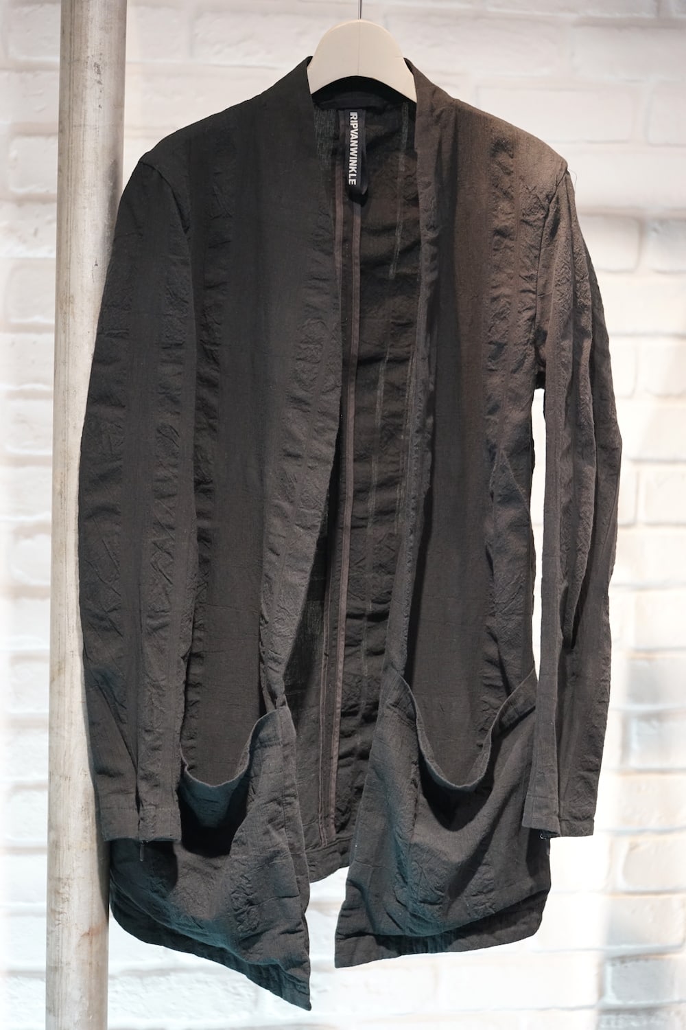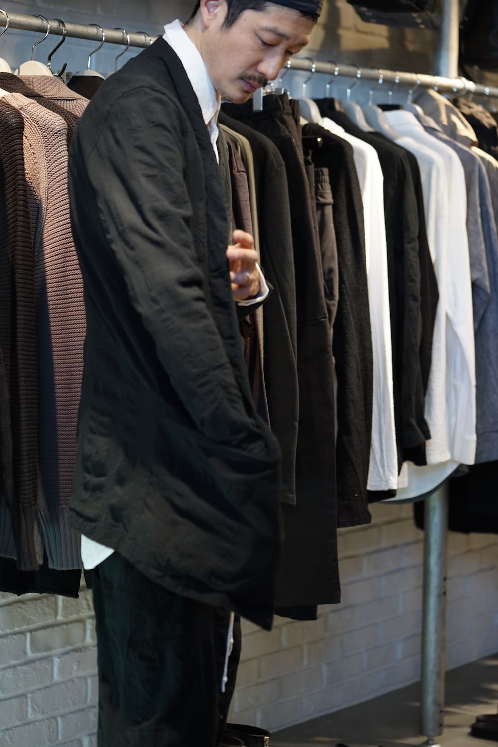 この素材はブランドが不定期ではありますが過去にも何度か出していた素材です。RIPVANWINKLEを昔から知る人なら見たことがある素材にはなるかと思いますが、表情が実に面白く、”チェック柄ほどカジュアルすぎず、BLACKほどクール過ぎないところがよい”、そんな着やすい雰囲気が漂います。