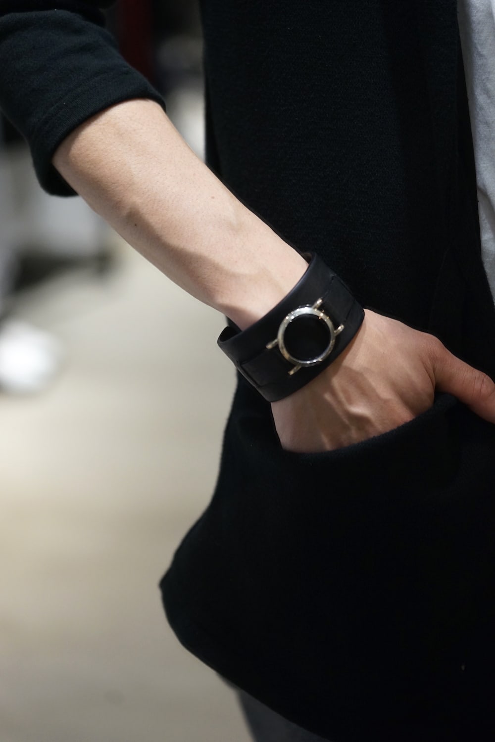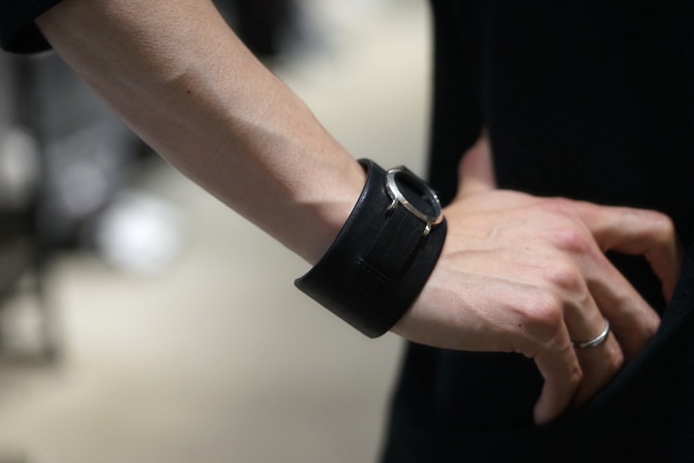 幅4.5cmのボリューム幅を持たせながら、シルバーを用いながら時計を彷彿とさせるデザインを使用し、男らしい革の表情と繊細な雰囲気を身にまとったコントラストが秀逸なデザインです。
