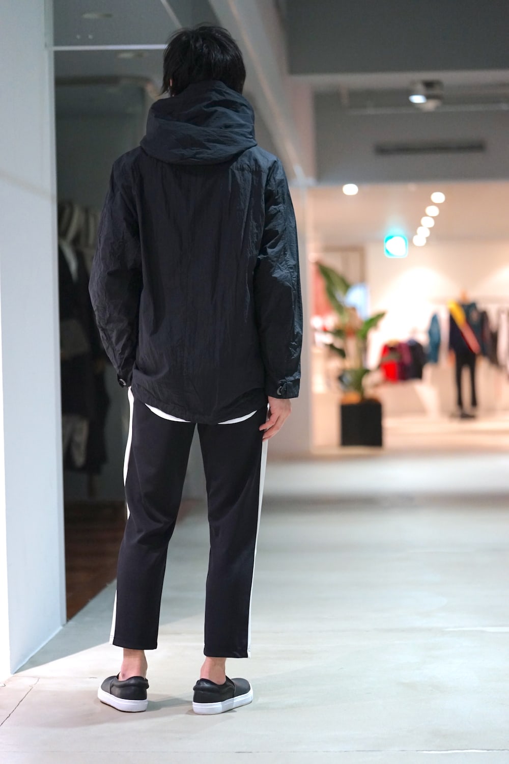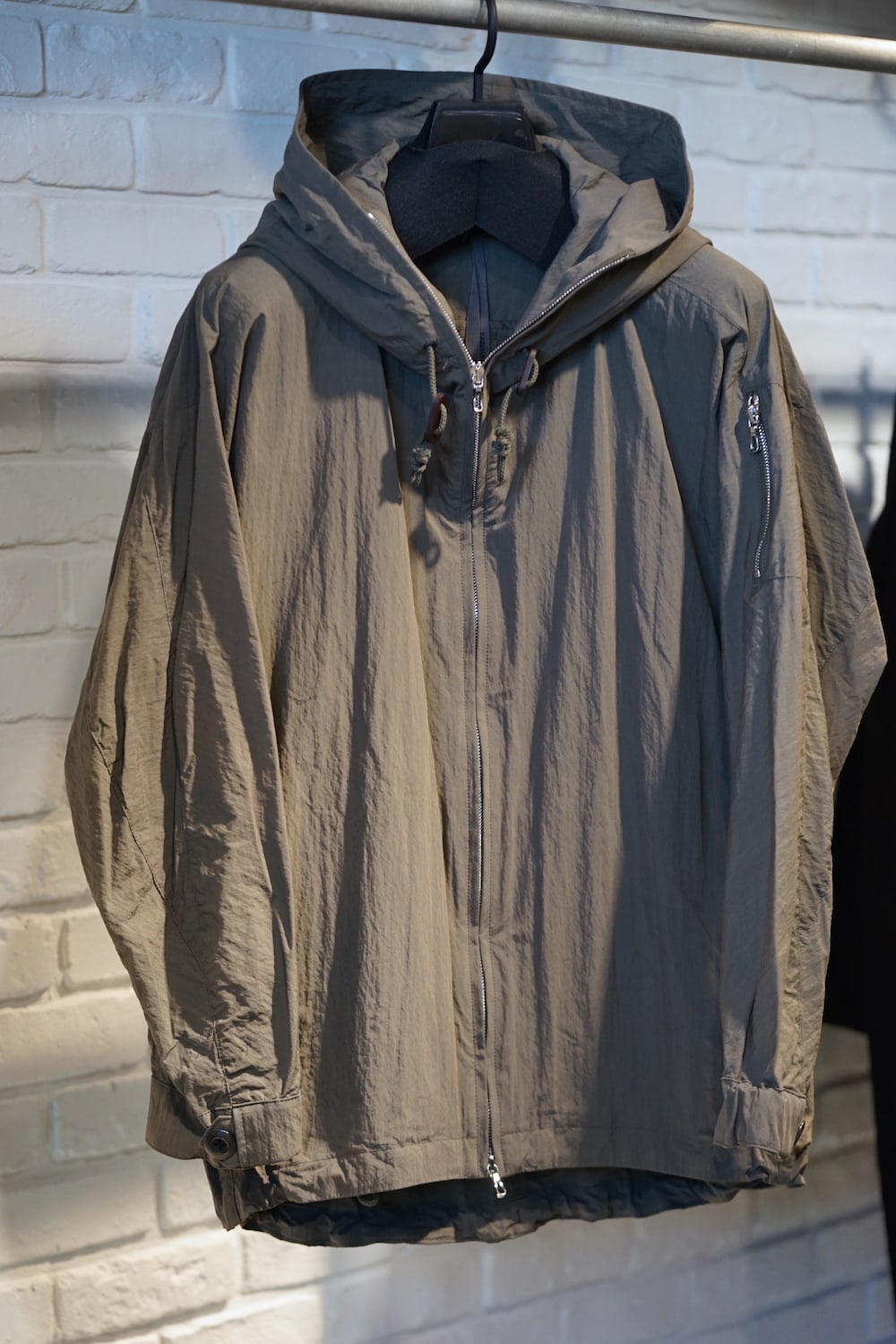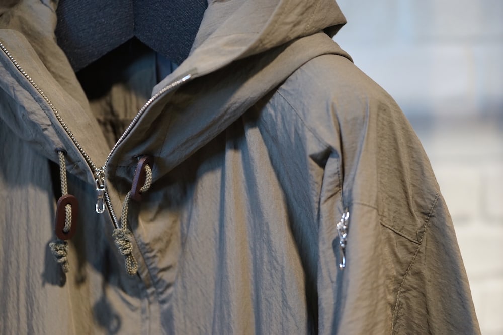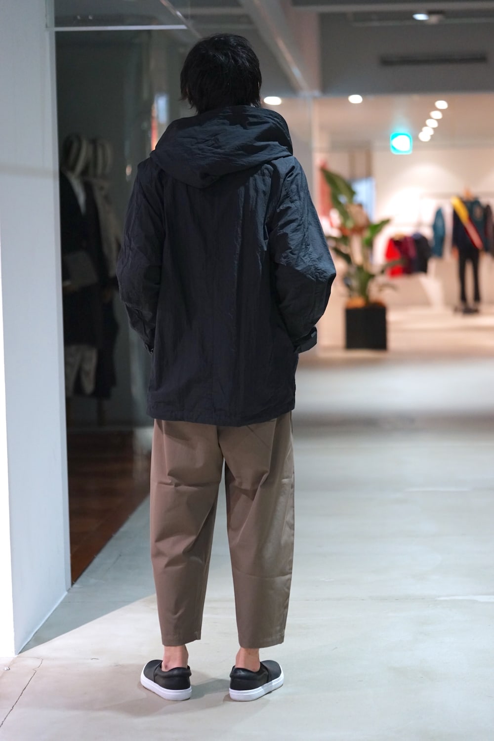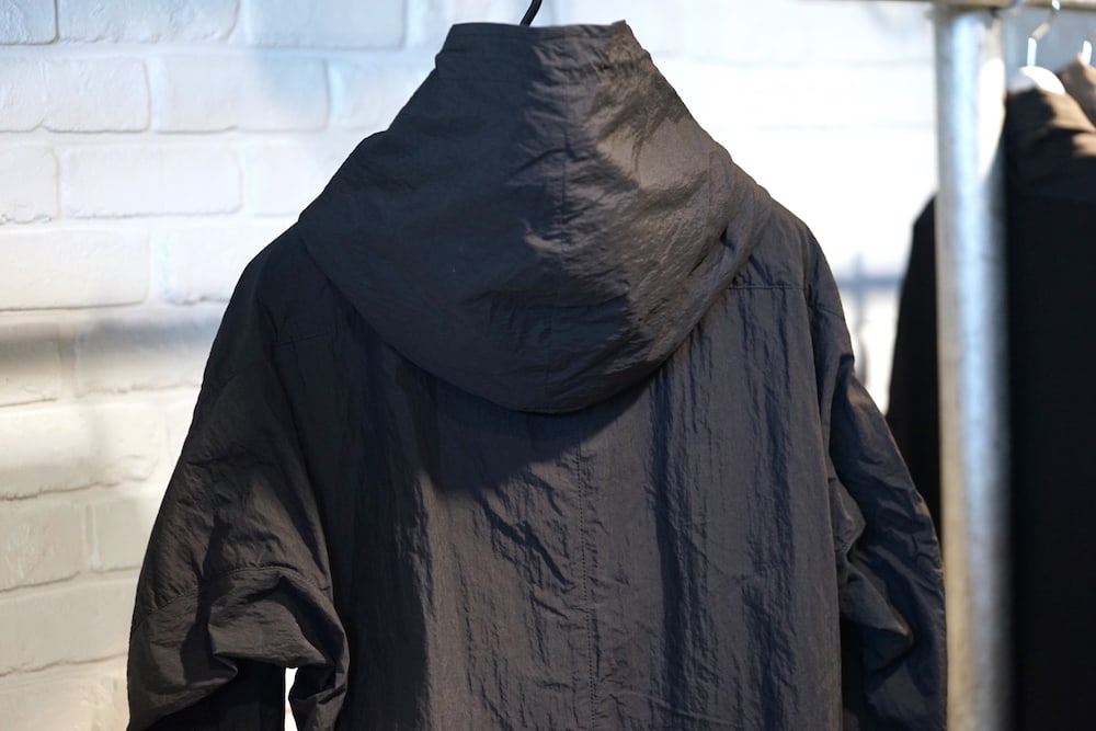 コットン/ナイロンを交織したタイプライター生地を使用したフーデッドハーフコートになります。