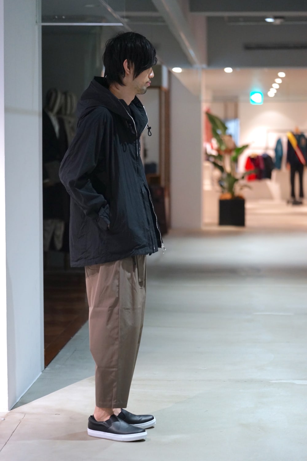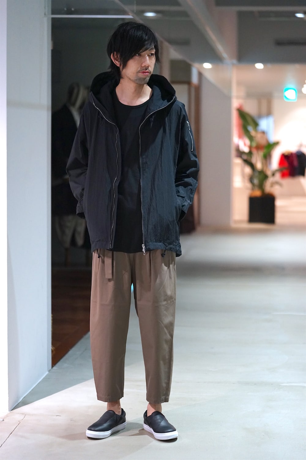 この「ベルト付ワイドテーパードパンツ」はKAZUYUKI KUMAGAIでは人気のパンツで、シーズンごとに素材を変えてリリースされている名物パンツなのですが、今シーズンも2生地ほどリリースされていますので、ぜひ1本はお試し頂きたいアイテムです。
