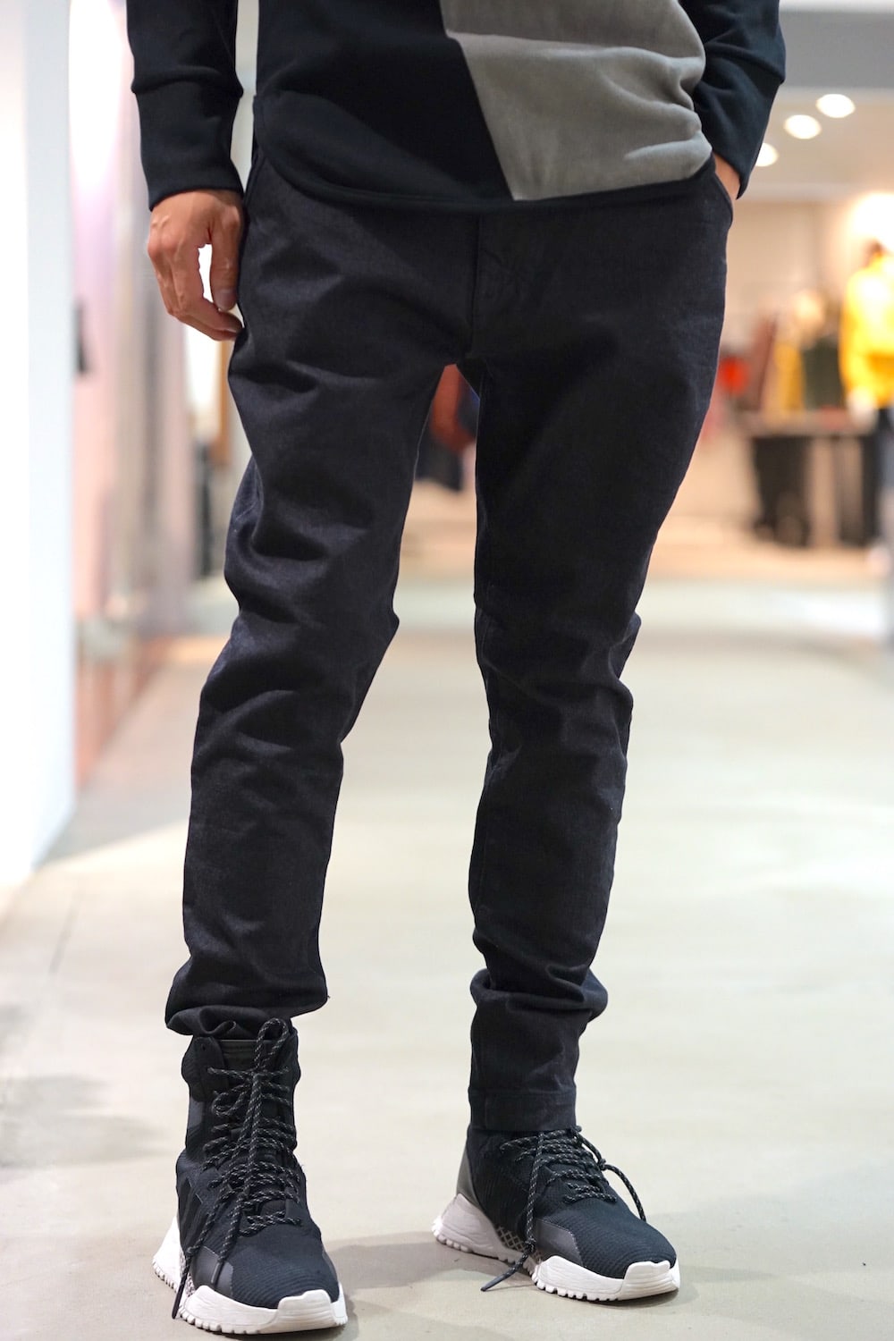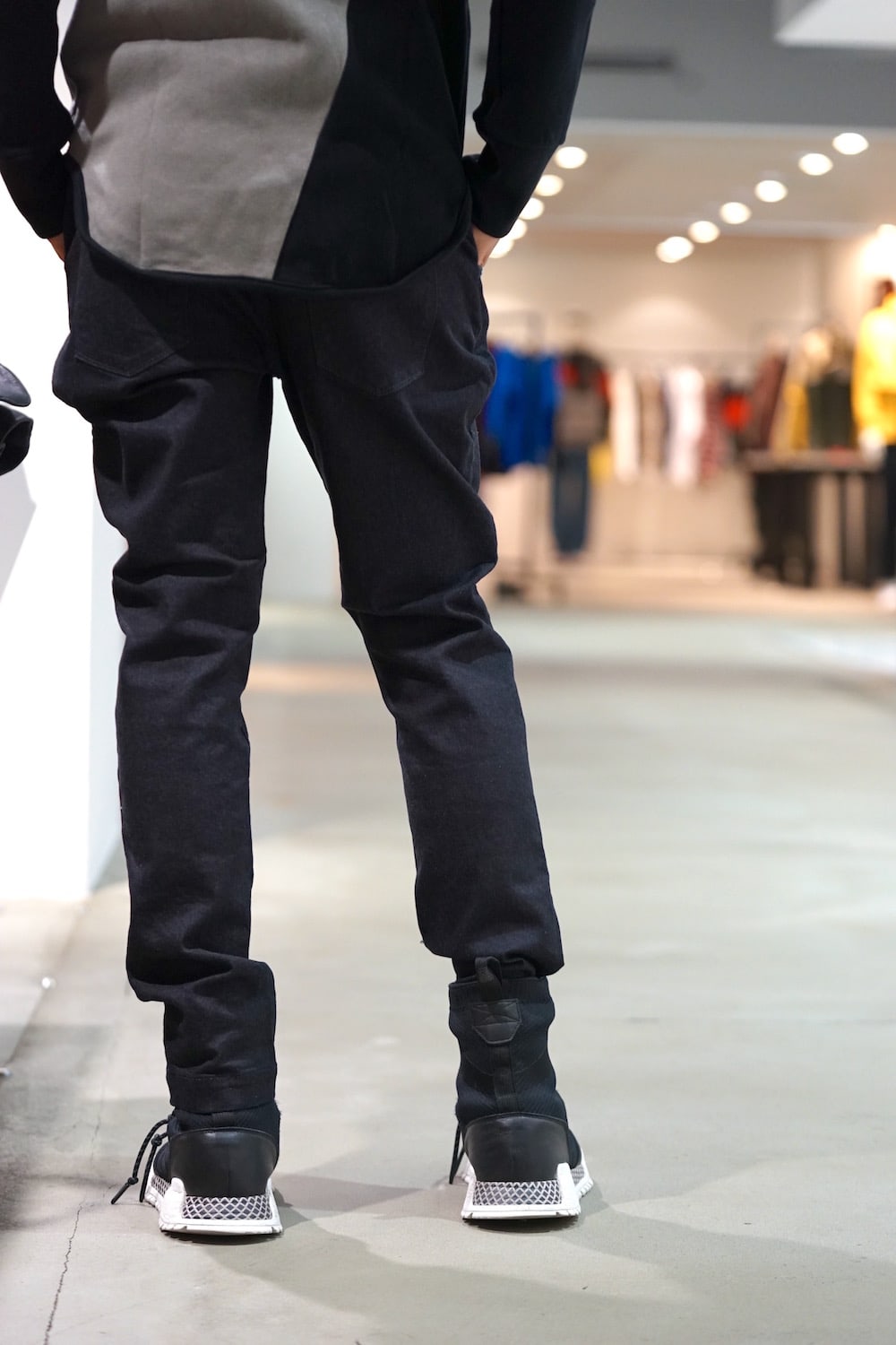 The face is made of ribs, the back has an indigo double face organization and the part where the skin touches the fabric has a smooth finish.