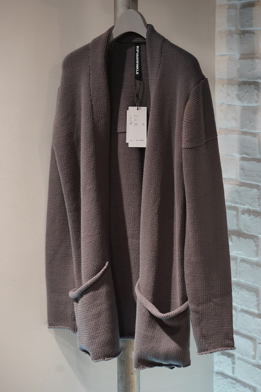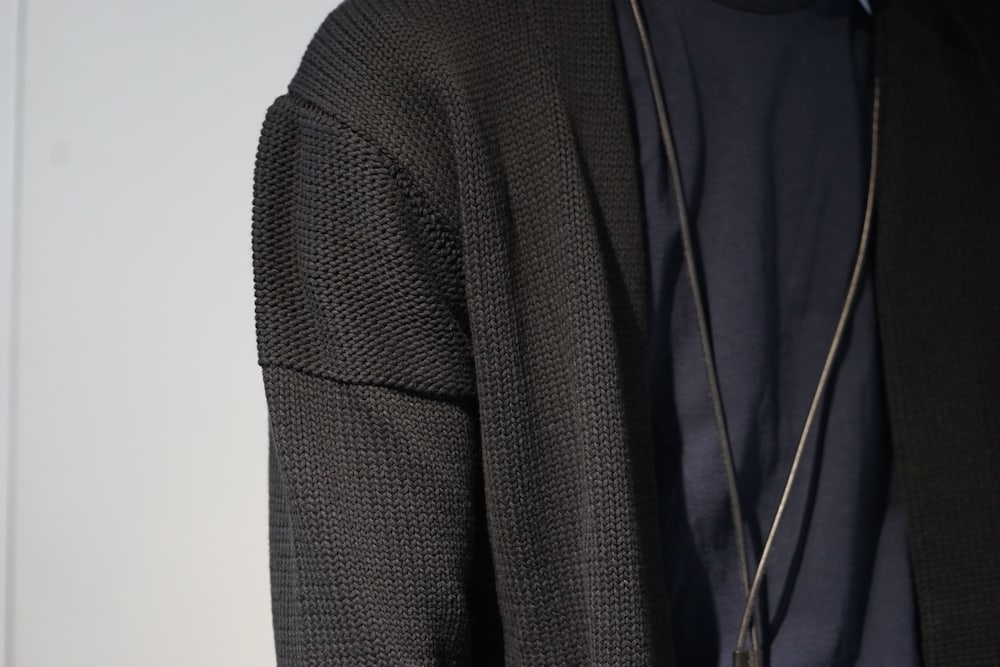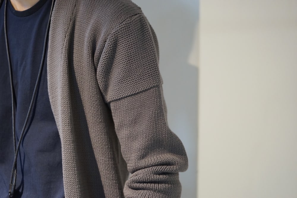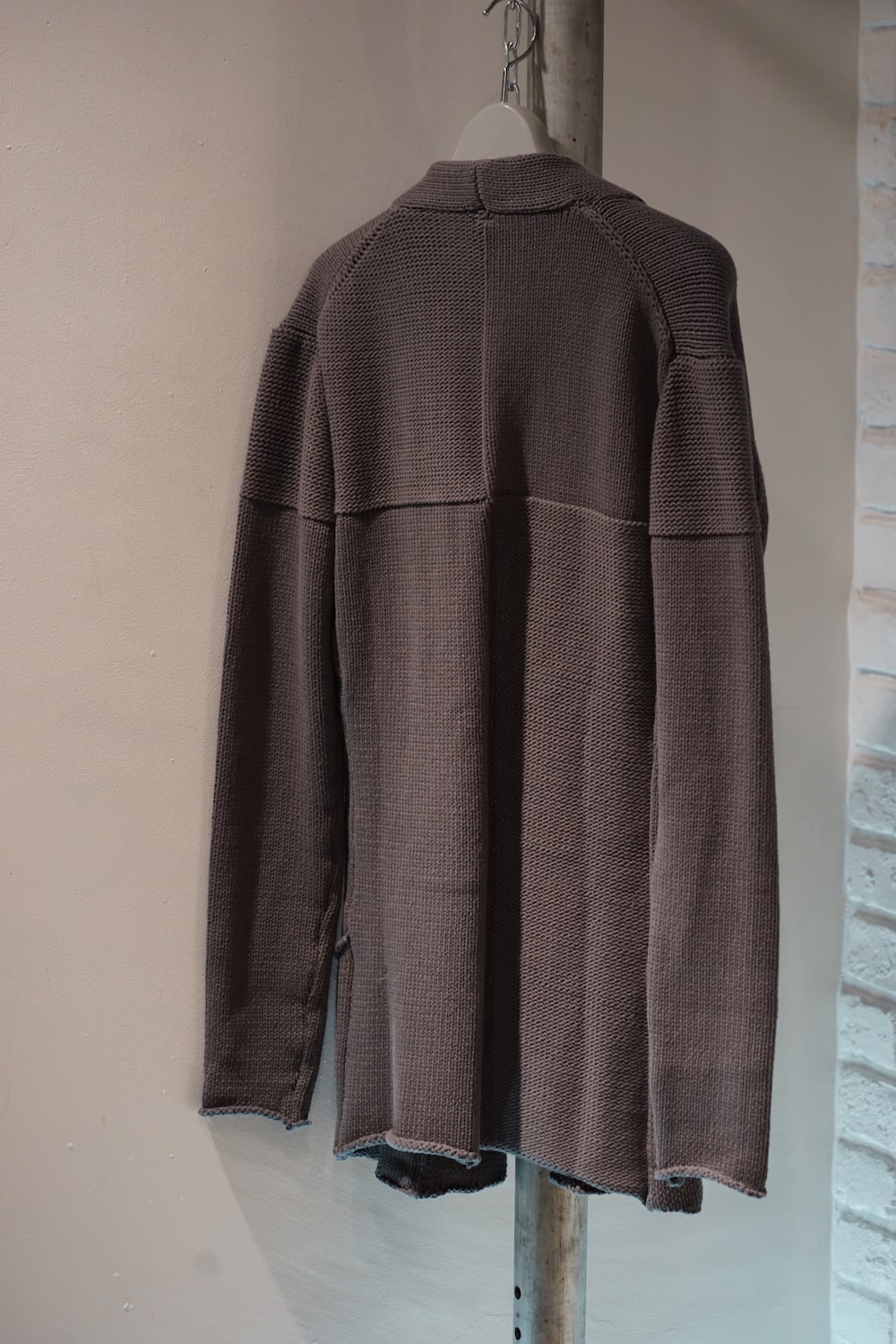ローゲージニットの重さを解消するため中空糸を使用したリバーカーデガン。天竺表と裏で4パターンで切り替えた後ろ身頃と、2パターンで切り替えた左右のアームが特徴のデザインが目を惹きます。