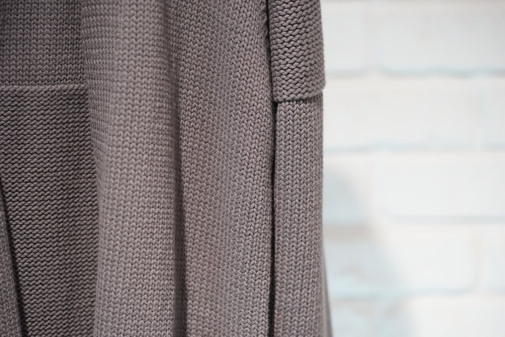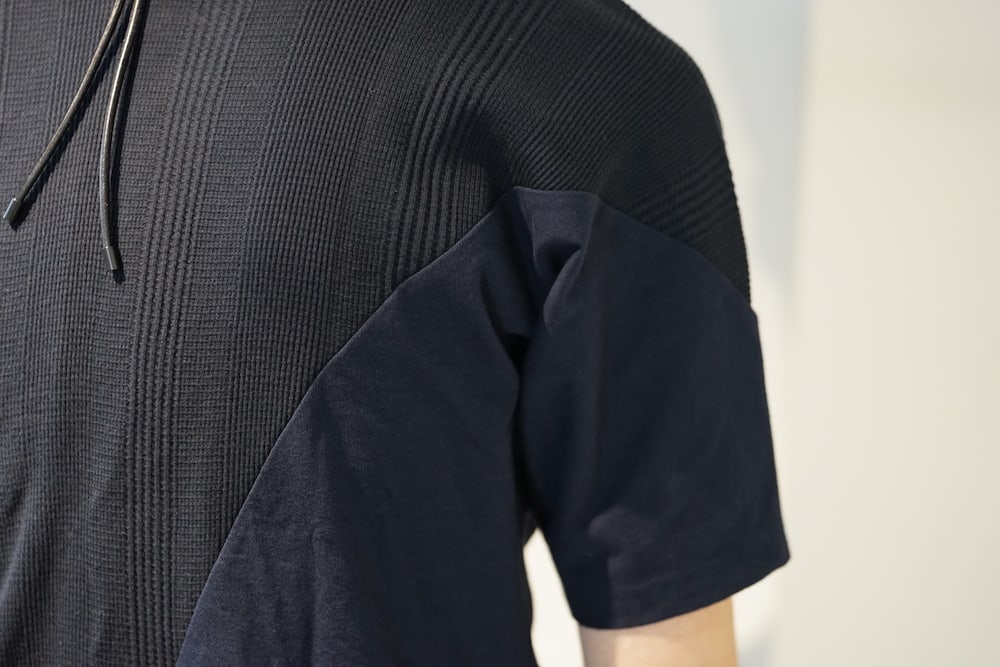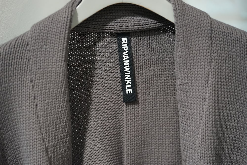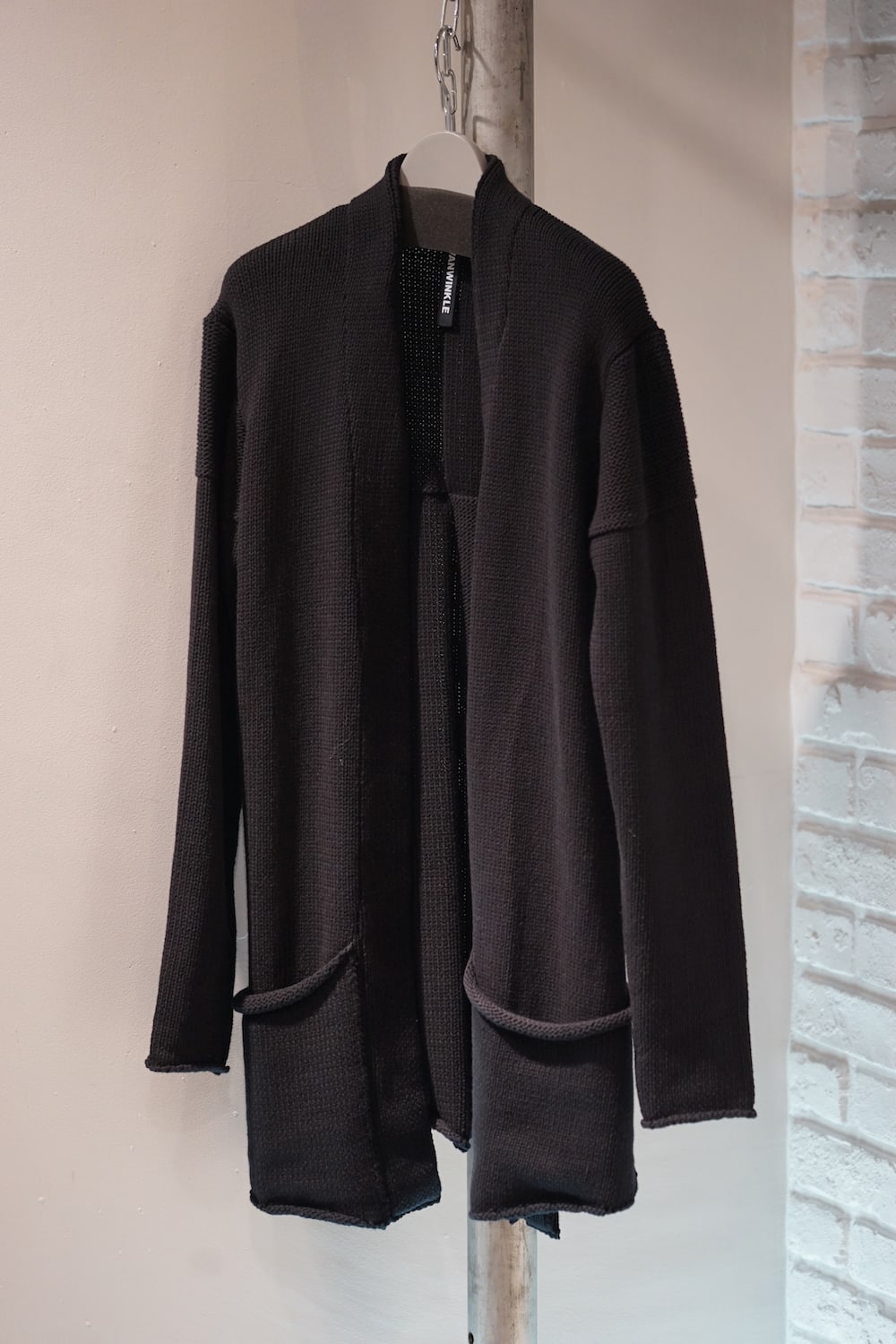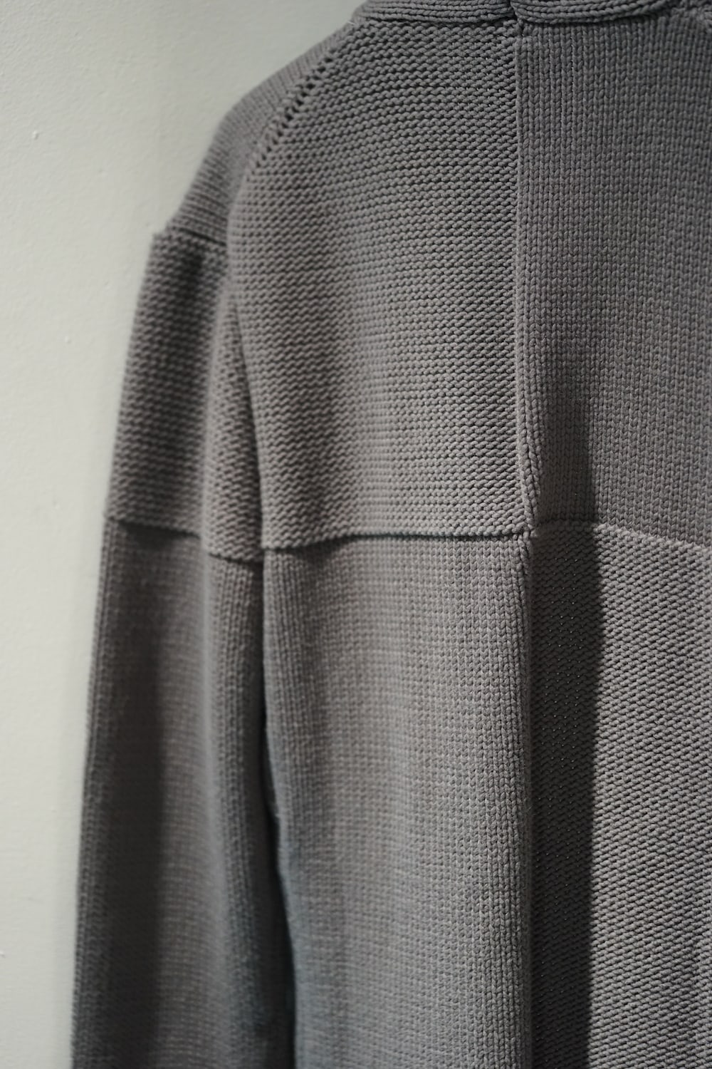 ローゲージニットの重さを解消するため中空糸を使用したリバーカーデガン。天竺表と裏で4パターンで切り替えた後ろ身頃と、2パターンで切り替えた左右のアームが特徴のデザインが目を惹きます。