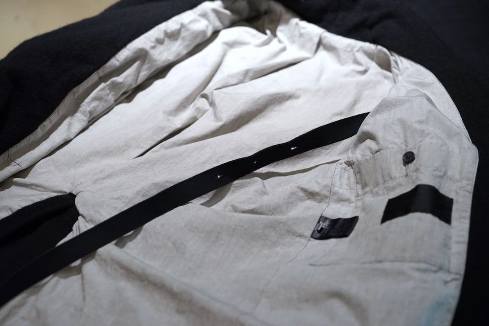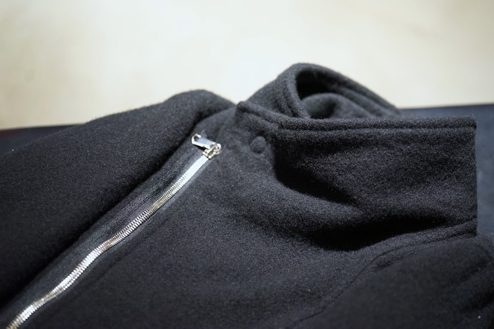 It is a coat that is made of light weight and soft melton. It has a slash pocket on the front body pale line. There are also fatteners applied to the large pockets and cuffs across the front and back body.