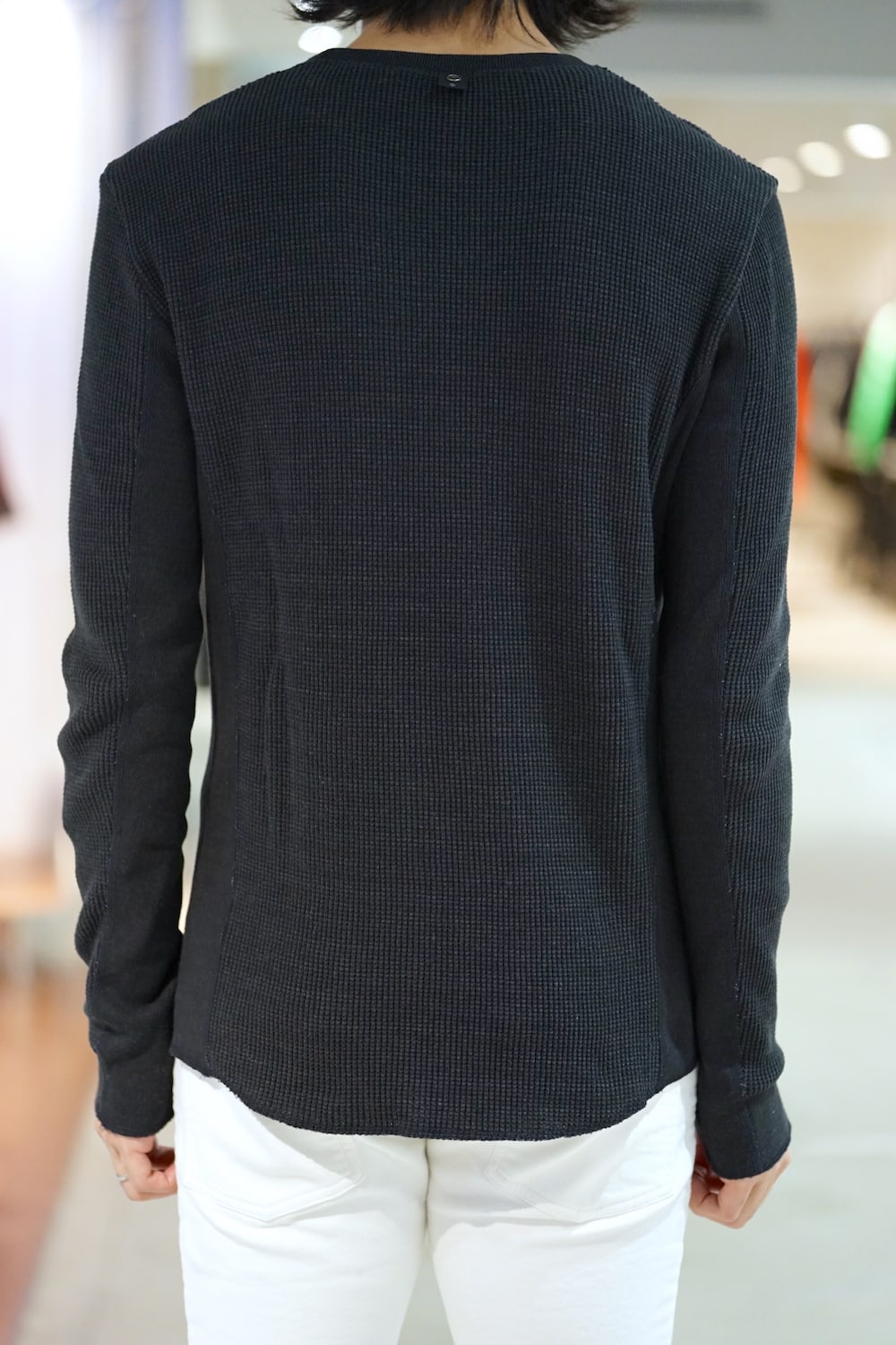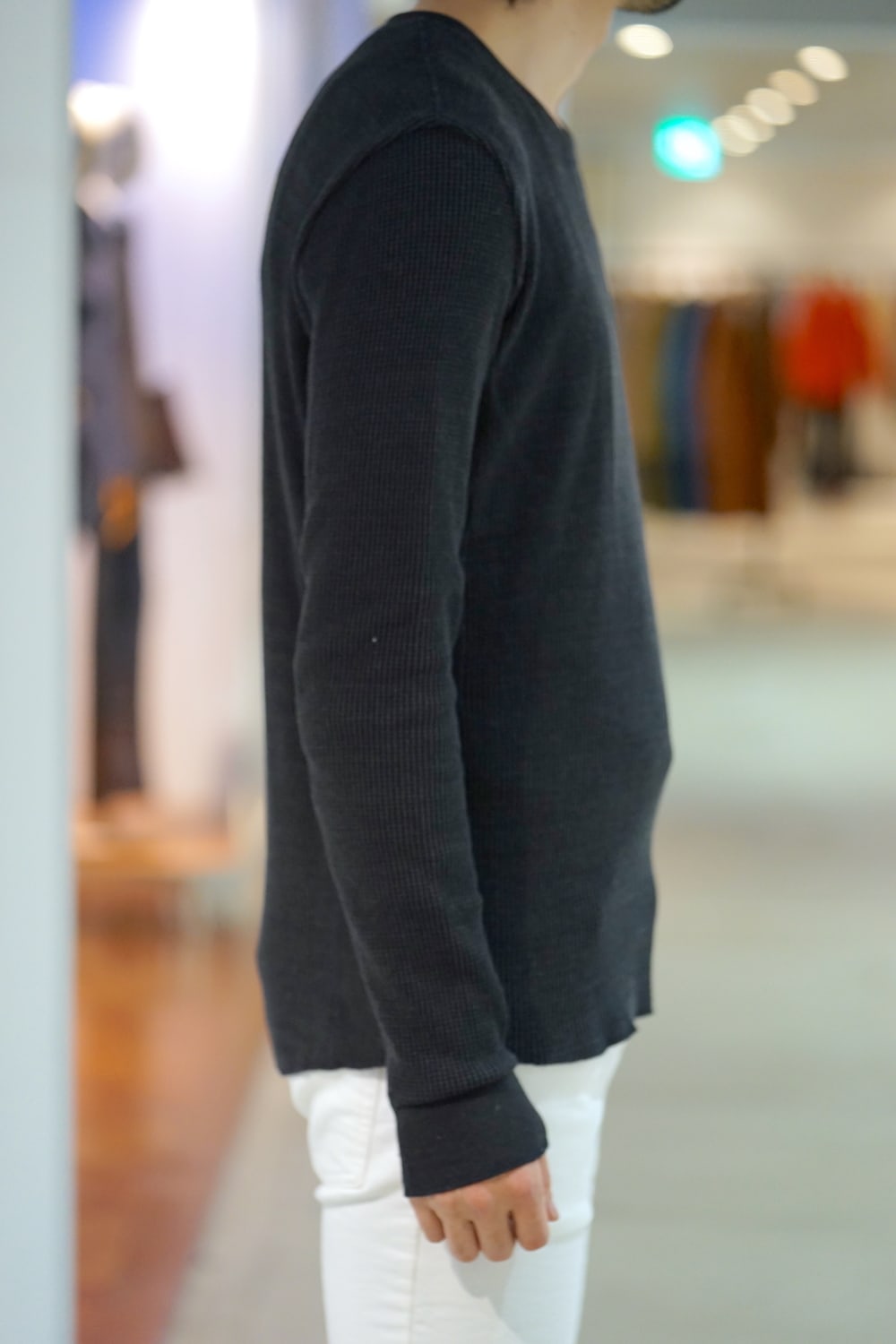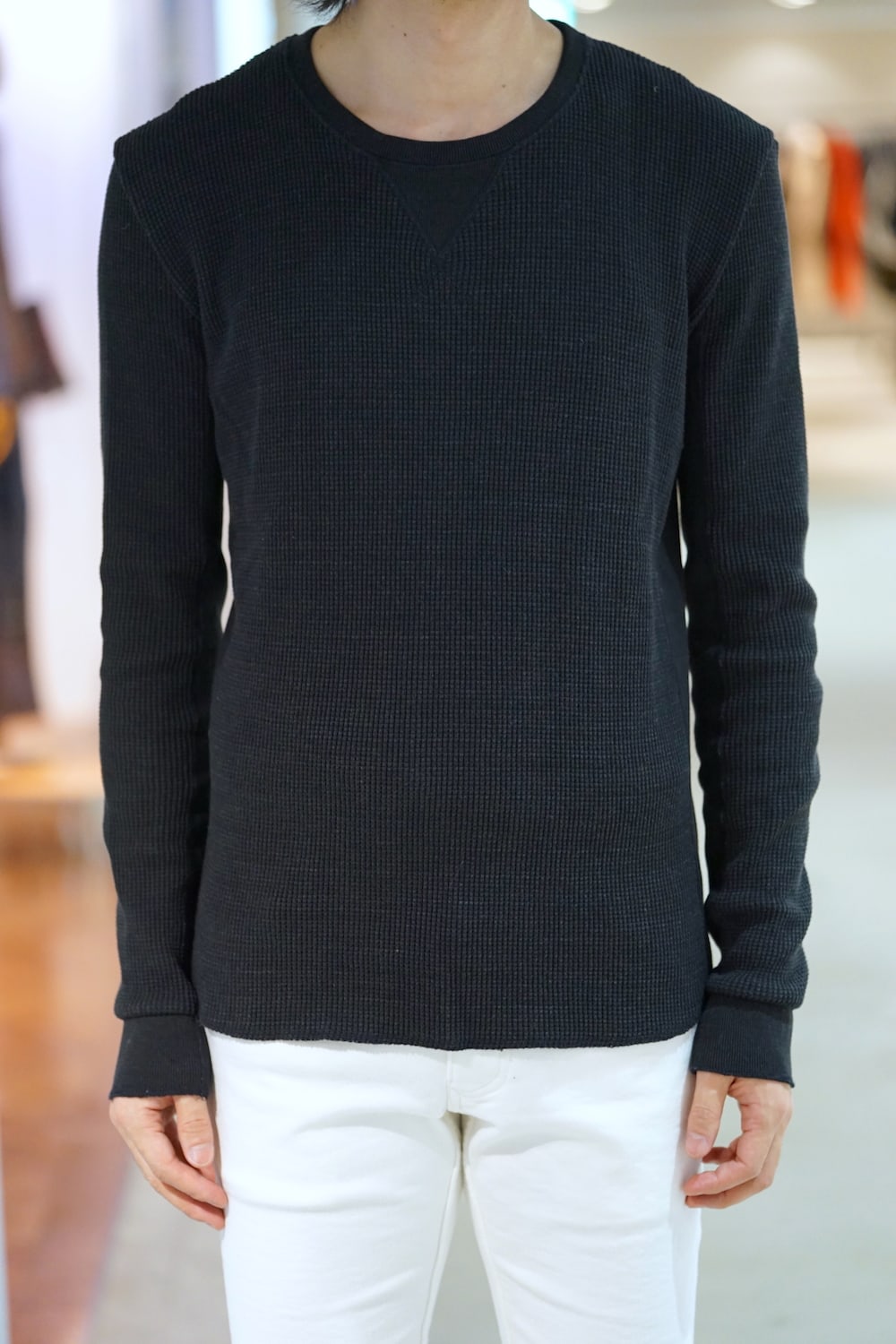 合わせたのはスモーキーがかった色合いが特徴の度詰めのワッフルカットソーになります。
