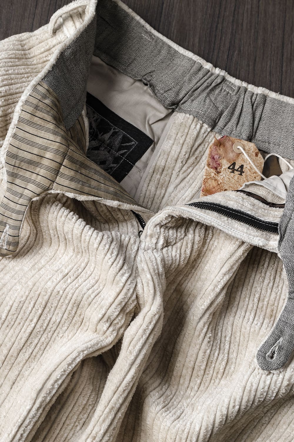These 2 tuck wide pants feature a square panel silhouette. This is a full-length type pants made of the same material that was used in the 21 -22 AW collection movie. The main fabric, corduroy, is made of cotton mixed with 4% of the main metal fiber. Although the fabric is very thick, metal fiber is often used to create unique wrinkles that take advantage of the shape memory of the fiber. The reason why the material is mixed is to maintain the softness unique to cotton and to express the texture as if the core is still there. The front part of the waist has a unique detachable mechanism that can be carried out symmetrically.