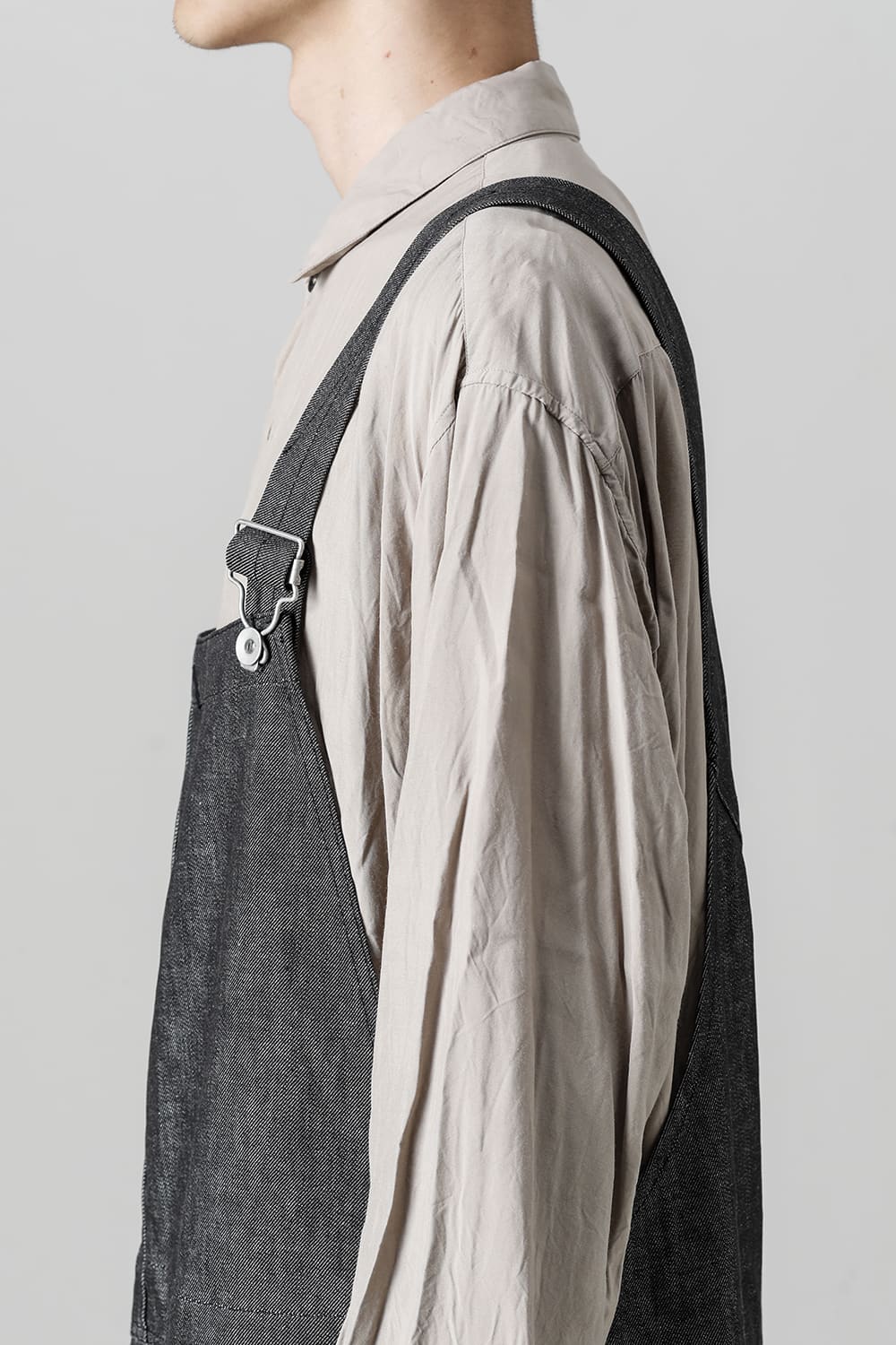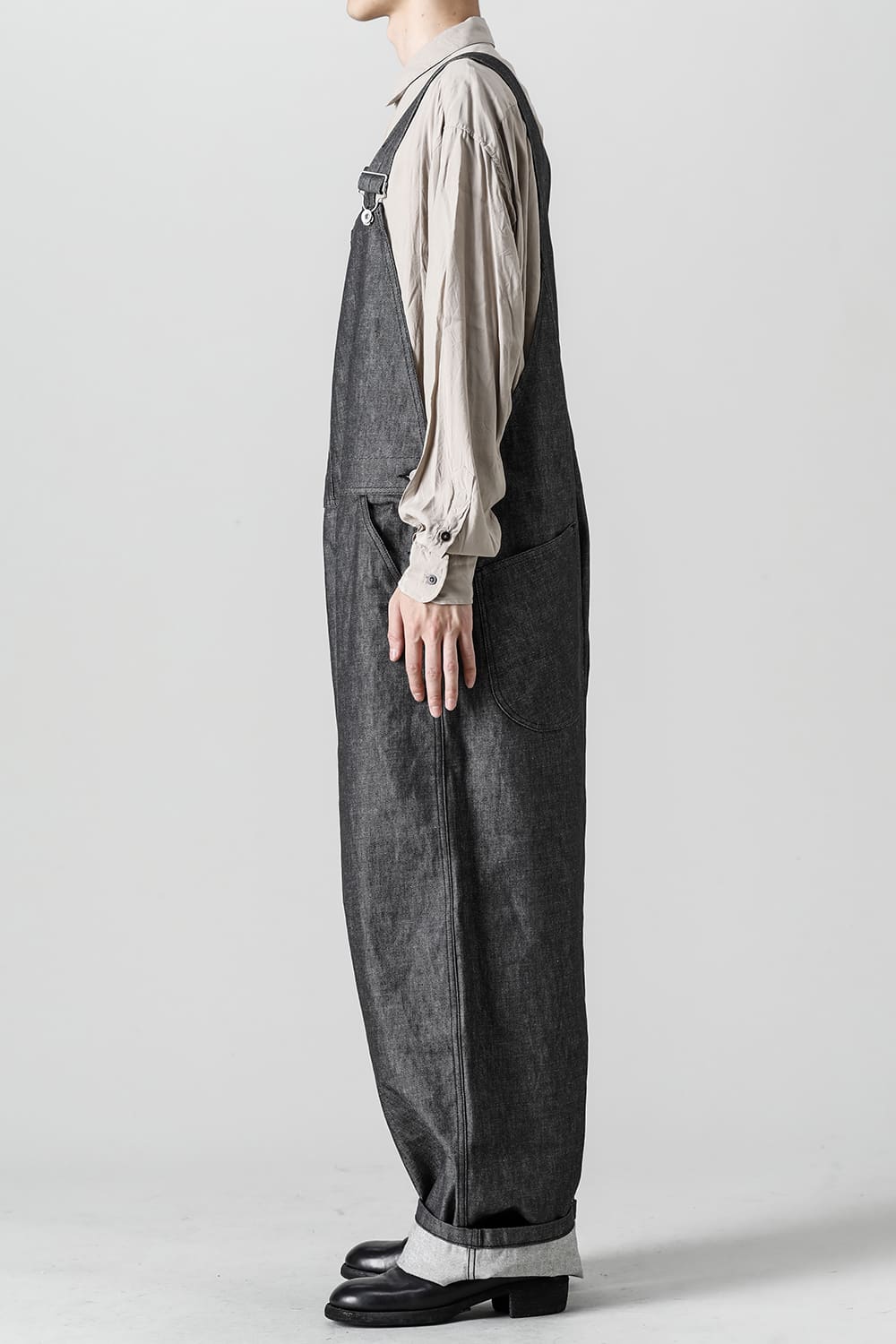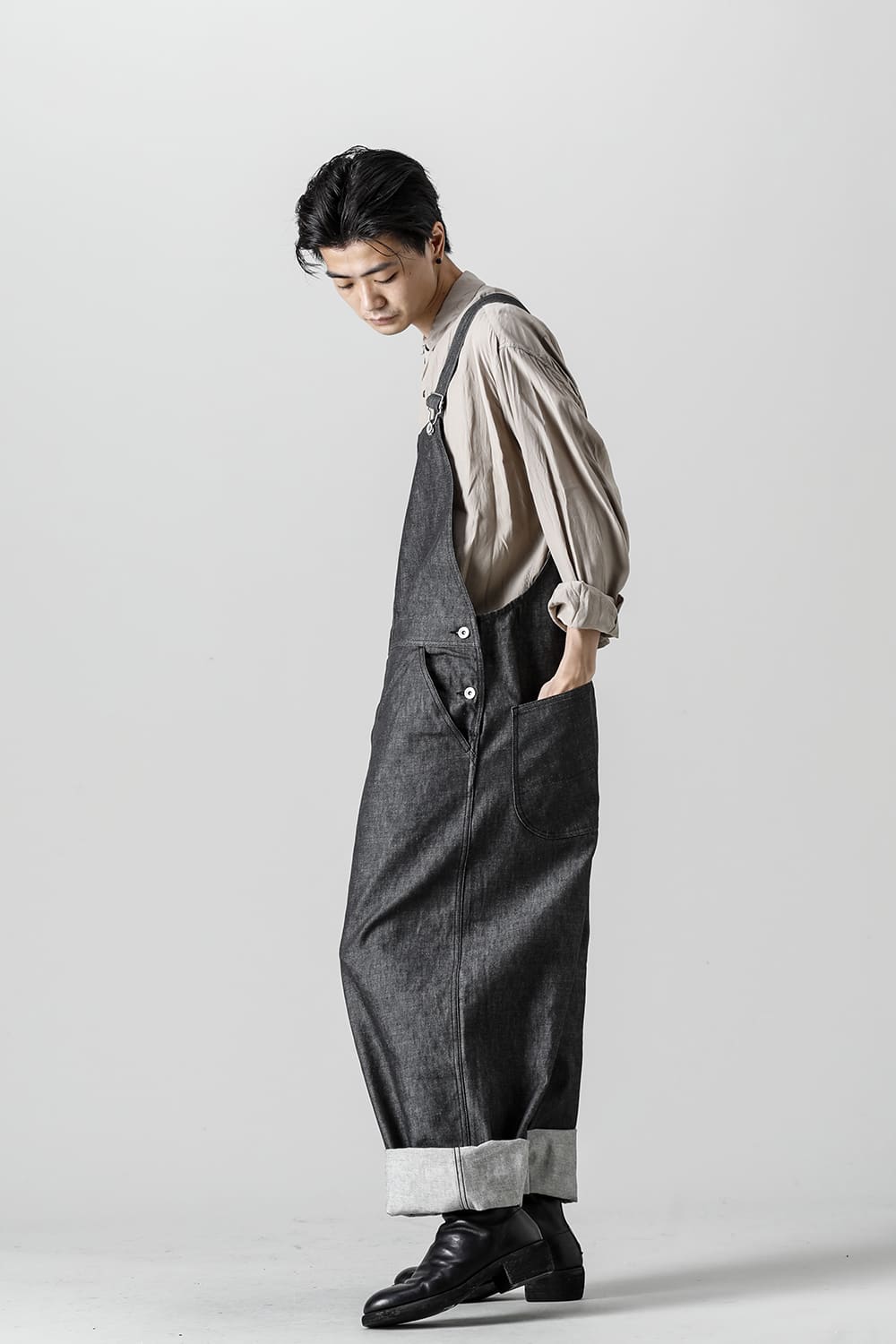 Oversized overalls. While firmly feeding back the details of conventional overalls, elements of low crotch and oversized mode fashion are embedded. These overalls are a clear distinction from the workwear overalls. The material used is from Okayama, famous for its denim fabric. The 10 oz. light-weight fabric has a bouncy feel that accentuates the styling beautifully.