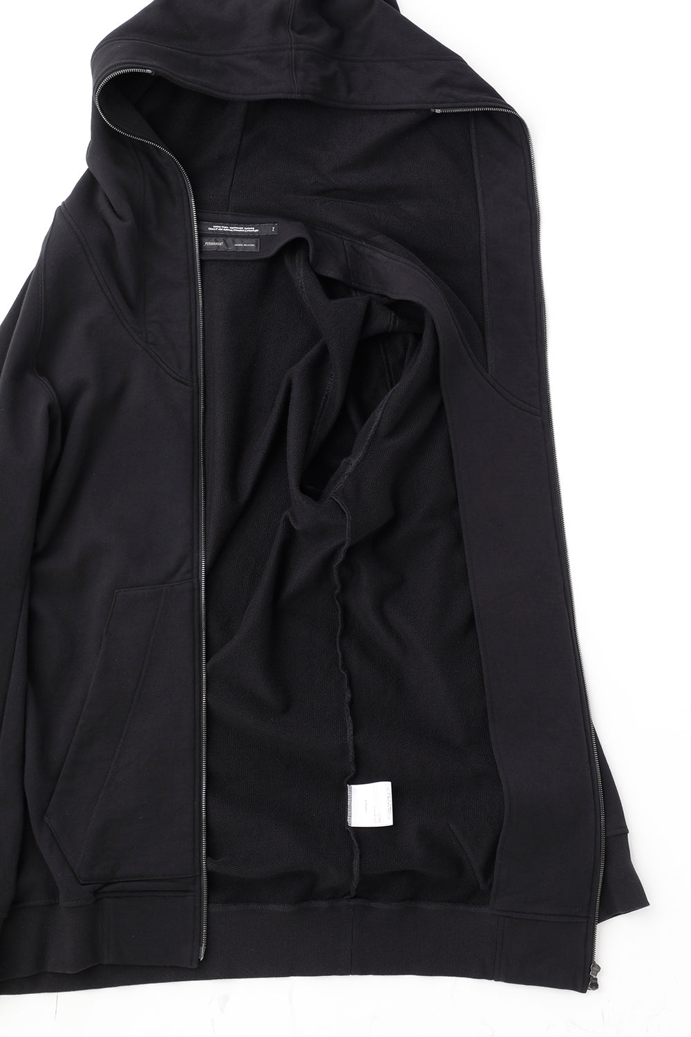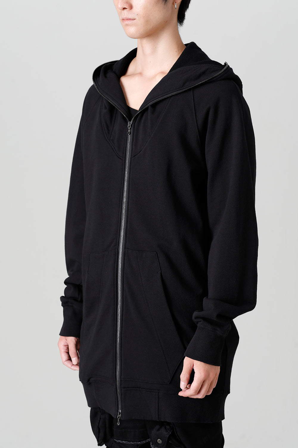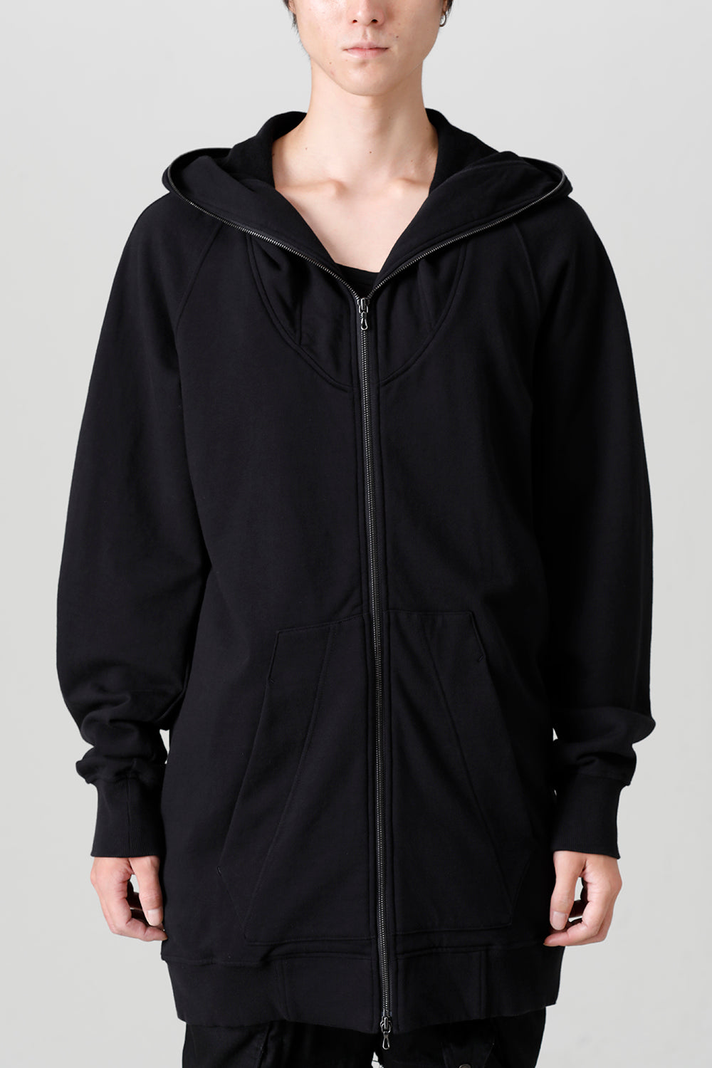 The zipper is placed from the hem to halfway up the hood, allowing the wearer to enjoy styling with volume around the neck.
