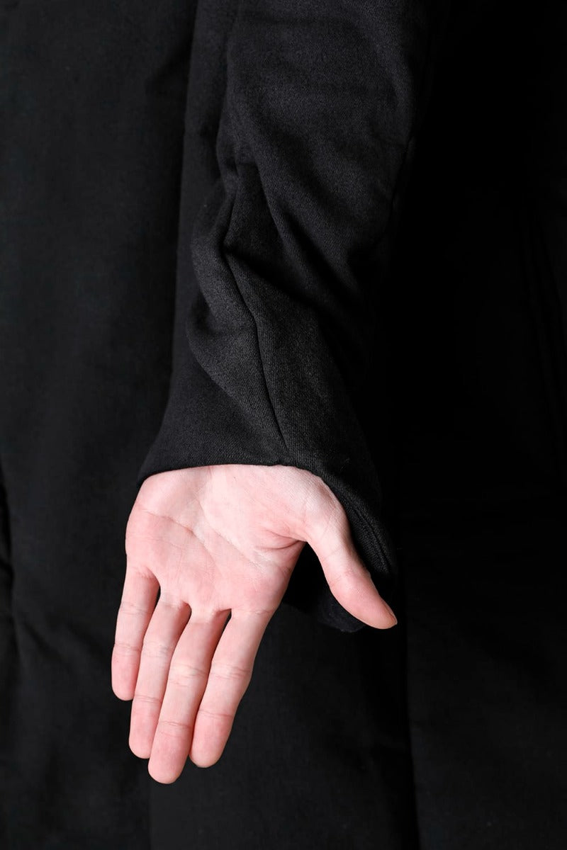 One of the standout pieces in JULIUS' 23-24FW collection themed [elytra;], this long coat is rich in contemporary flair. The top of the hood features shell parts, and intricate seam designs are evident throughout the garment. The cuffs are designed in a pattern that covers the back of the hands for added sophistication. A surface coating on the fabric lends a decadent feel to the piece. Additionally, the coat is generously padded, providing ample warmth for winter wear.
