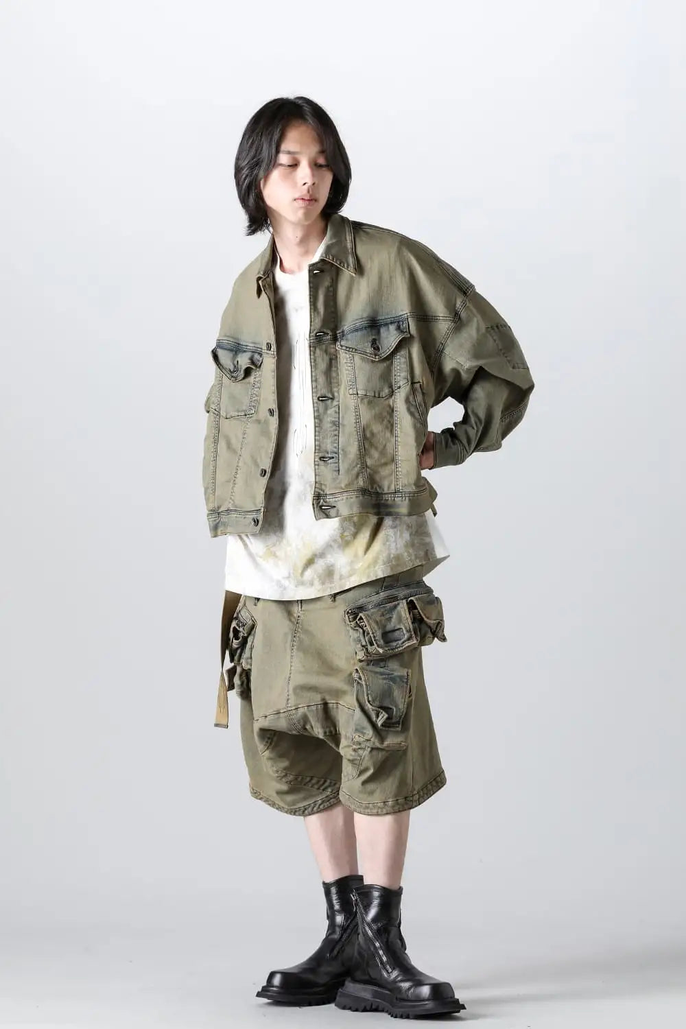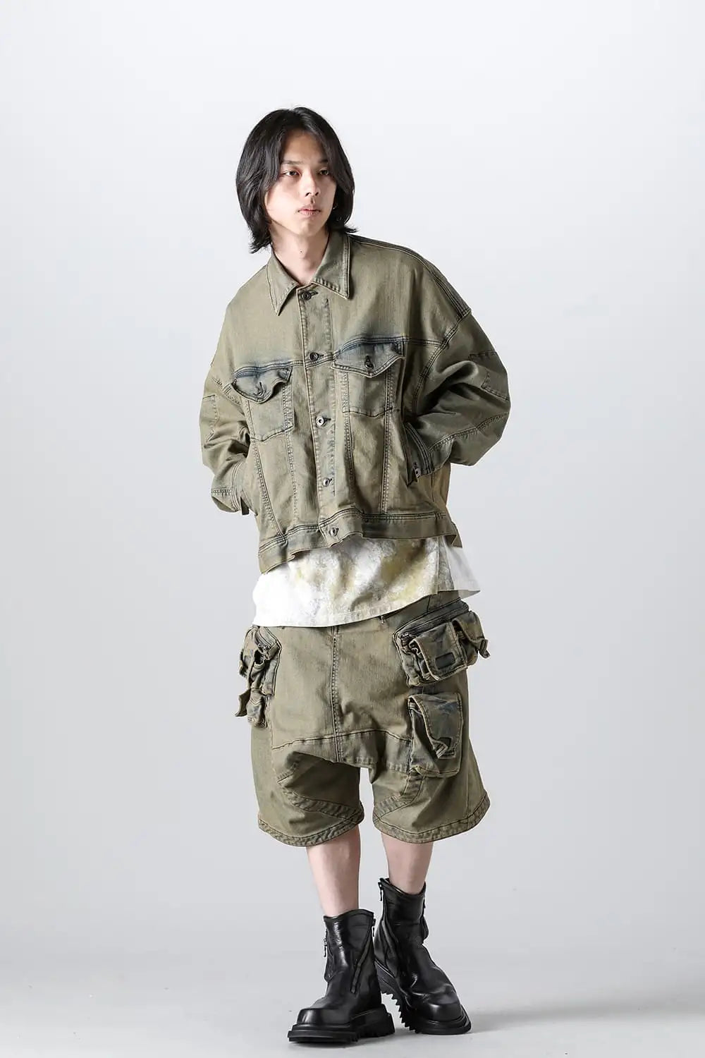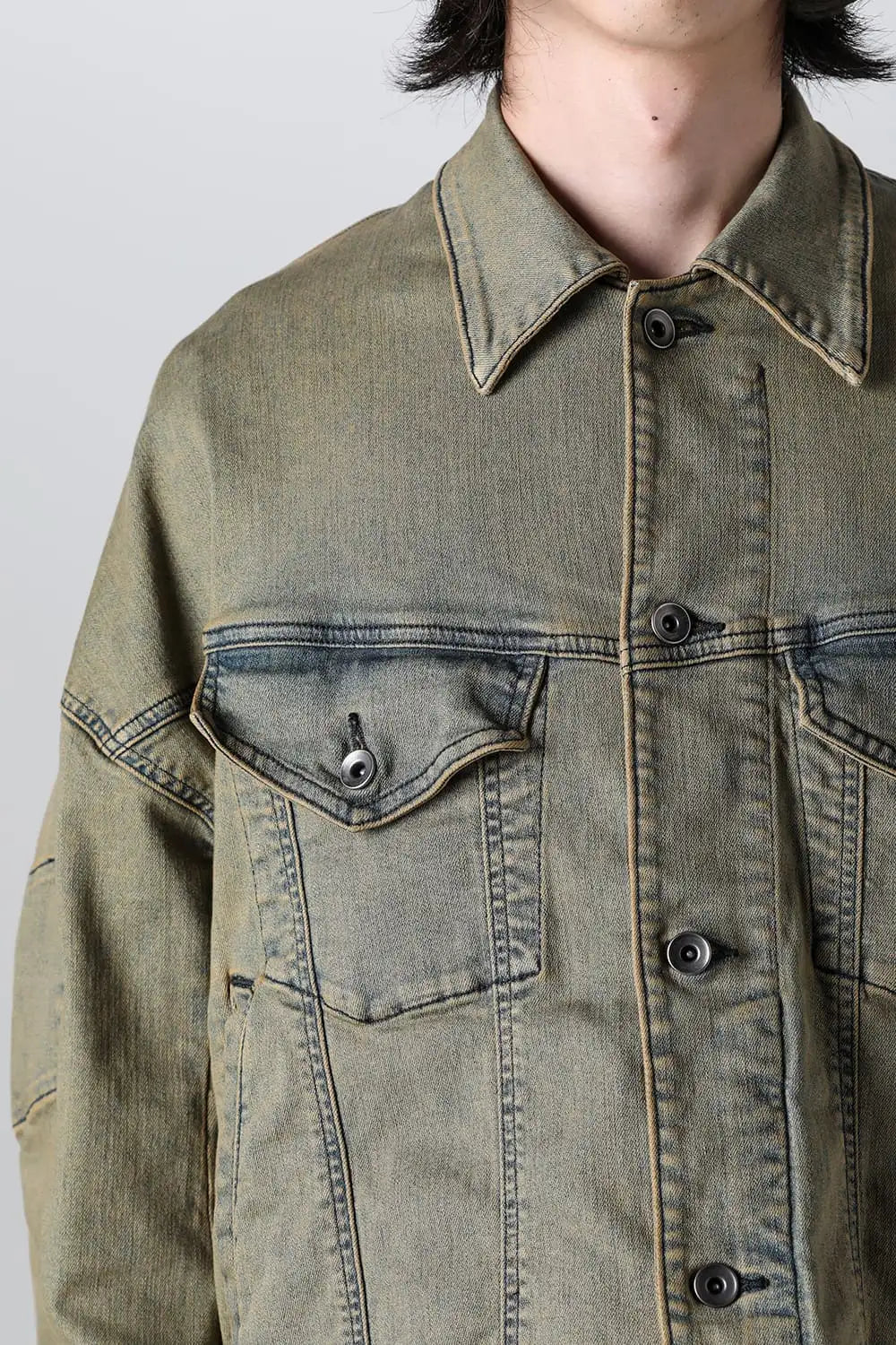 This is a denim jacket crafted from 10.5oz stretch denim that has been treated with an indigo wash and distressing.