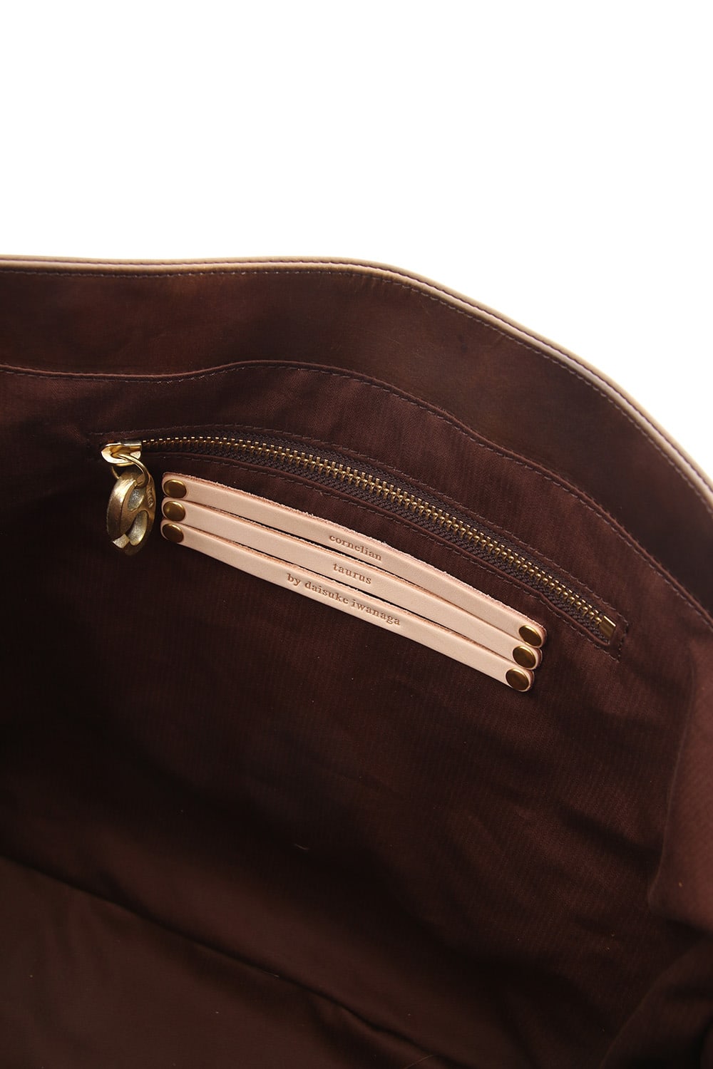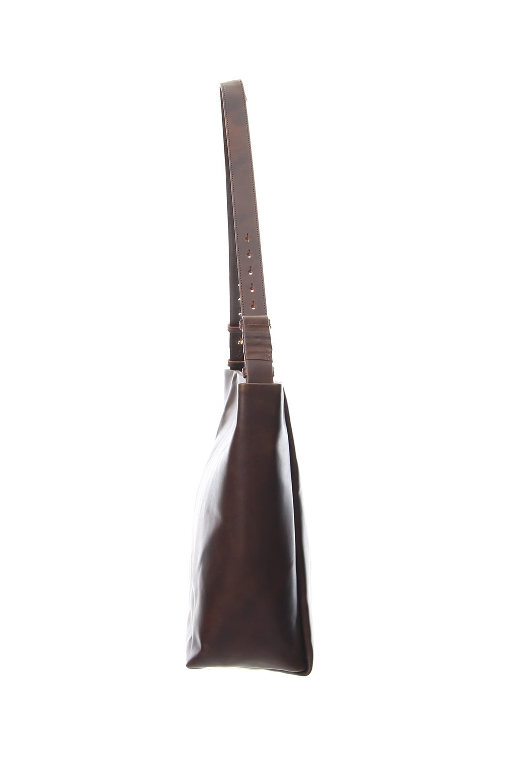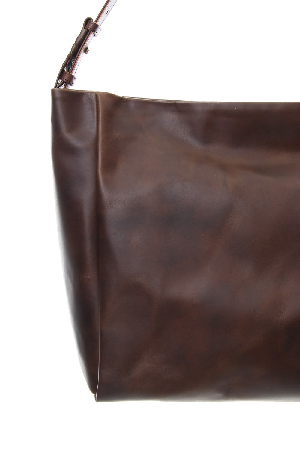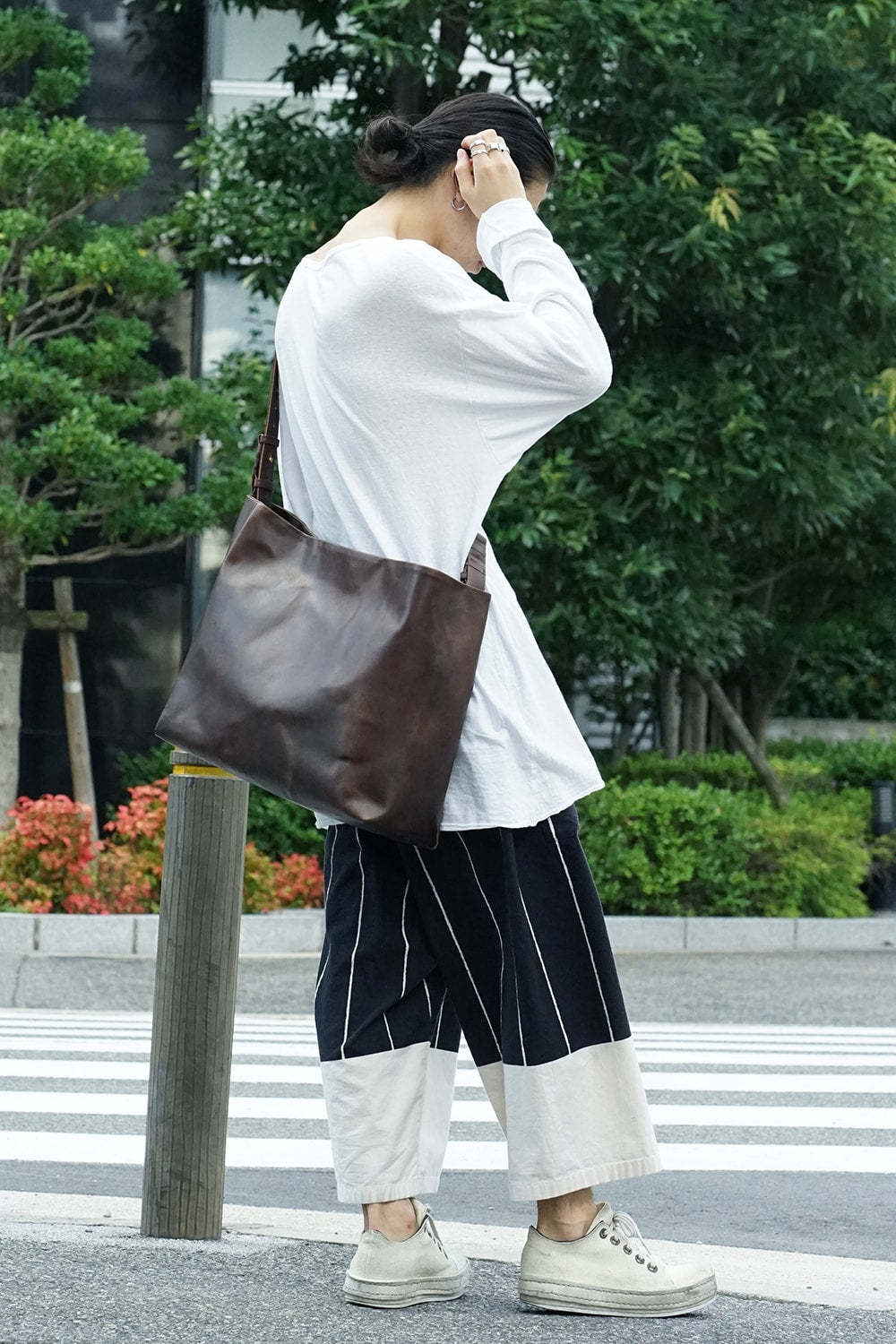 The new work "Hand piece big shoulder" was announced in the collection theme of "manual work and light”. The theme is to not have any metal fittings as much as possible with one piece, giving a minimal but still expressive bag. It is possible to open and close by the magnet at the opening. When diagonally hung, it has a beautiful shape that integrates with the style along the body. The part along the body has been treated so that seams do not hit which is the brands’s attention to detail and care. The material is a hand brown of Shave Steer which was newly added from 18-19 AW. The steer has a sense of texture like nubuck as the silver was shaved off a little; it was hand crafted by hand painting to dark brown to and then made into a foundation of a distinctive expression. In addition, by dyeing a thin blanc thinner than the hand painted, it gave depth to the material. It is leather which you can enjoy for a long time with the beautiful changes.