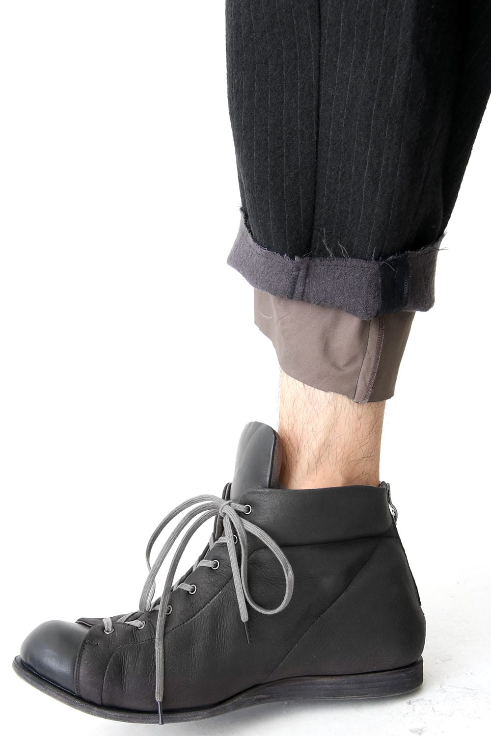 These wide silhouette baggy pants dual-layered fabric front is black, the reverse has a greyish color for a stripe fabric. By taking the front tucks, it makes a slightly tapered and sharp silhouette.