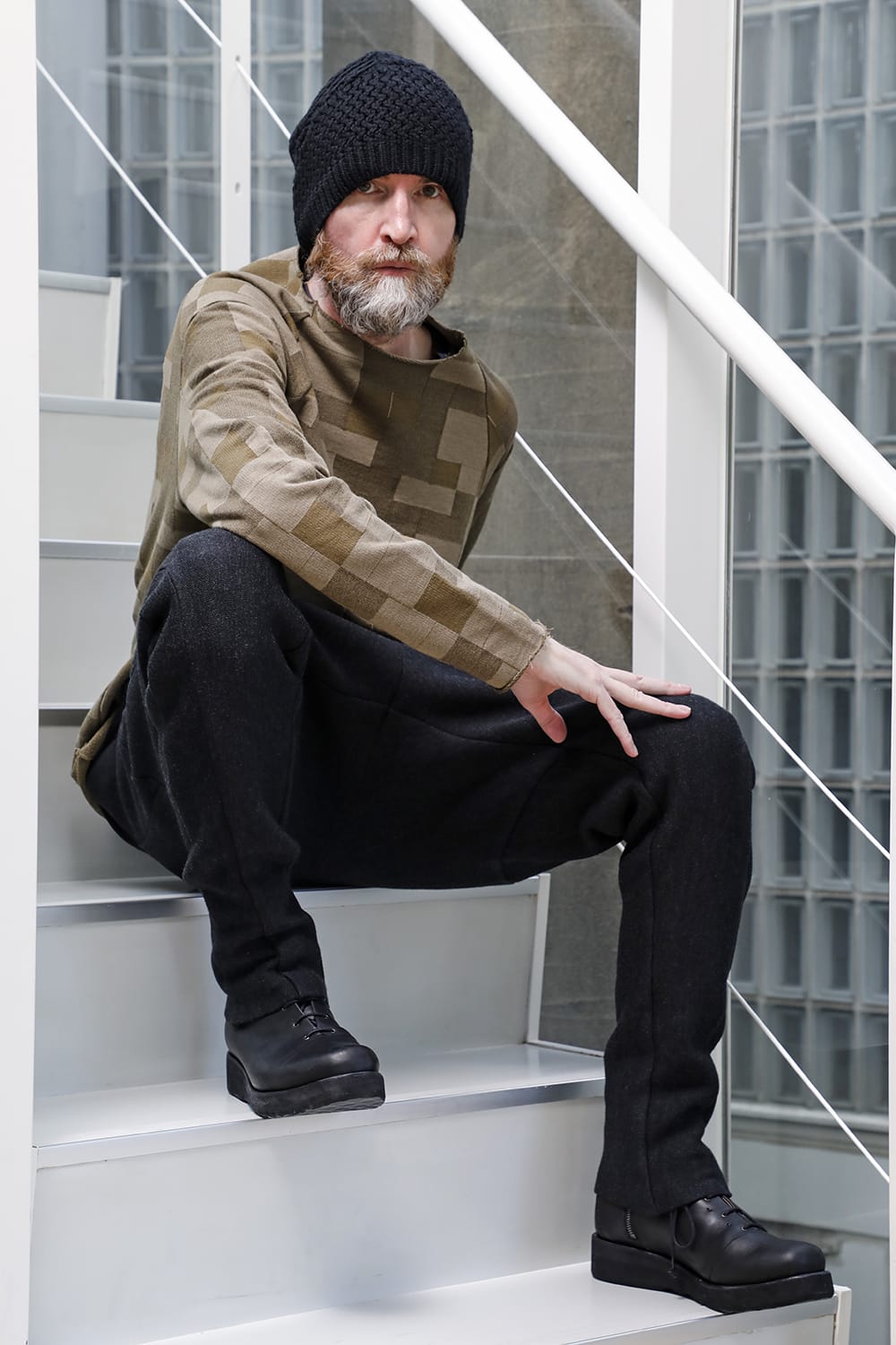 The neckline, hem and cuffs are cut off and the neckline is a bottleneck.