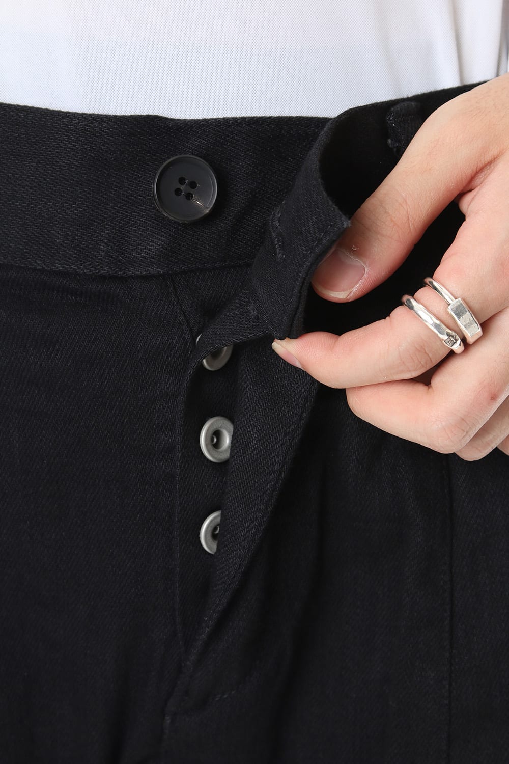 · The large curved twisted silhouette makes a drape when worn, it shows a three-dimensional feeling and elongates the legs. There are ZIP cargo pockets along the seam on the thigh part