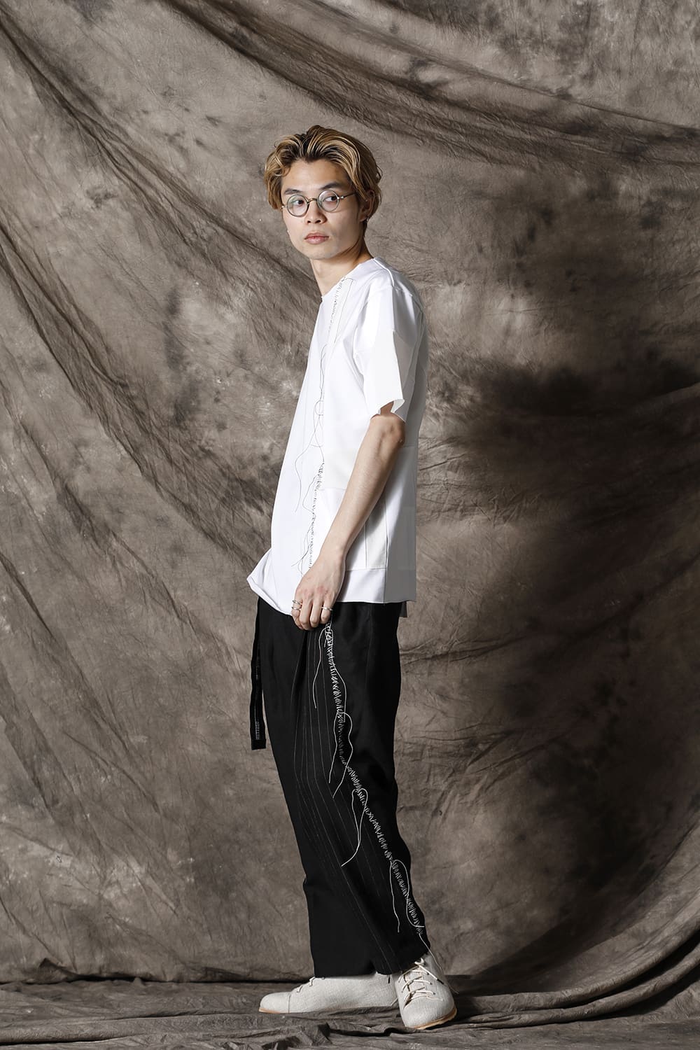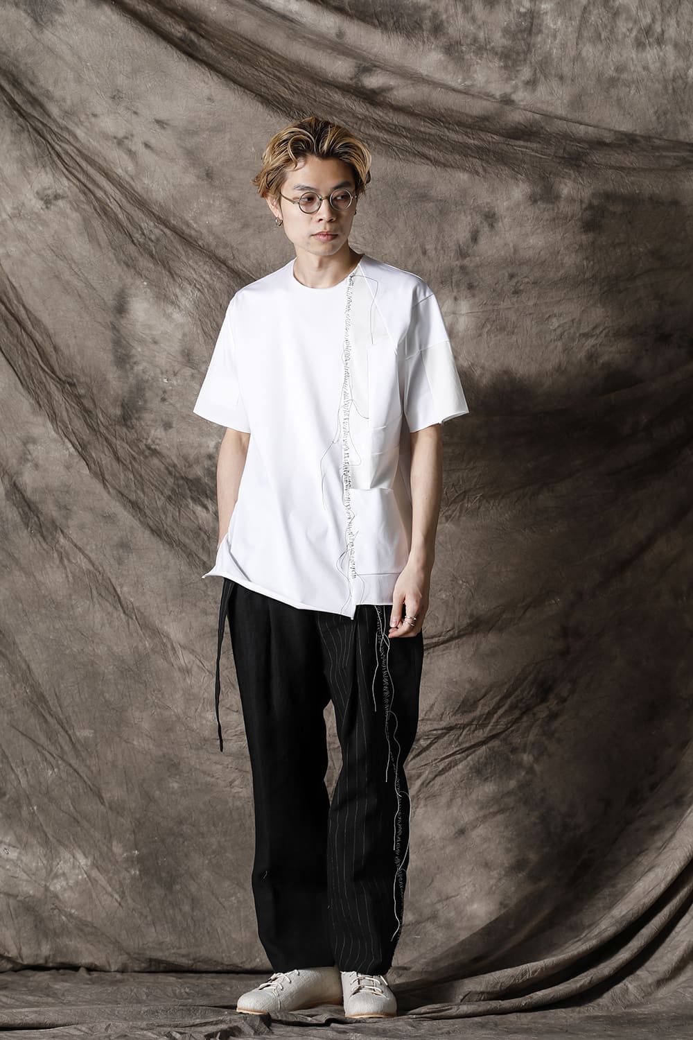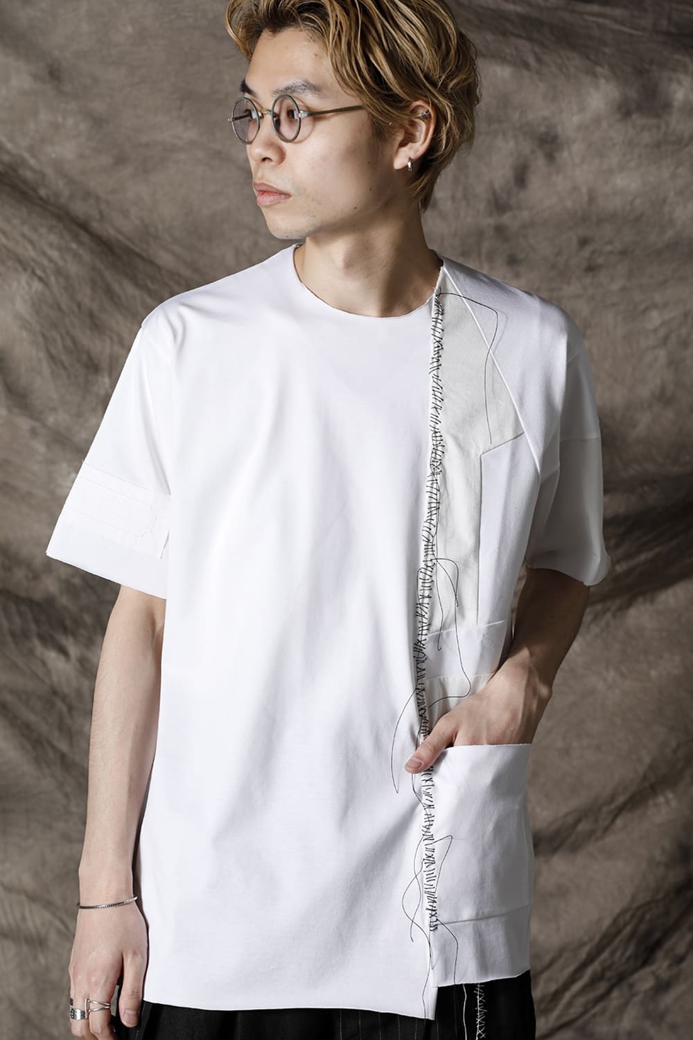 This is a big silhouette T-shirt with a complicated switching pattern on the left side. Color contrasting ecru color and pocket design. The left front is hand-stitched, which is the brand's signature design. The fabric is a smooth but resilient cotton jersey.