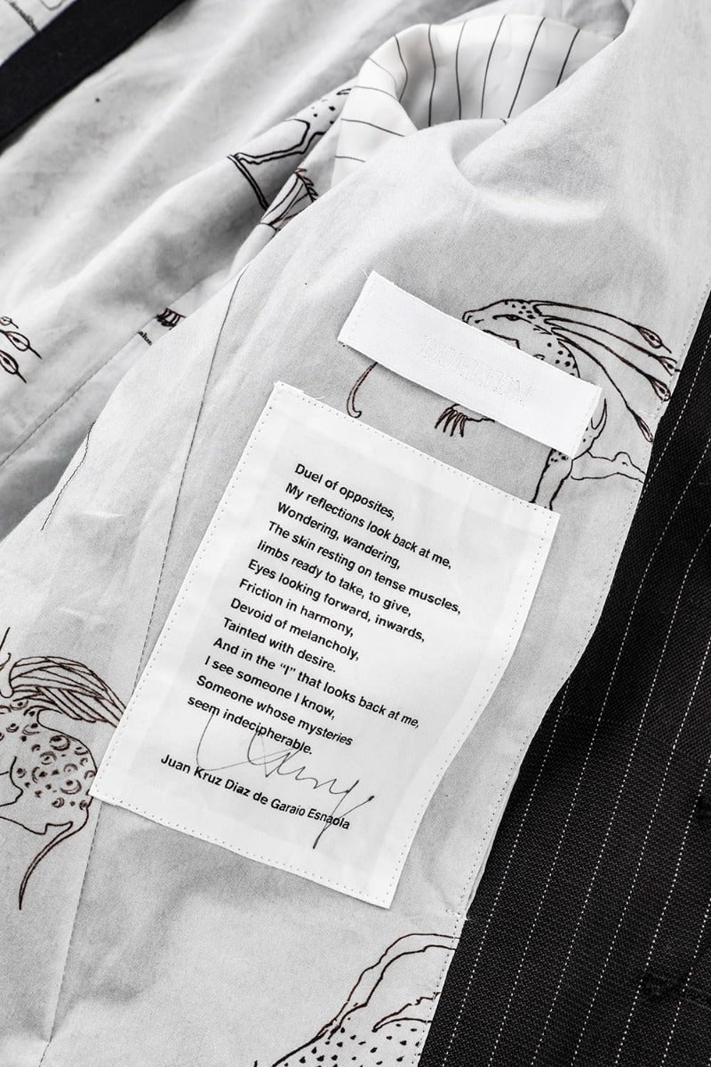 Band collar jacket made of 6 different fabrics An art work of Nine Beasts by Evelyn Gerbaud are printed on the lining Comes with Harness.