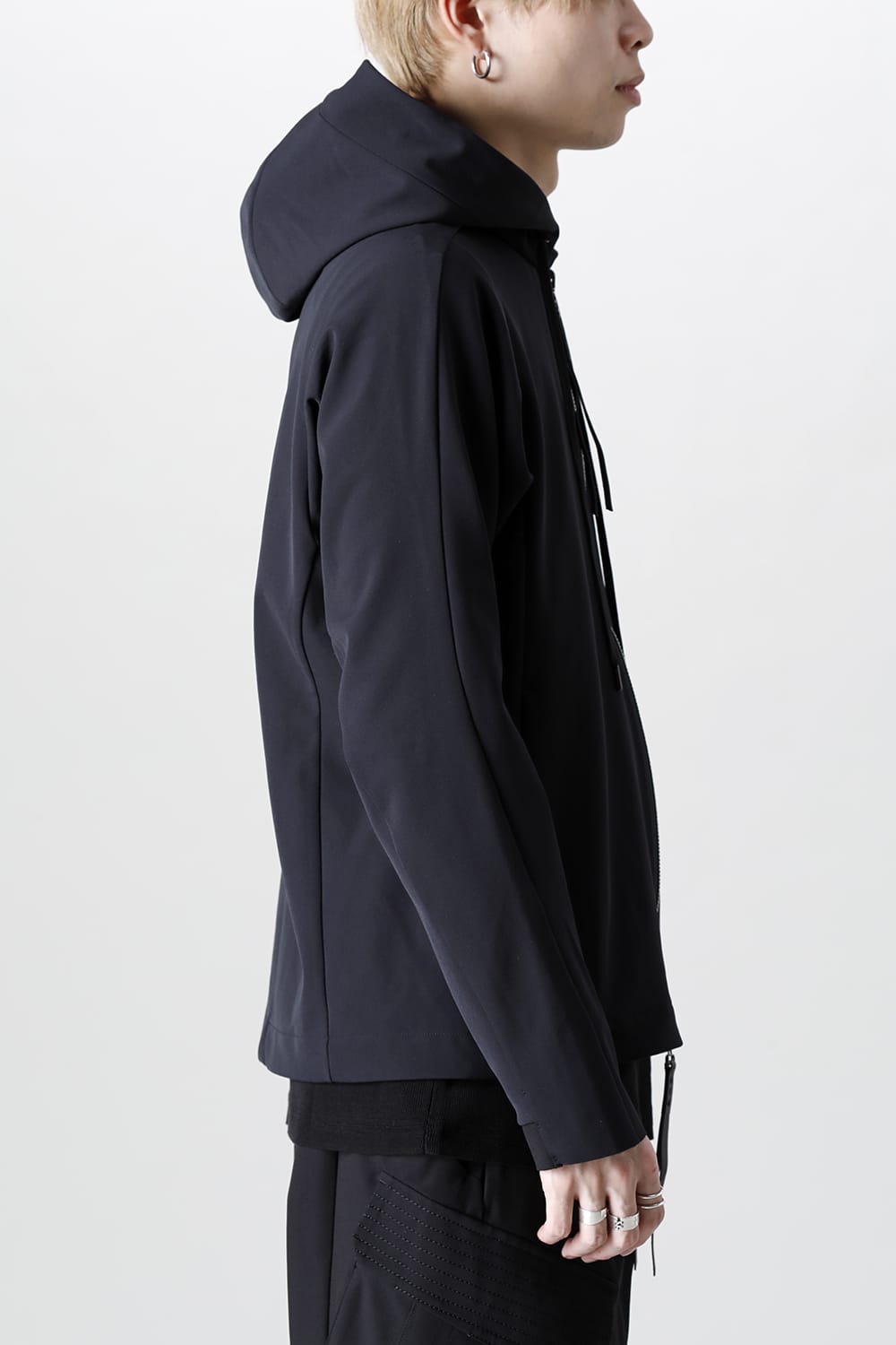 This is a hood jacket with a relaxed silhouette that has a loose width and arm holes.