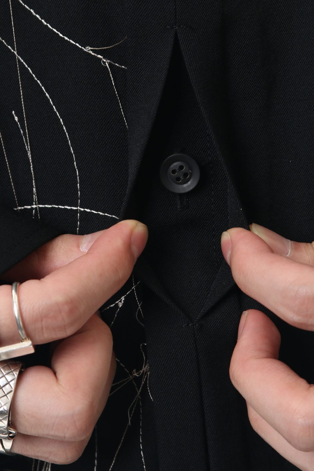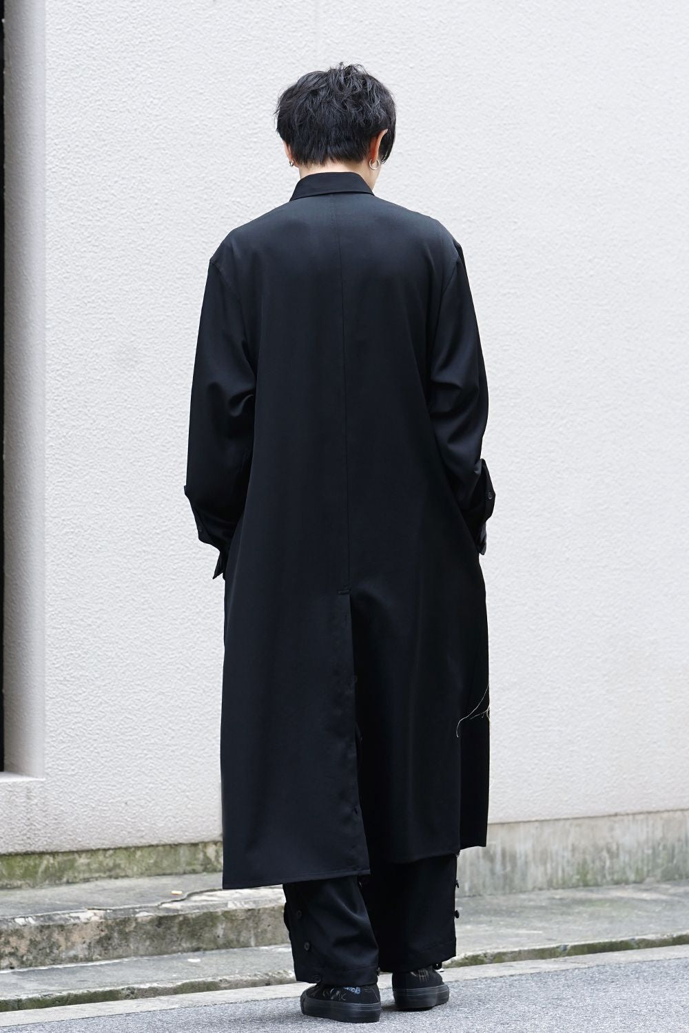 This long shirt with a fly front is characterized by the tarantula embroidery on the front, which was worn in the runway LOOK 3. The front fly is designed to hide the buttons from both sides. The design of the tarantula was done by Shoryu Hatoba and the three-dimensional embroidery is expressed using three colours of embroidery thread.