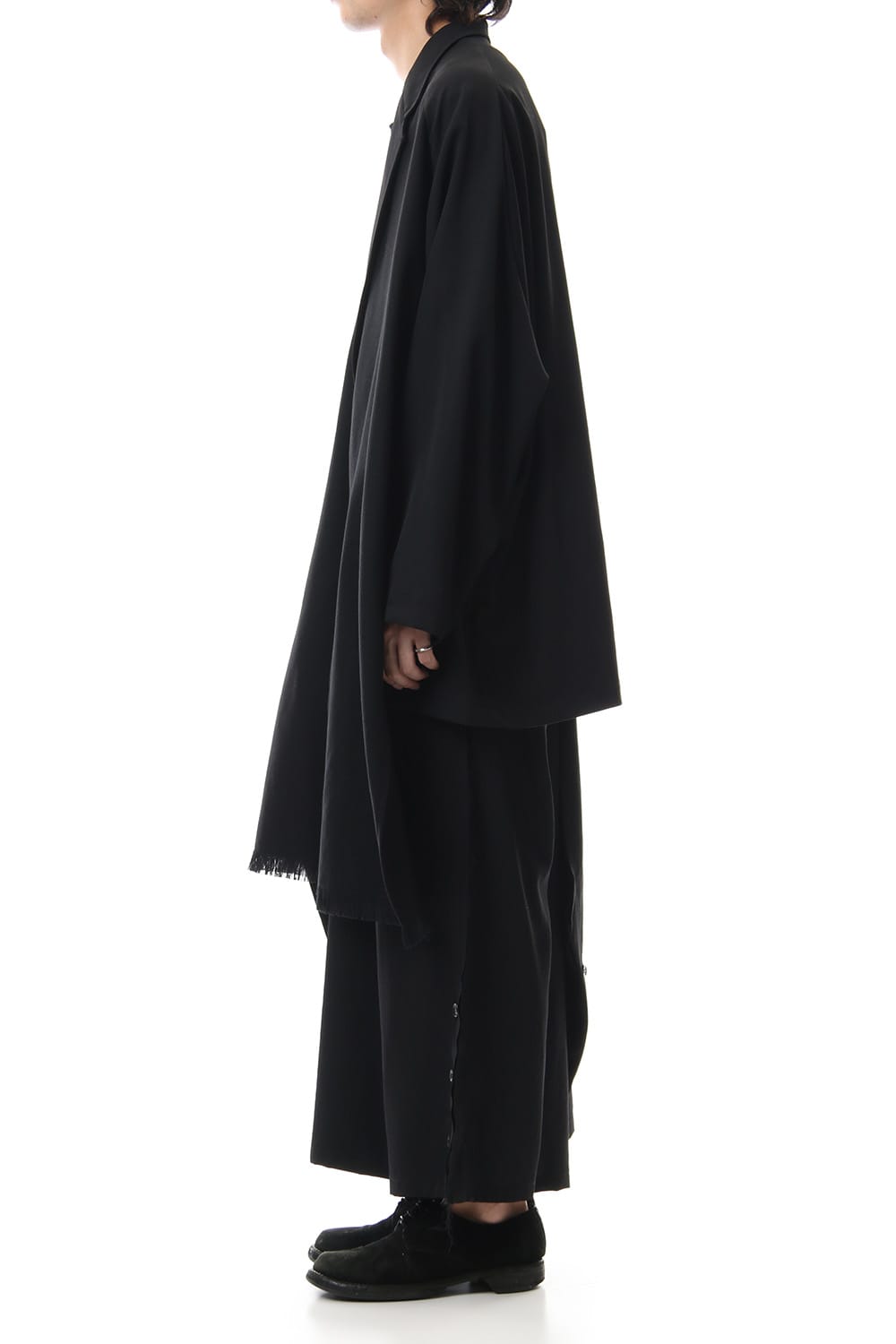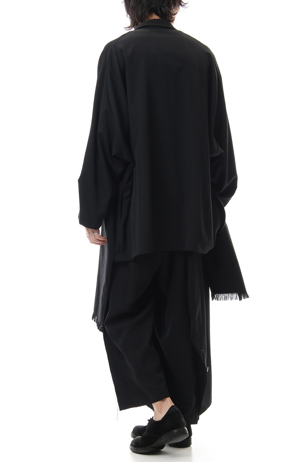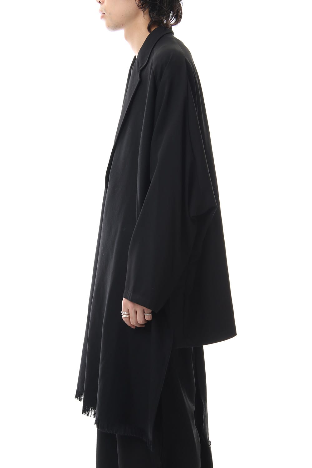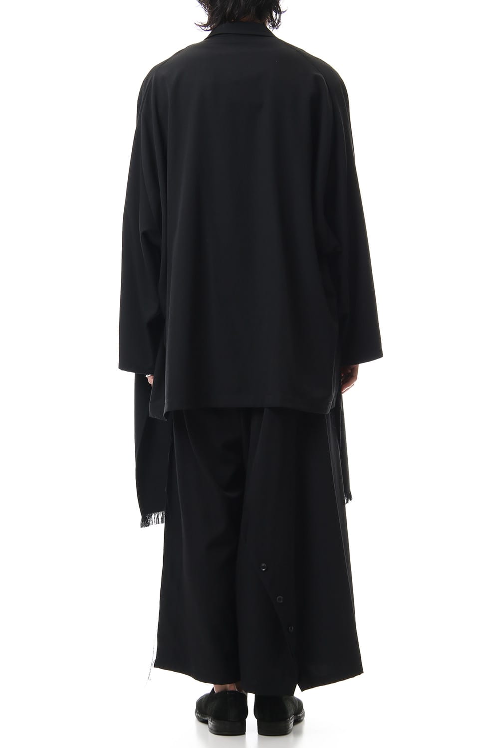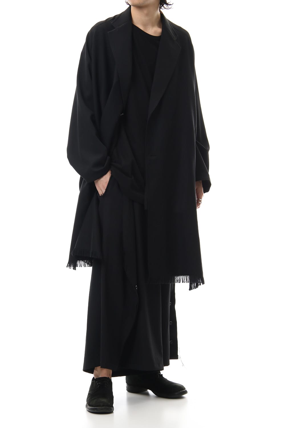 A raglan jacket made of wrinkled gabardine fabric with a fringed scarf on the front. It is a relatively basic detail but the lapel is a large peak lapel and the sleeves are designed to be quite wide.