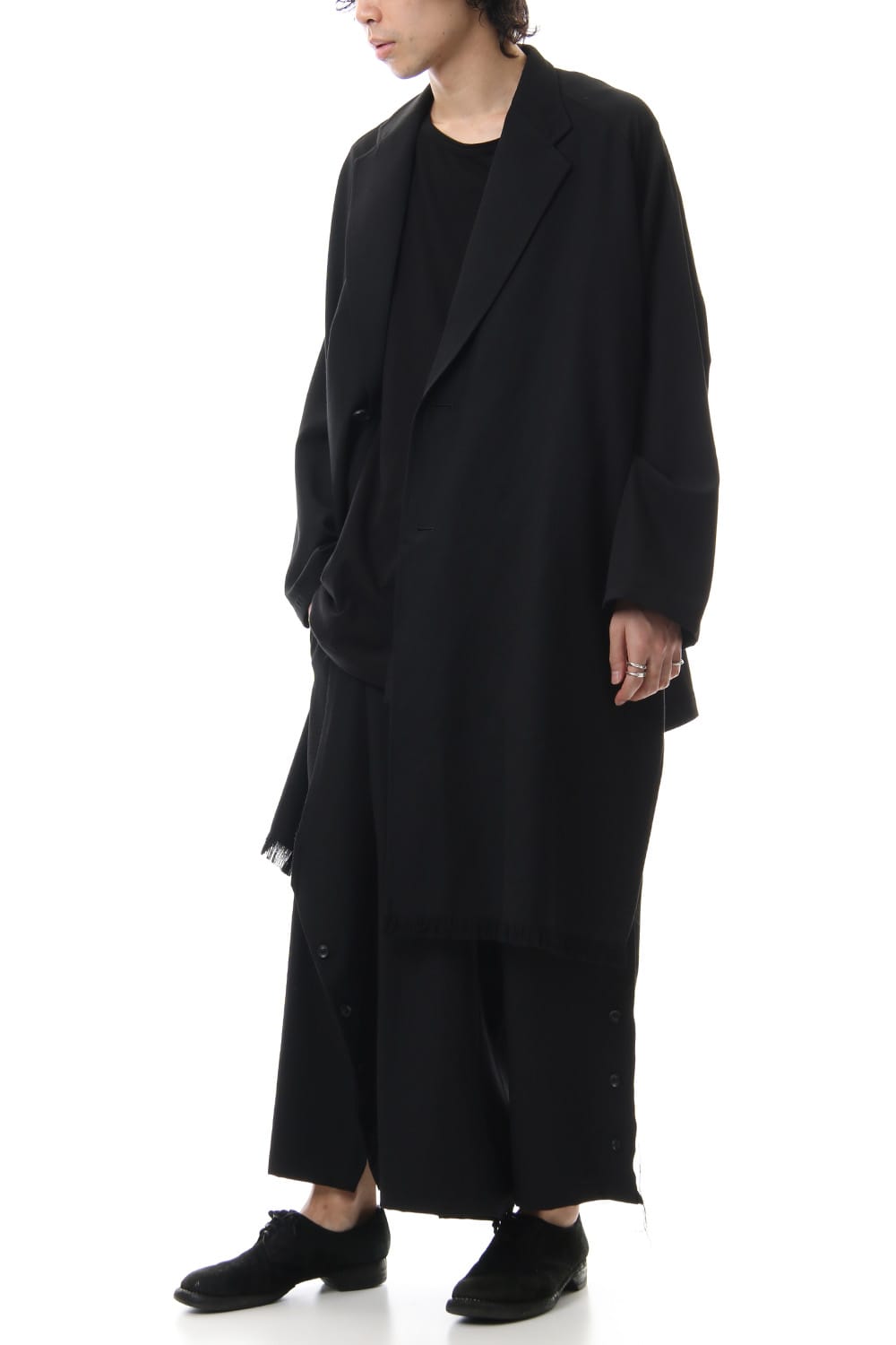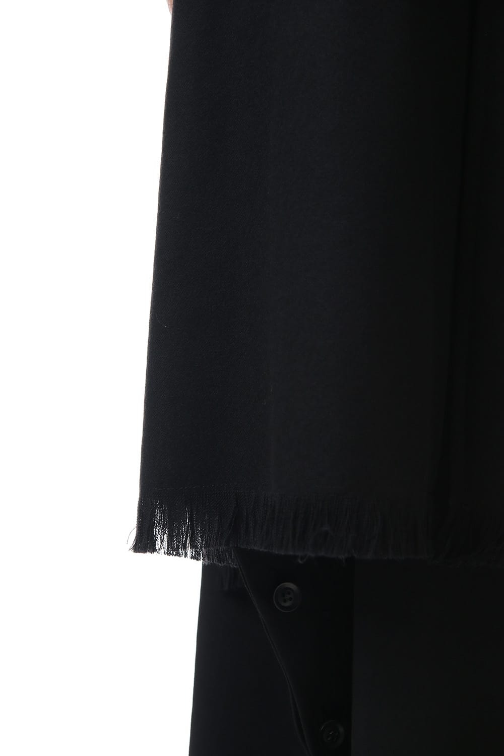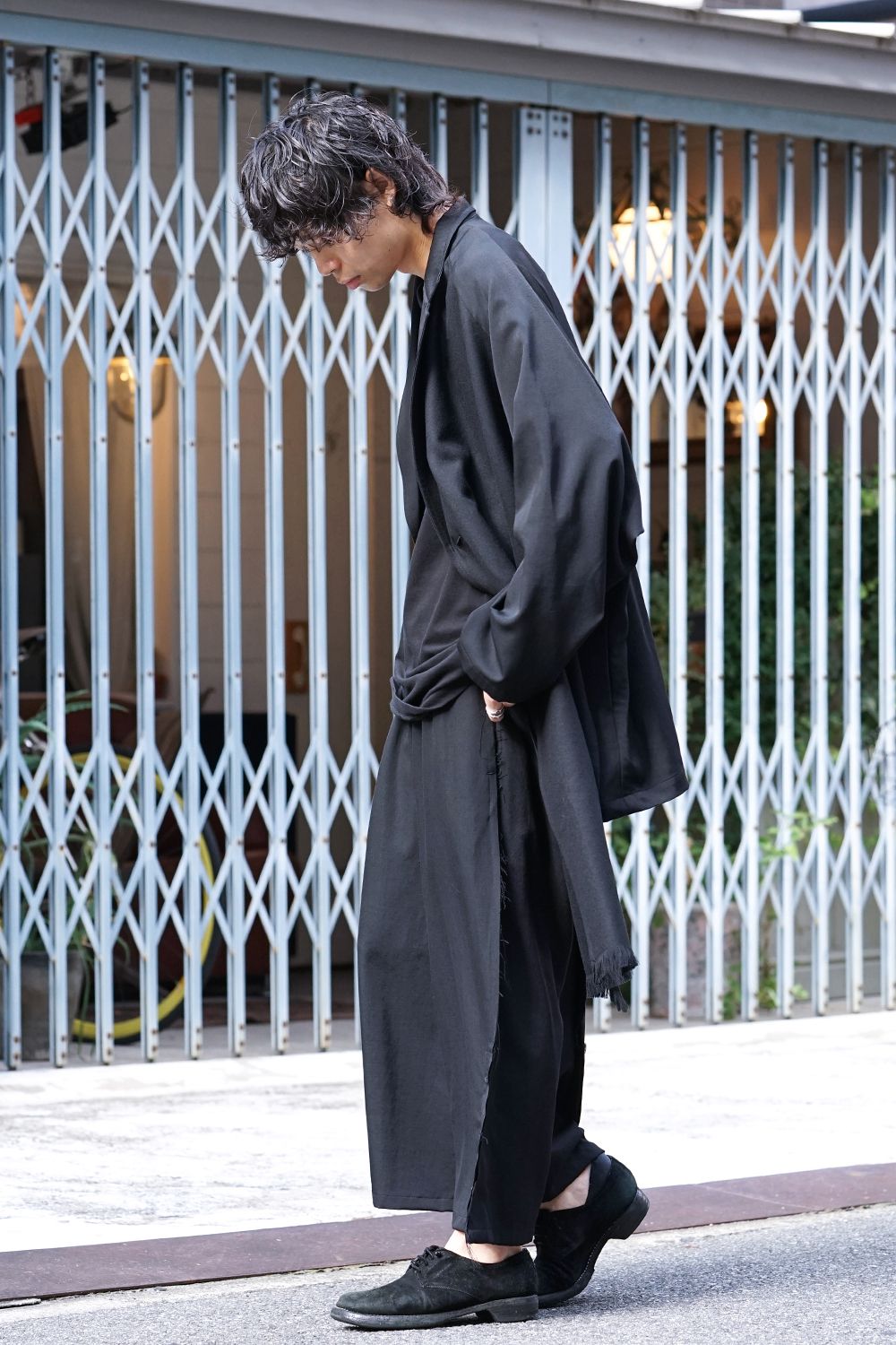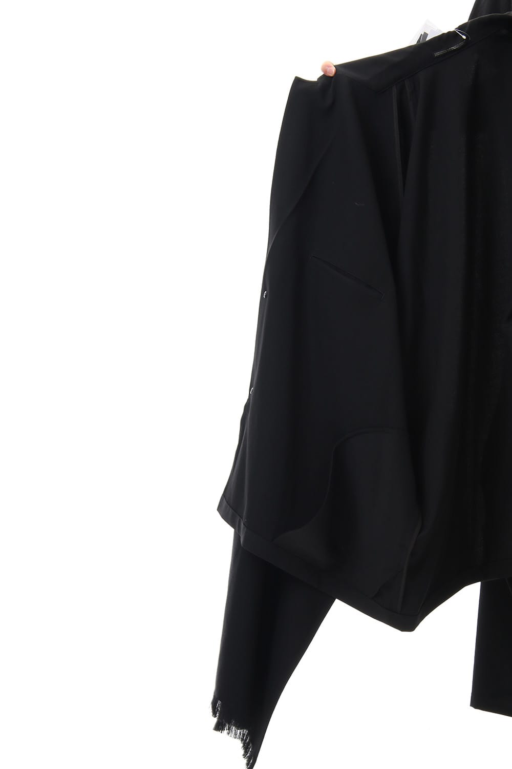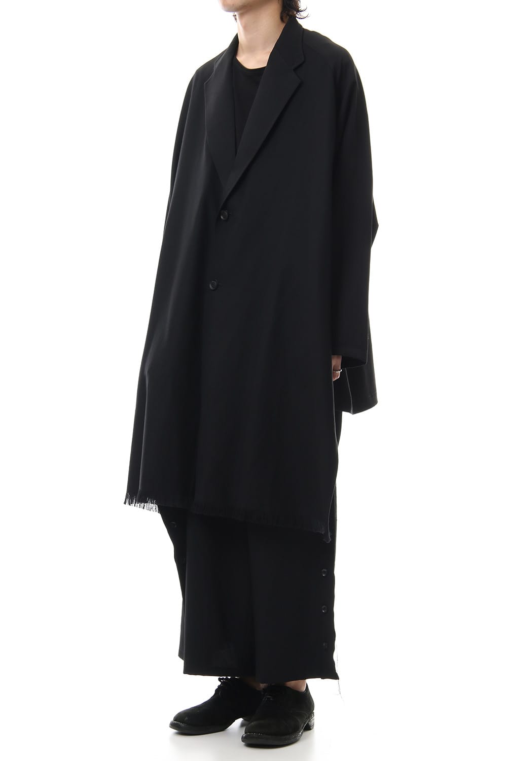 A raglan jacket made of wrinkled gabardine fabric with a fringed scarf on the front. It is a relatively basic detail but the lapel is a large peak lapel and the sleeves are designed to be quite wide.