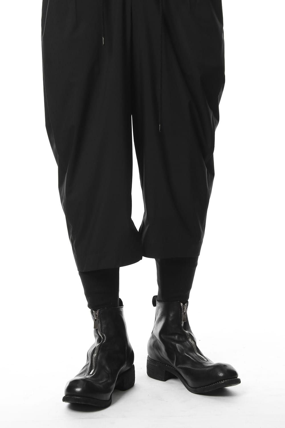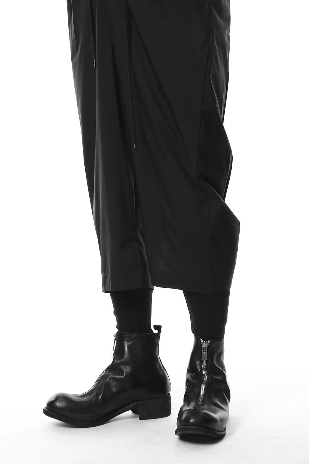 This pair of front zip boots features a toe with volume that protrudes out. Both the front leather and lining leather are mold into one piece. The sole selected is a double sole specification with a raised heel. These boots are great for long legs and are compatible with many different kinds of bottoms.