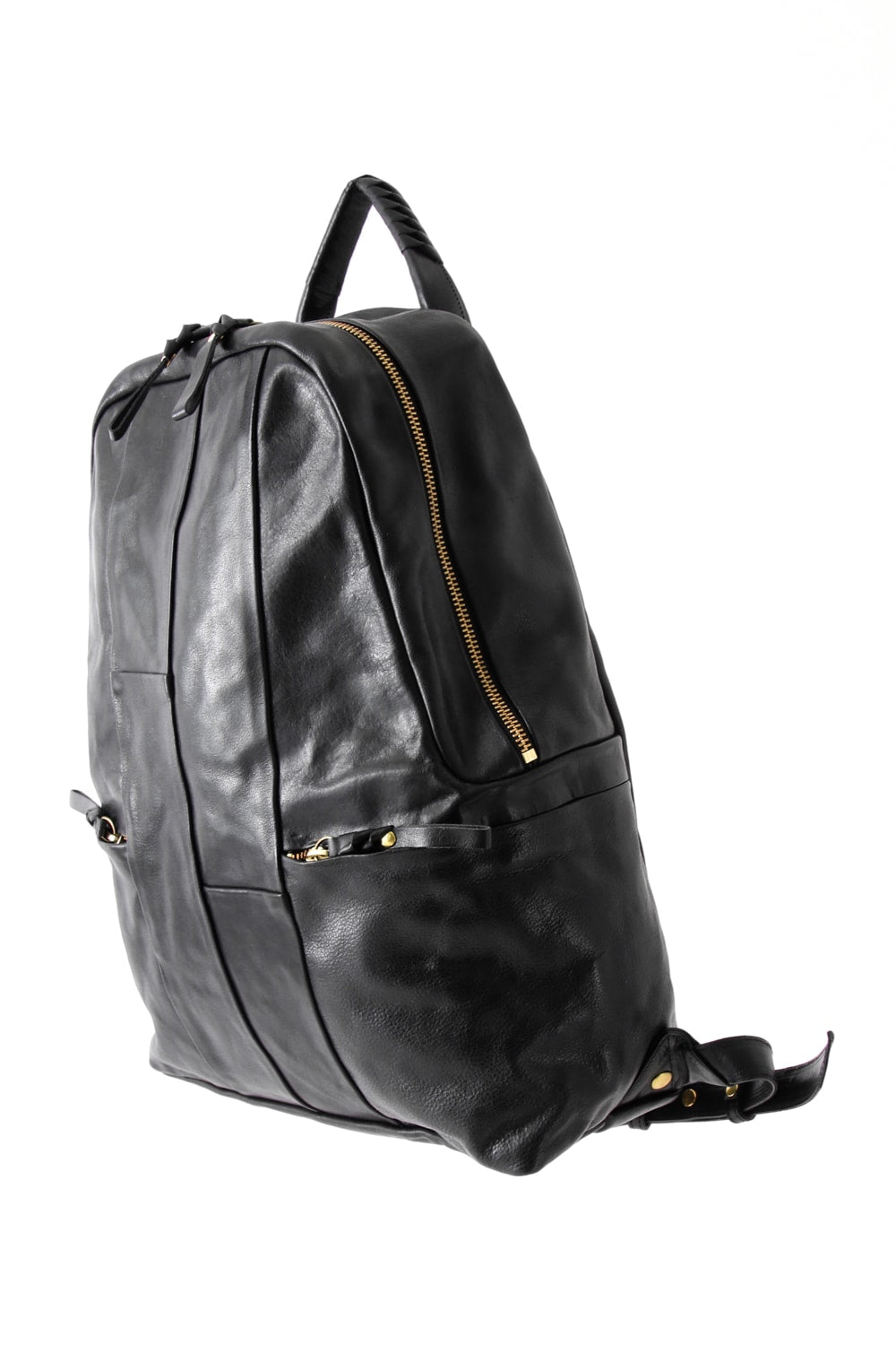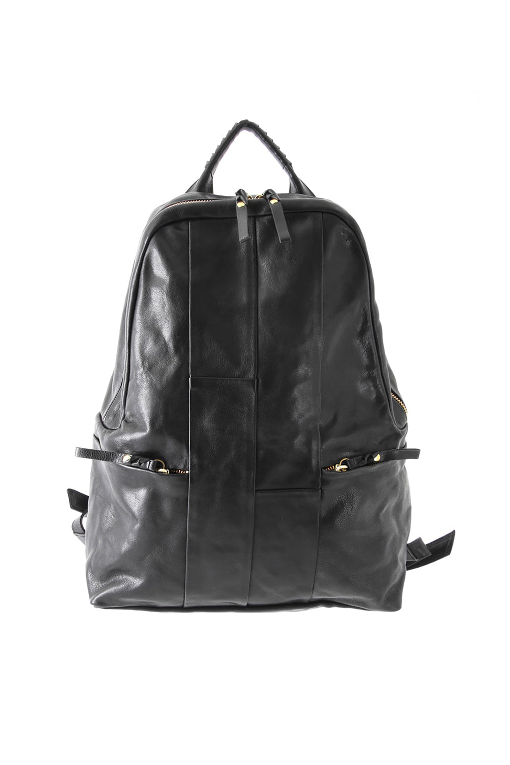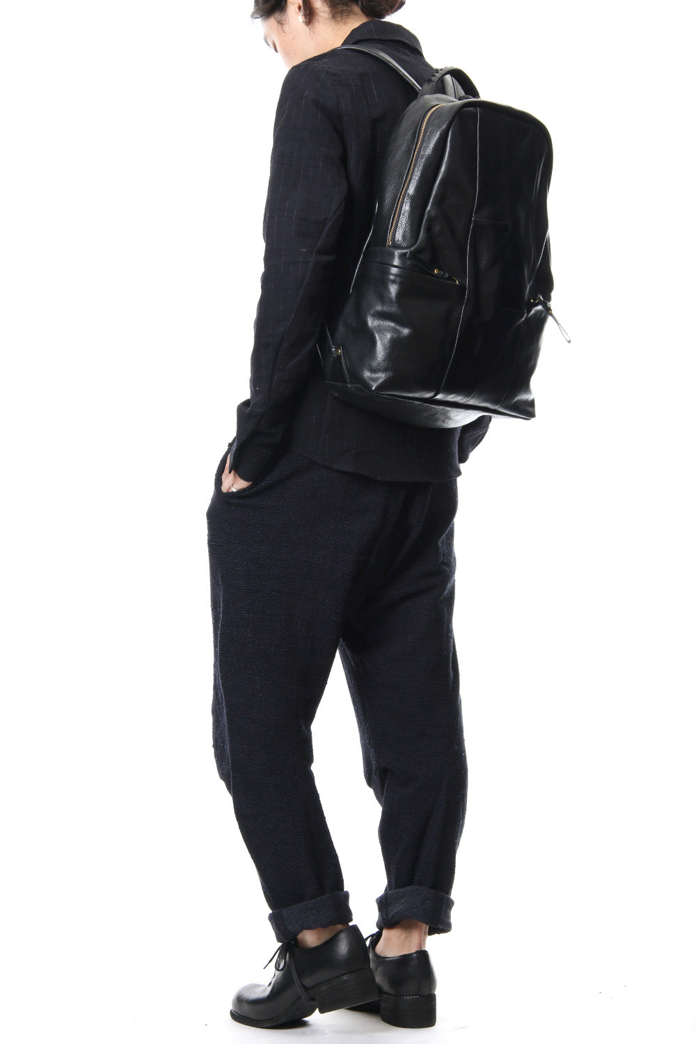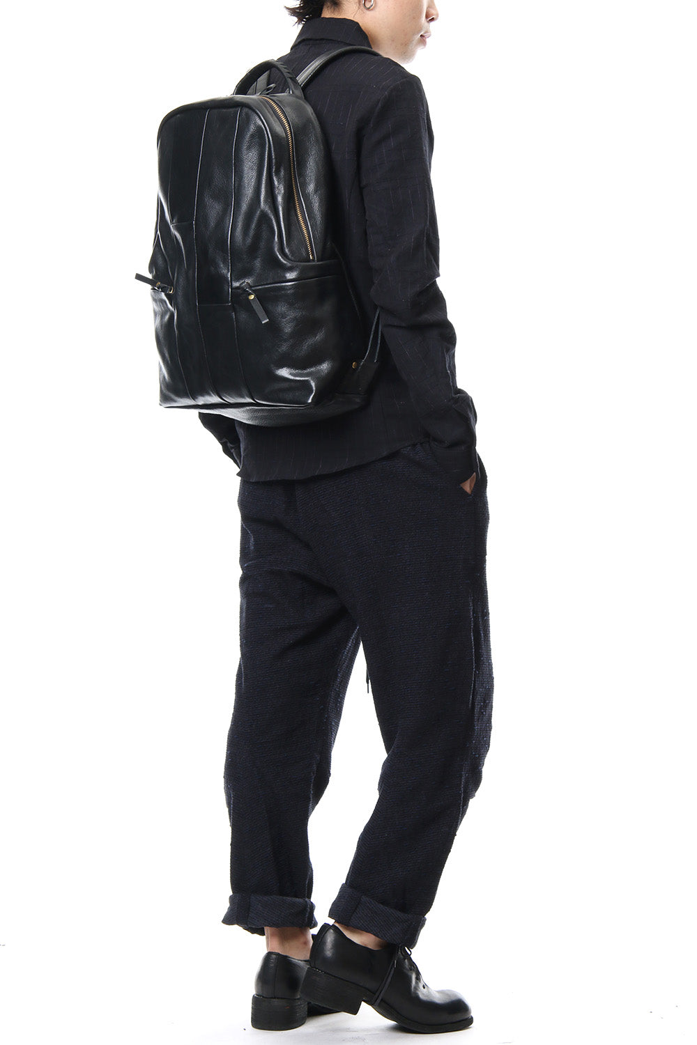 This backpack is a flat shoulder and is not stressing on the shoulders even if you carry it for a long time. Two zip pockets are attached to the front. The colour scheme of brass and black also adds a good accent. The leather is a vegetable tanned steer leather, with fine embossed and after dying oil was added for the glossy finish. The thick oil shrink leather was also shrunk by heat in a drum.