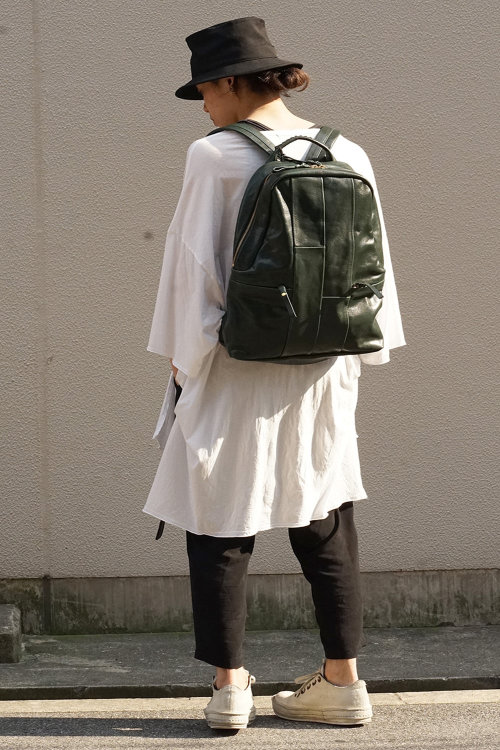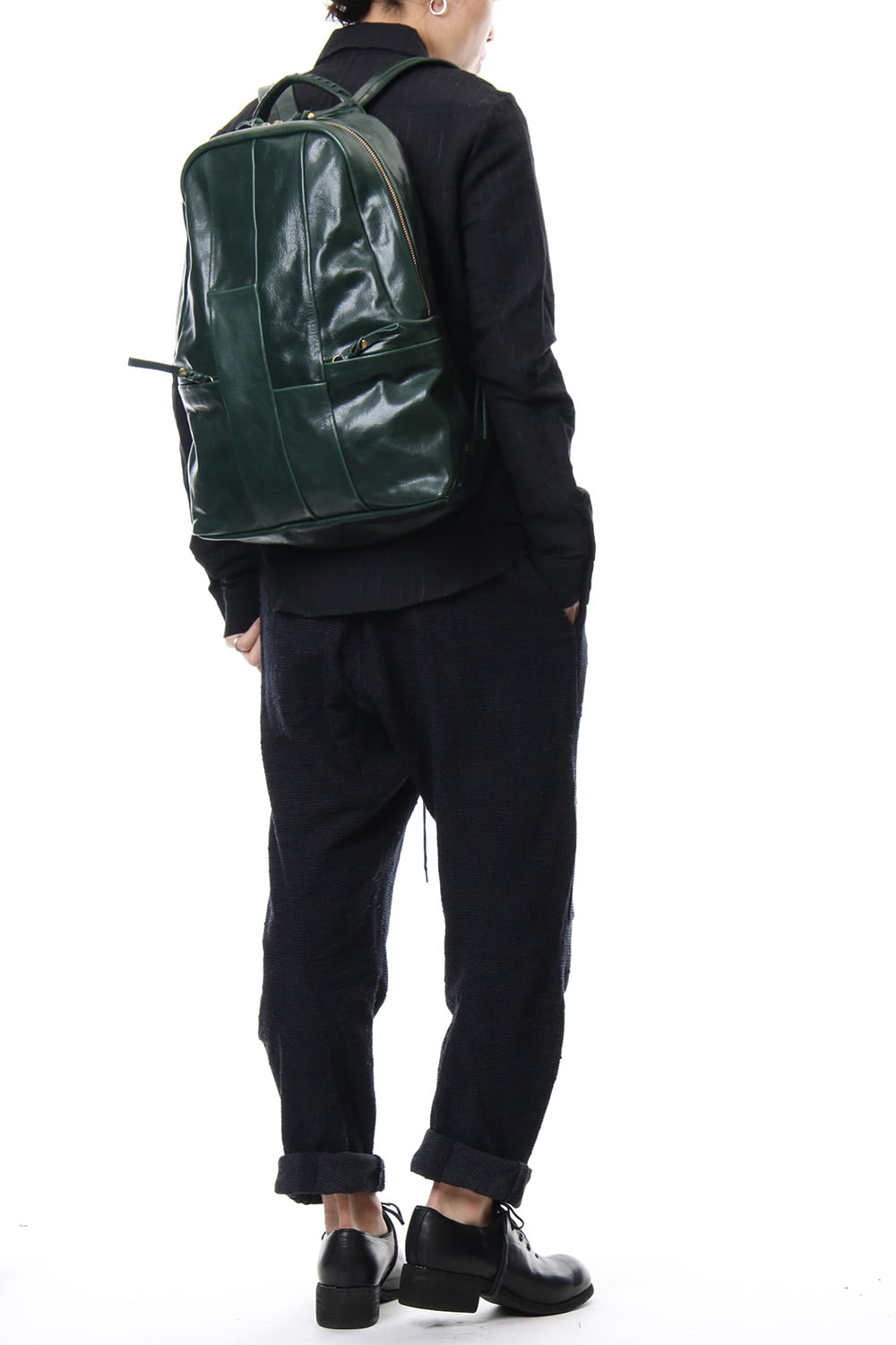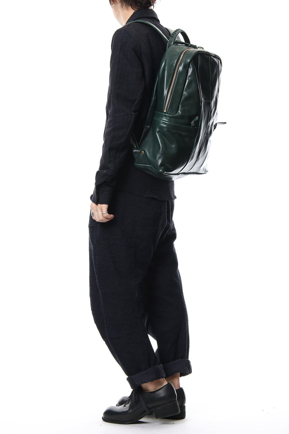 This backpack is a flat shoulder and is not stressing on the shoulders even if you carry it for a long time. Two zip pockets are attached to the front. The colour scheme of brass and black also adds a good accent. The leather is a vegetable tanned steer leather, with fine embossed and after dying oil was added for the glossy finish. The thick oil shrink leather was also shrunk by heat in a drum.
