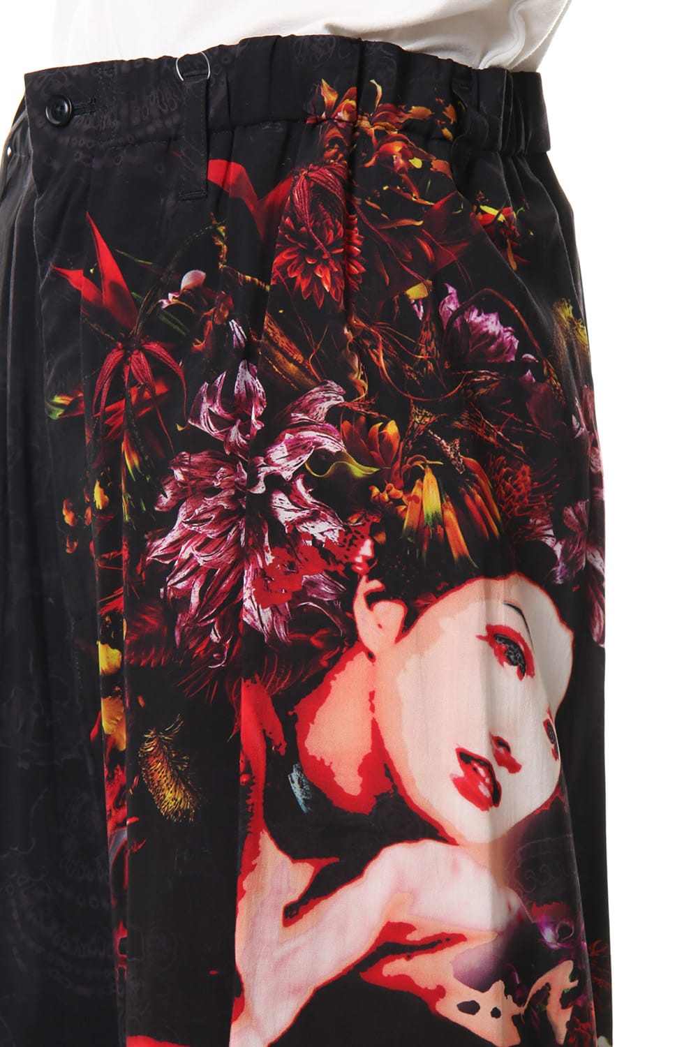 Cropped length pants using lightweight rayon fabric that was worn during the runway LOOK 27. There are completely different patterns on the left and right, on the left side, there is a printed woman and flower and on the right hem, there are woven cords with a slit design. It is thin and can be worn for summer comfortably. If you are looking for a pair that has an impactful look, this will go well with simple T-shirts styles as well.