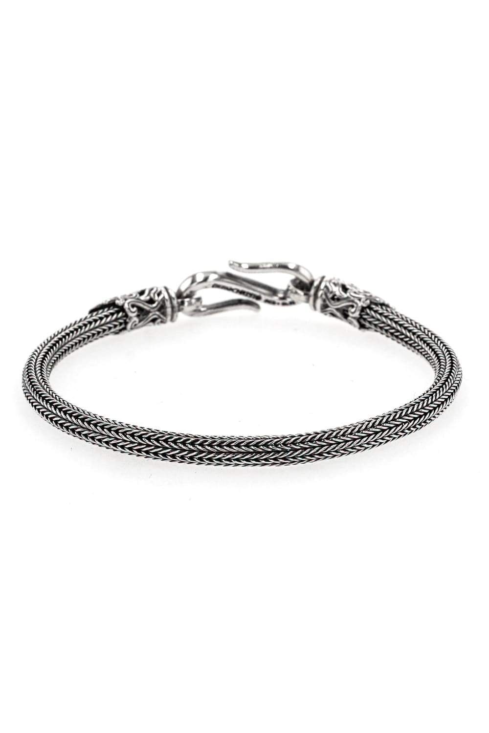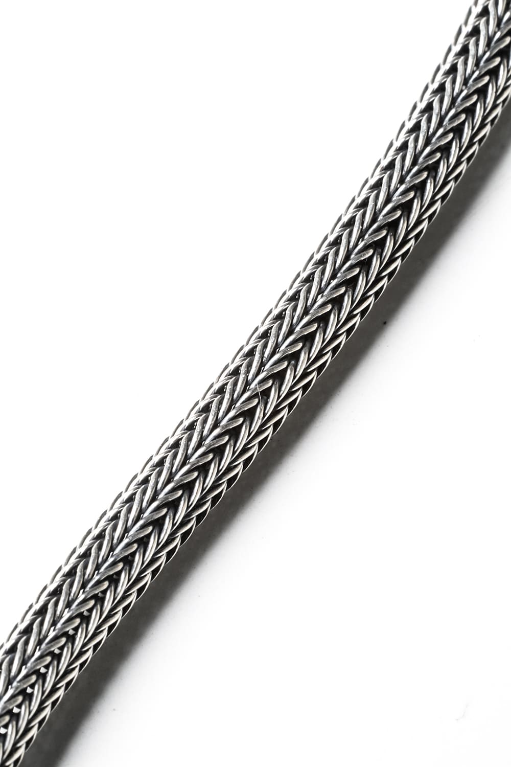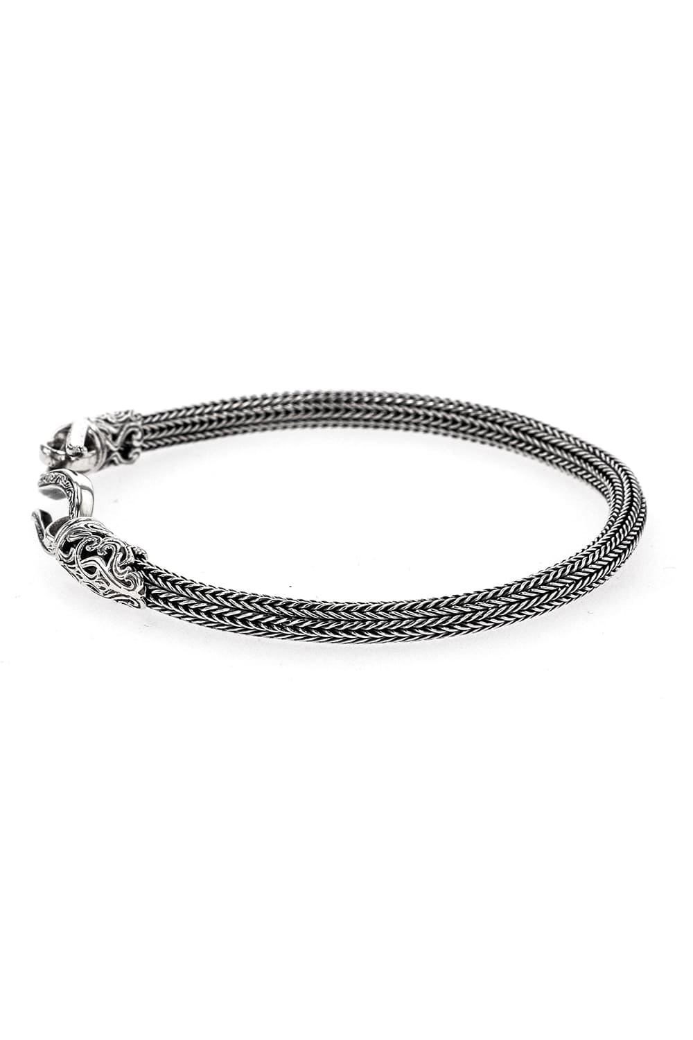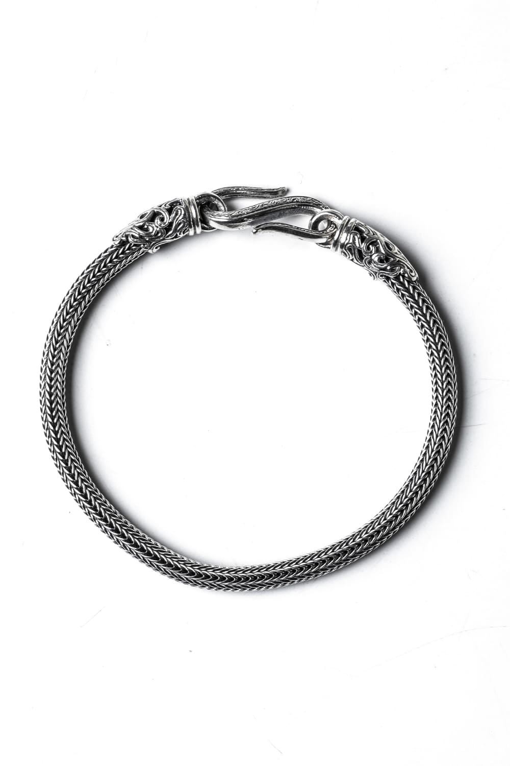 This bracelet is a rope-shaped silver bracelet made by weaving silver like knitting. You can enjoy the supple and delicate look that is hard to believe it is made of metal. The openwork design at both ends is the brand's specialty, and the S-shaped hook part, which is the detachable part, has a delicate carved pattern. The design has relatively few decorations, so it is recommended to be stacked with other bracelets. We can also make an order in your desired size, so please feel free to contact us for more information.