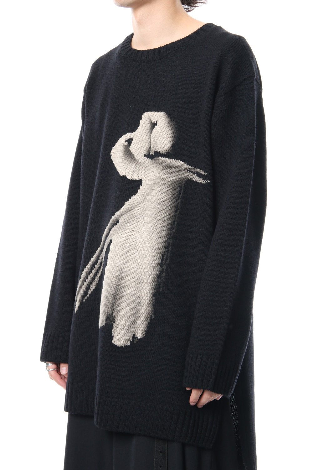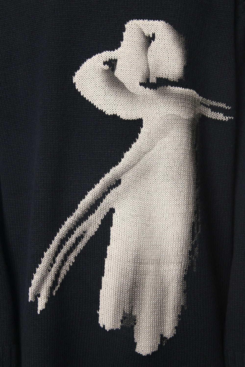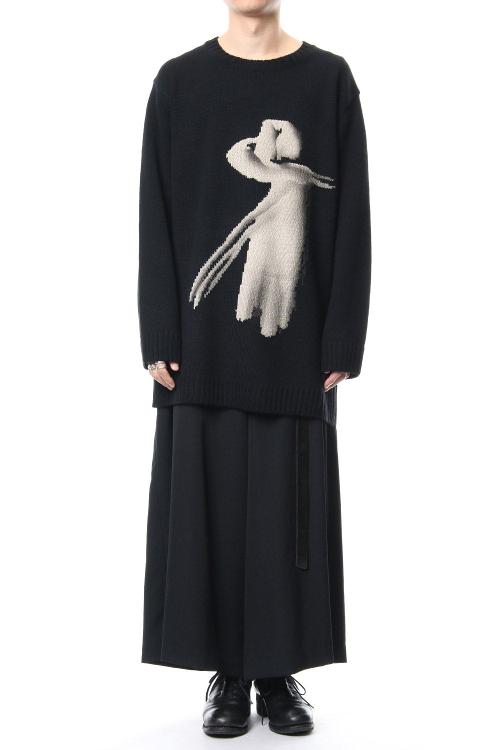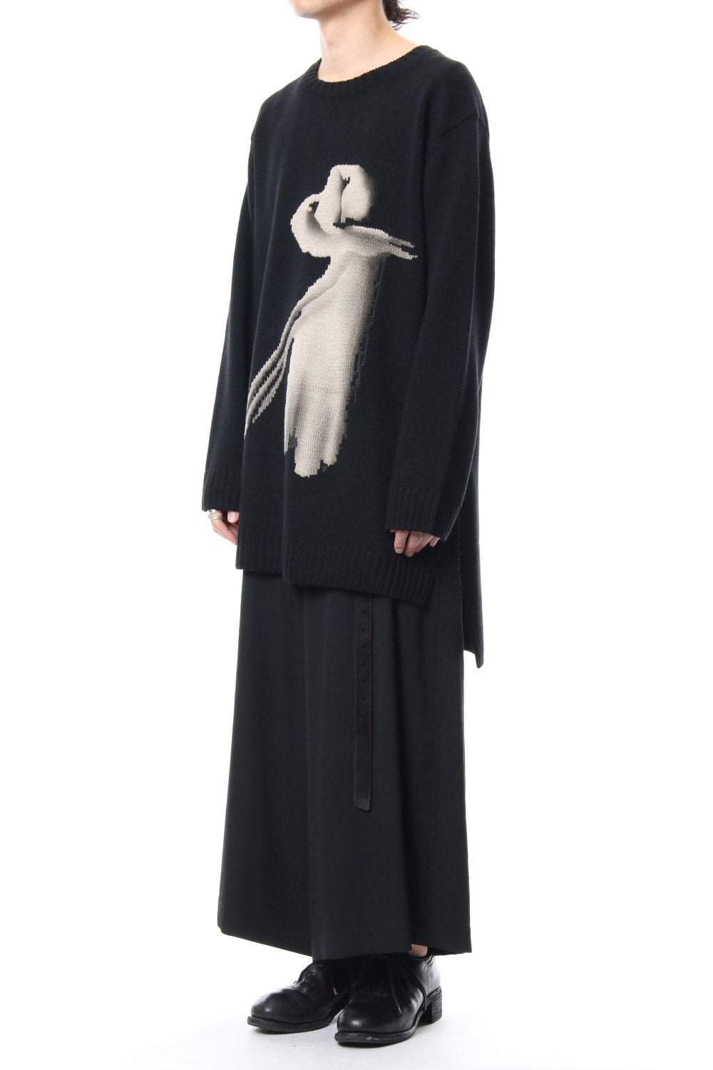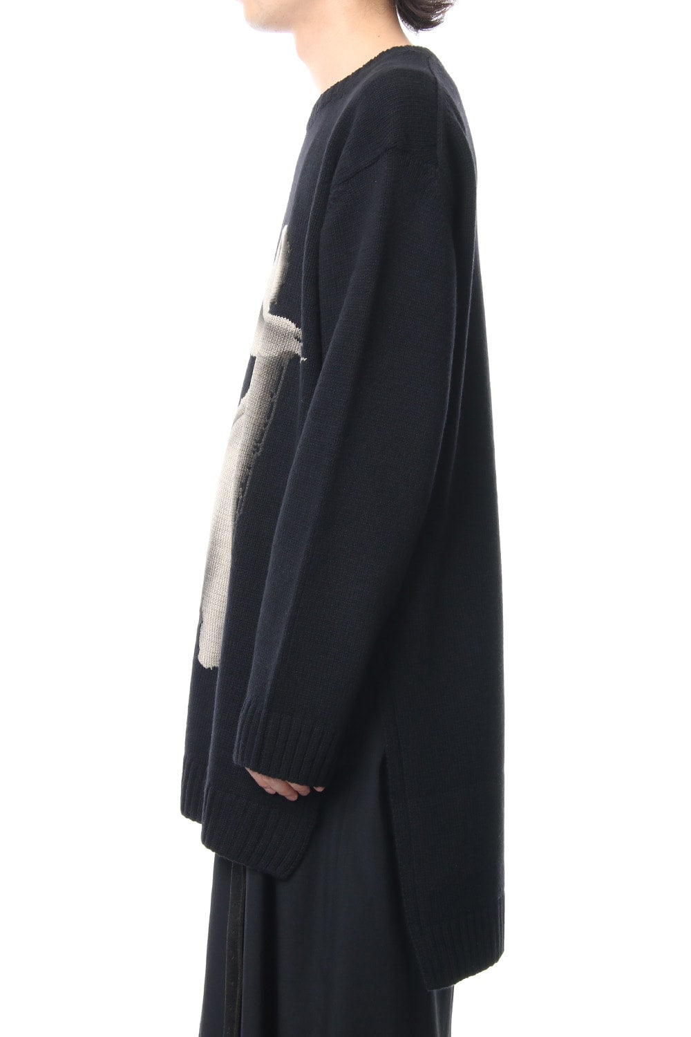 A 5 low gauge pullover knit featuring a knit pattern of handwritten illustrations of a woman drawn on. Illustration part is expressed with knitted pattern and pigment print. Pigment prints are hand done with shading on the design pattern and drawing depth. Wool is used for the ground part, it is light and well textured. For the design pattern part, cotton was used as it is easy to be pigmented.