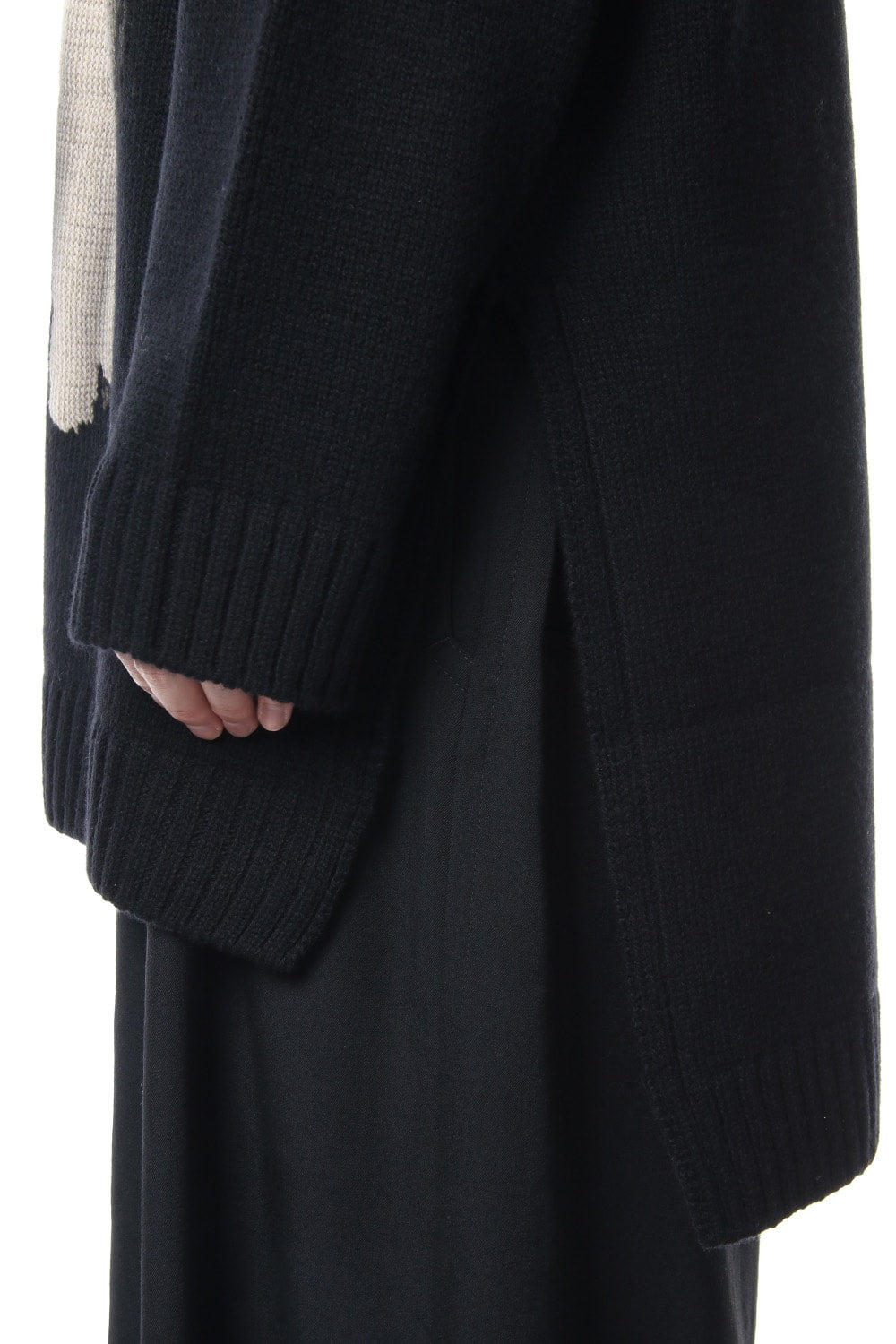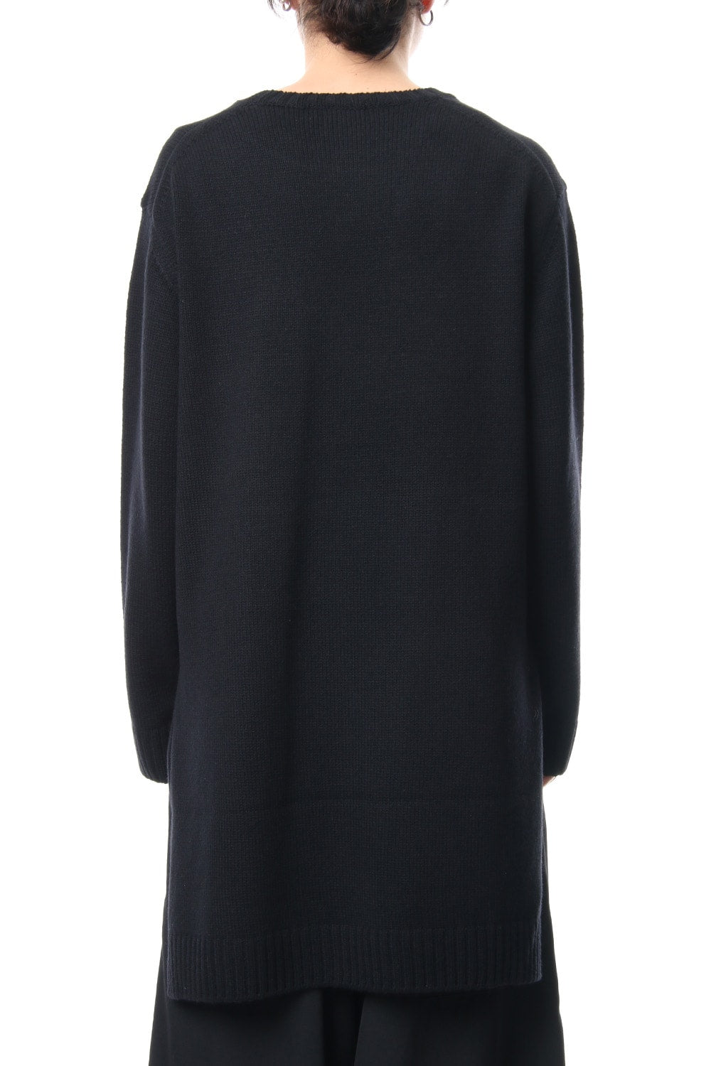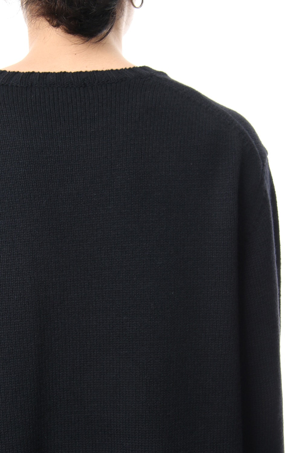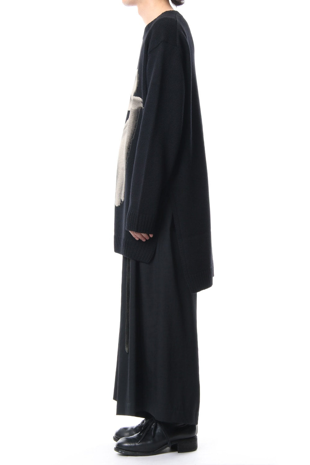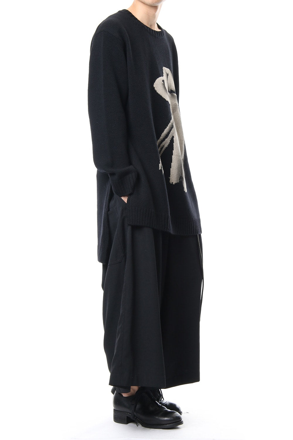 A 5 low gauge pullover knit featuring a knit pattern of handwritten illustrations of a woman drawn on. Illustration part is expressed with knitted pattern and pigment print. Pigment prints are hand done with shading on the design pattern and drawing depth. Wool is used for the ground part, it is light and well textured. For the design pattern part, cotton was used as it is easy to be pigmented.