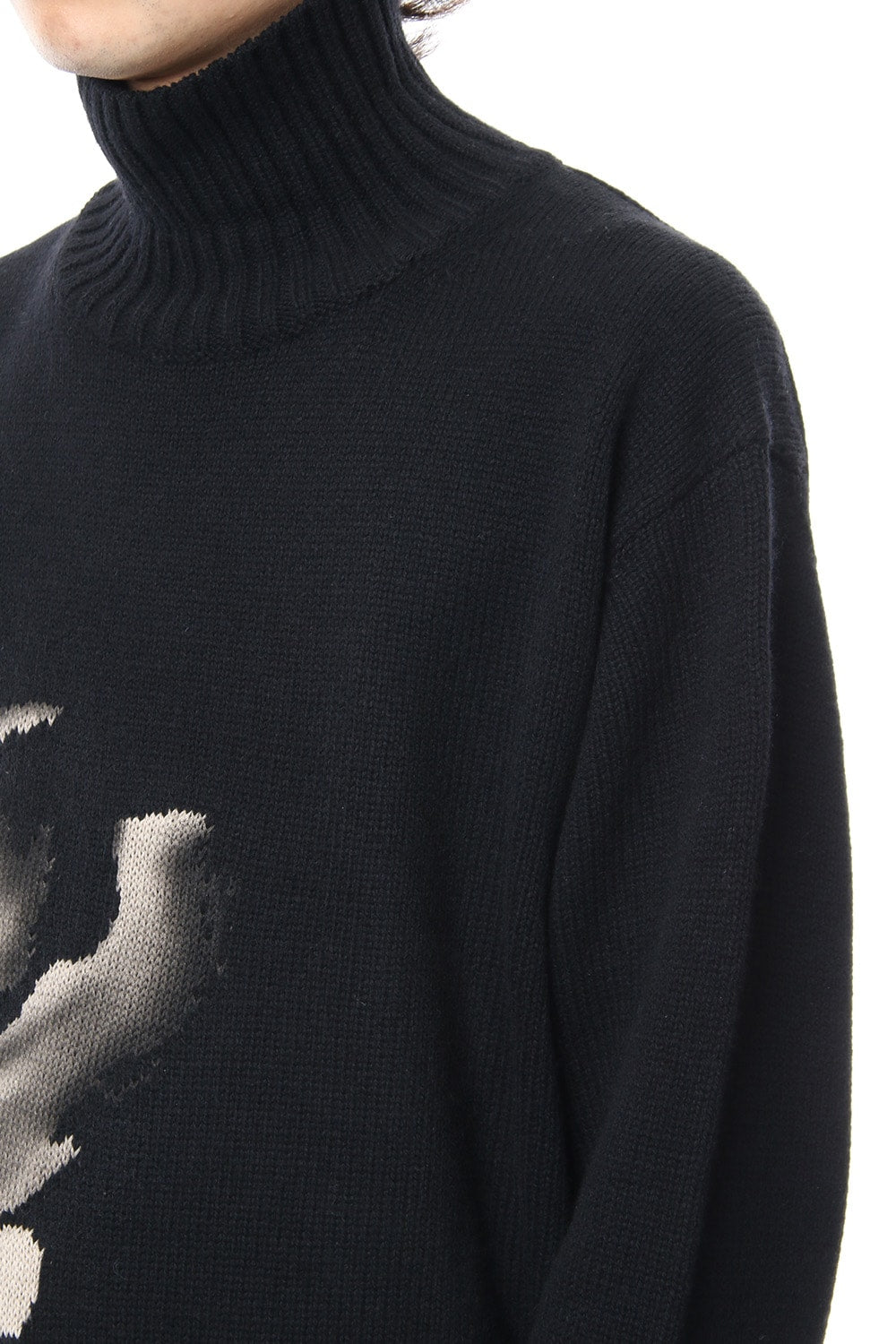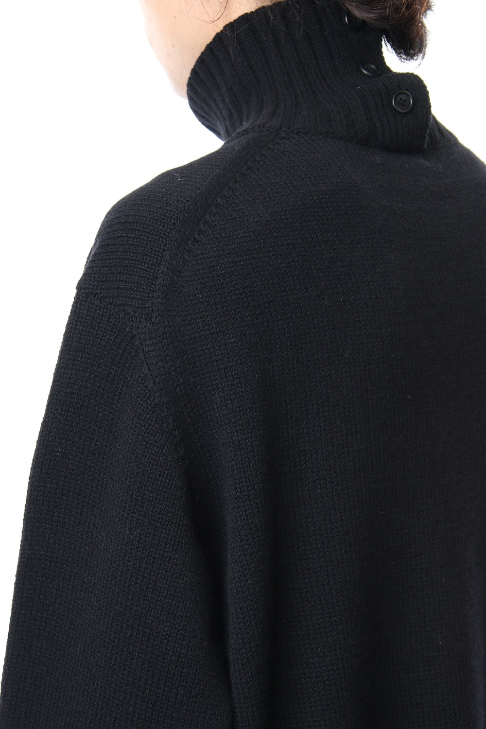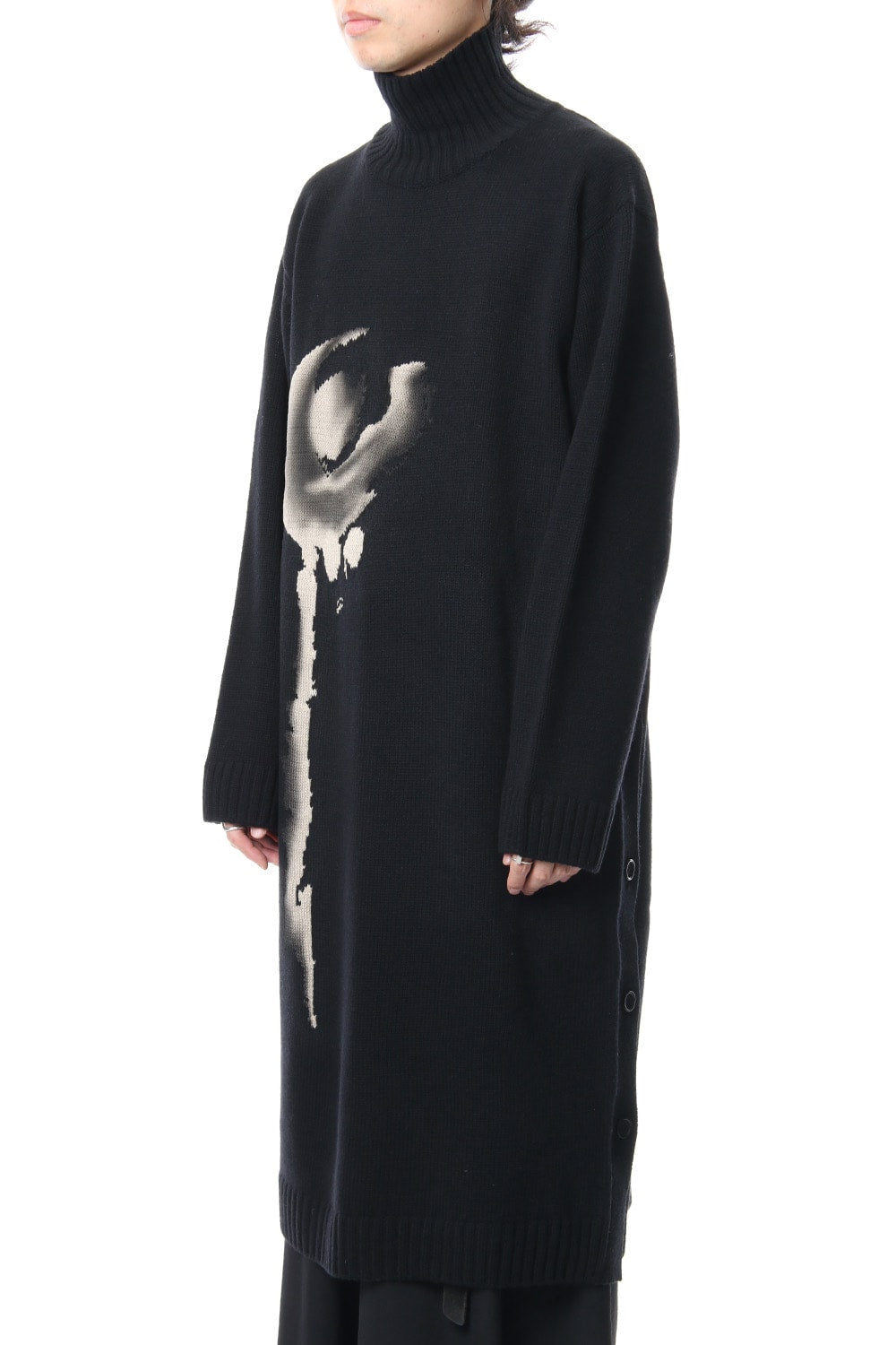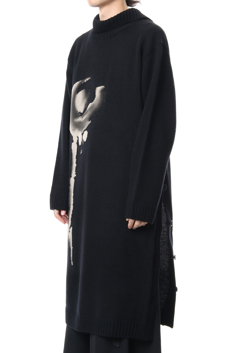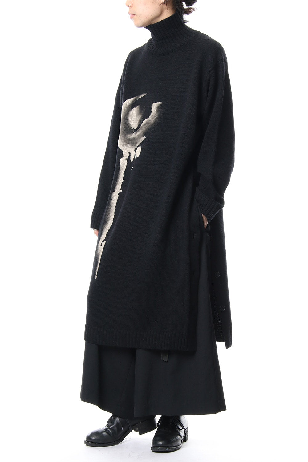 A 5 gauge high neck pullover knit featuring a knitted pattern of hand illustrations of a woman drawn on. Illustration part is expressed with knitted pattern and pigment print. Pigment prints are hand done with shading on the design pattern and drawing depth. Wool is used for the ground part, it is light and well textured. For the design pattern part, cotton was used as it is easy to be pigmented. Buttons are arranged on the left side making it possible to arrange according to your own style.