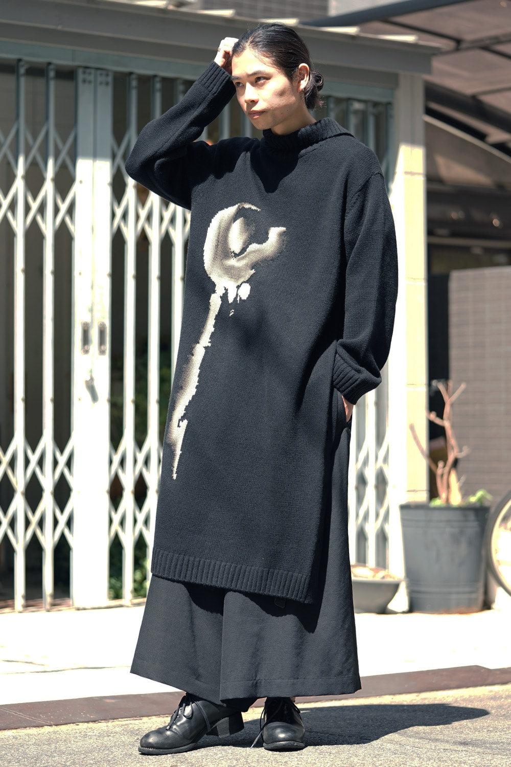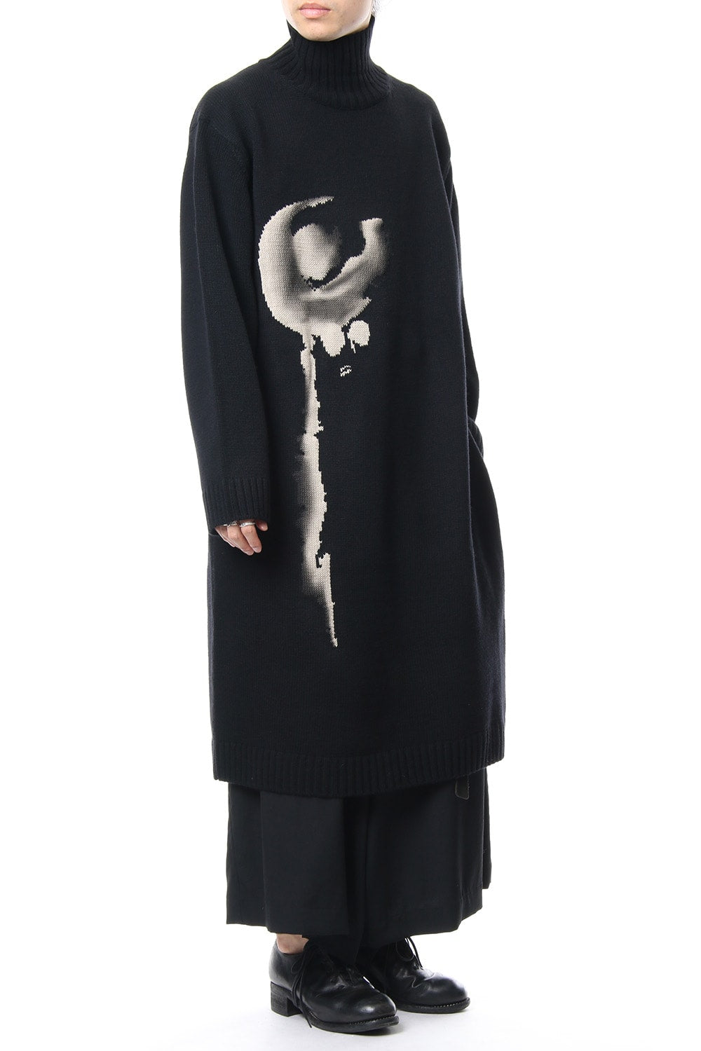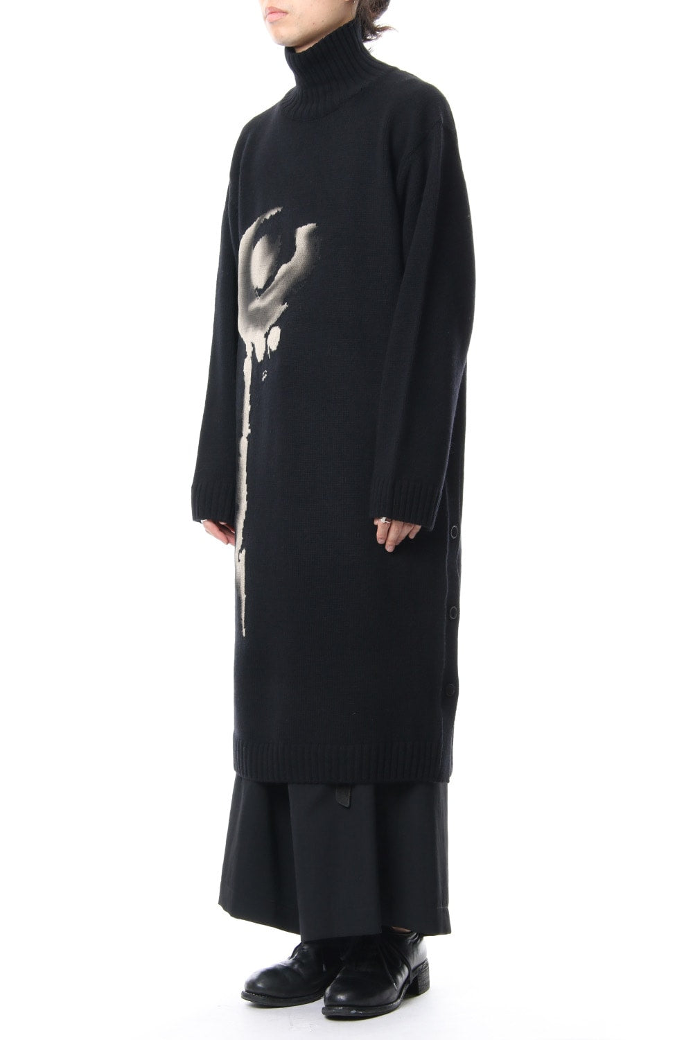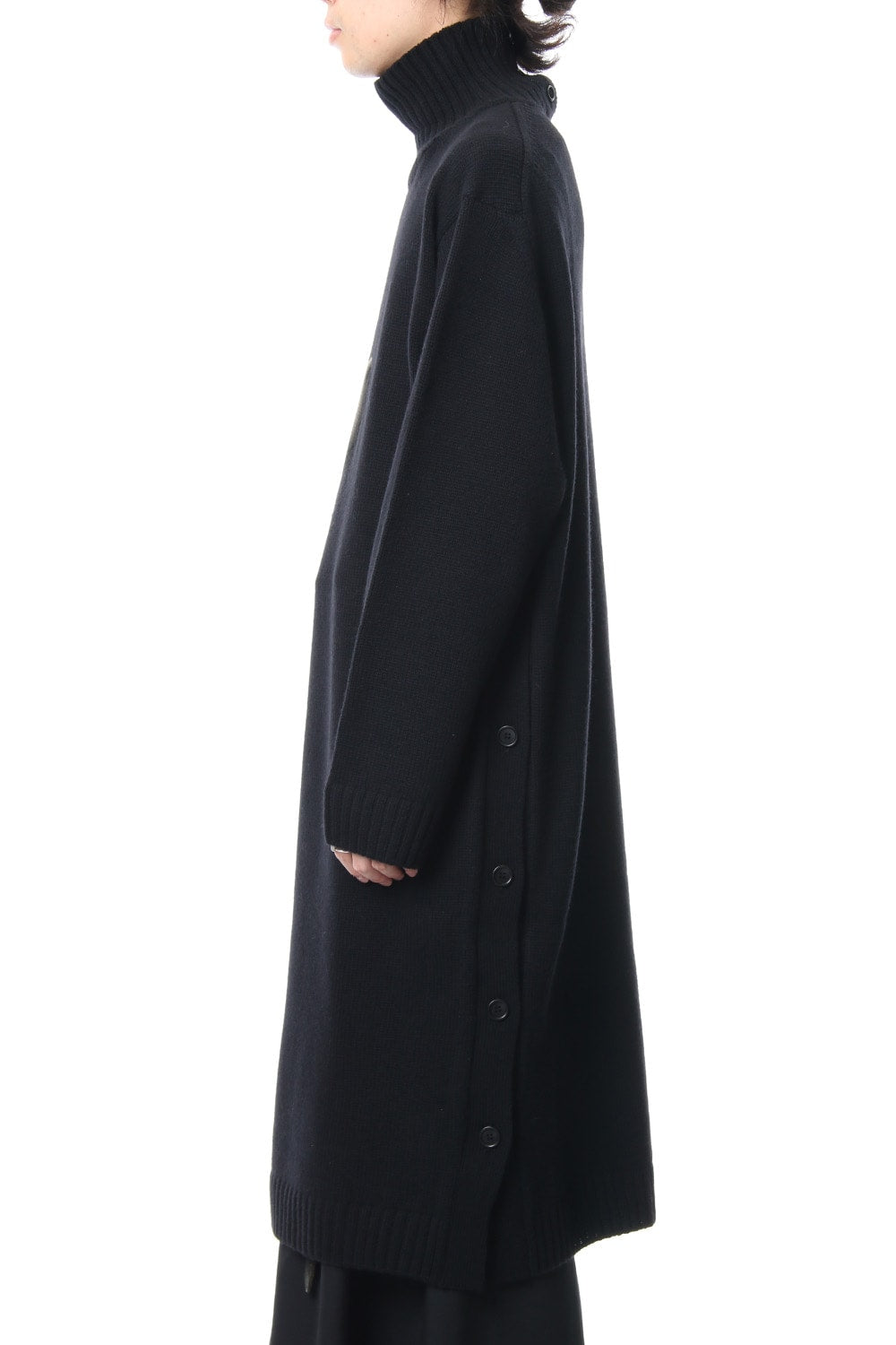 A 5 gauge high neck pullover knit featuring a knitted pattern of hand illustrations of a woman drawn on. Illustration part is expressed with knitted pattern and pigment print. Pigment prints are hand done with shading on the design pattern and drawing depth. Wool is used for the ground part, it is light and well textured. For the design pattern part, cotton was used as it is easy to be pigmented. Buttons are arranged on the left side making it possible to arrange according to your own style.