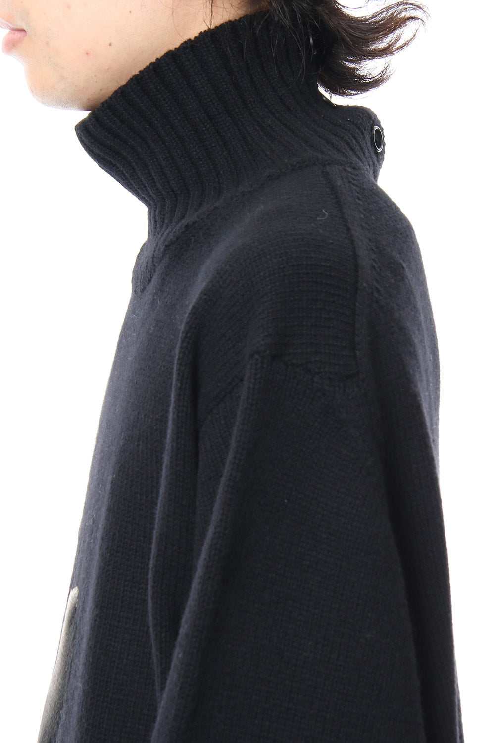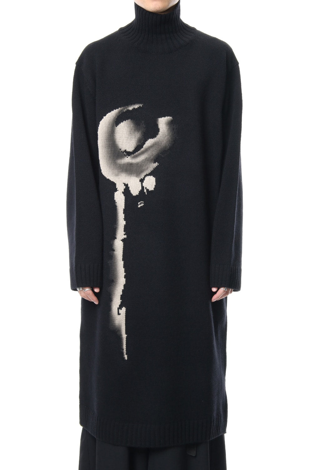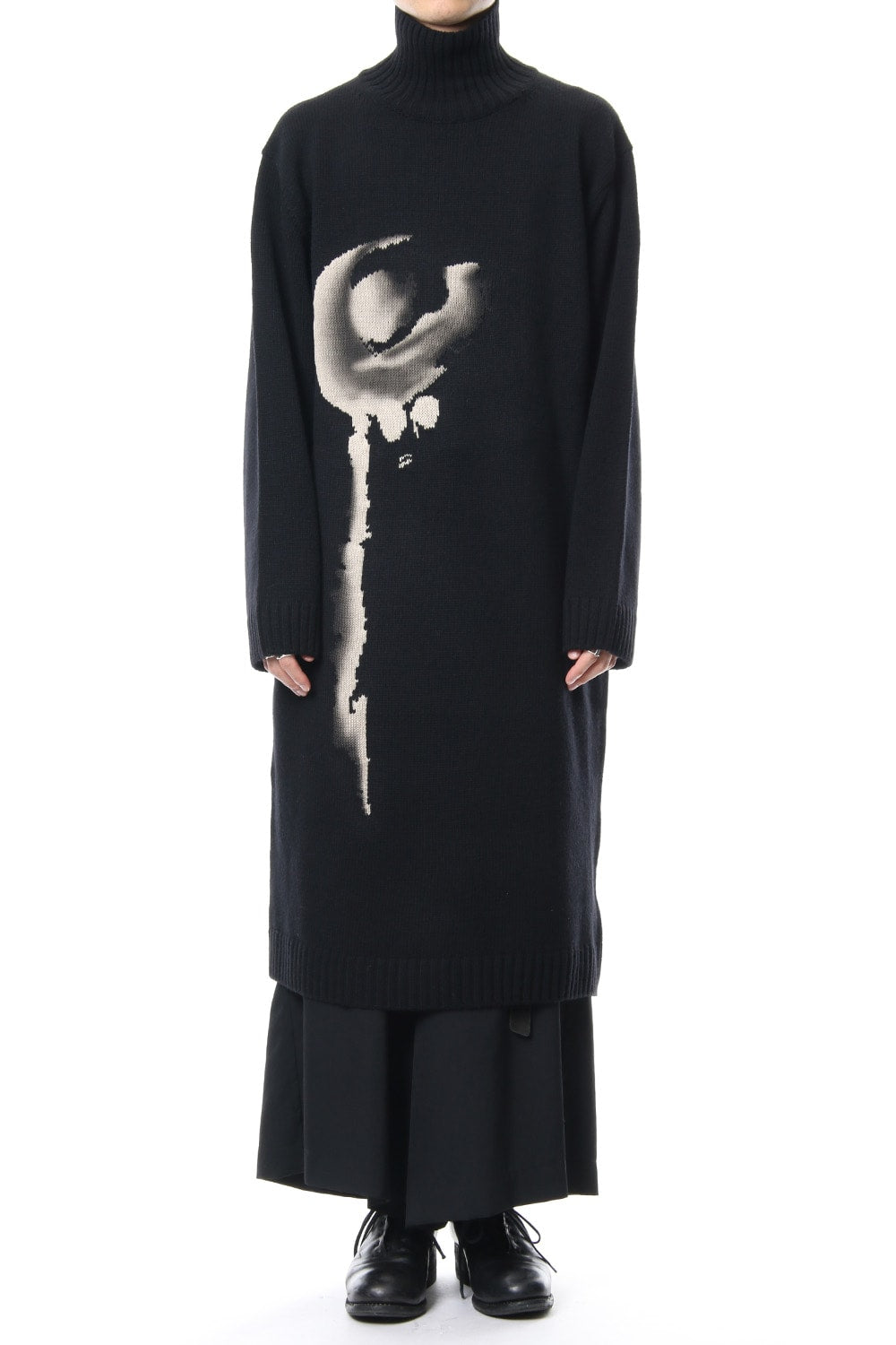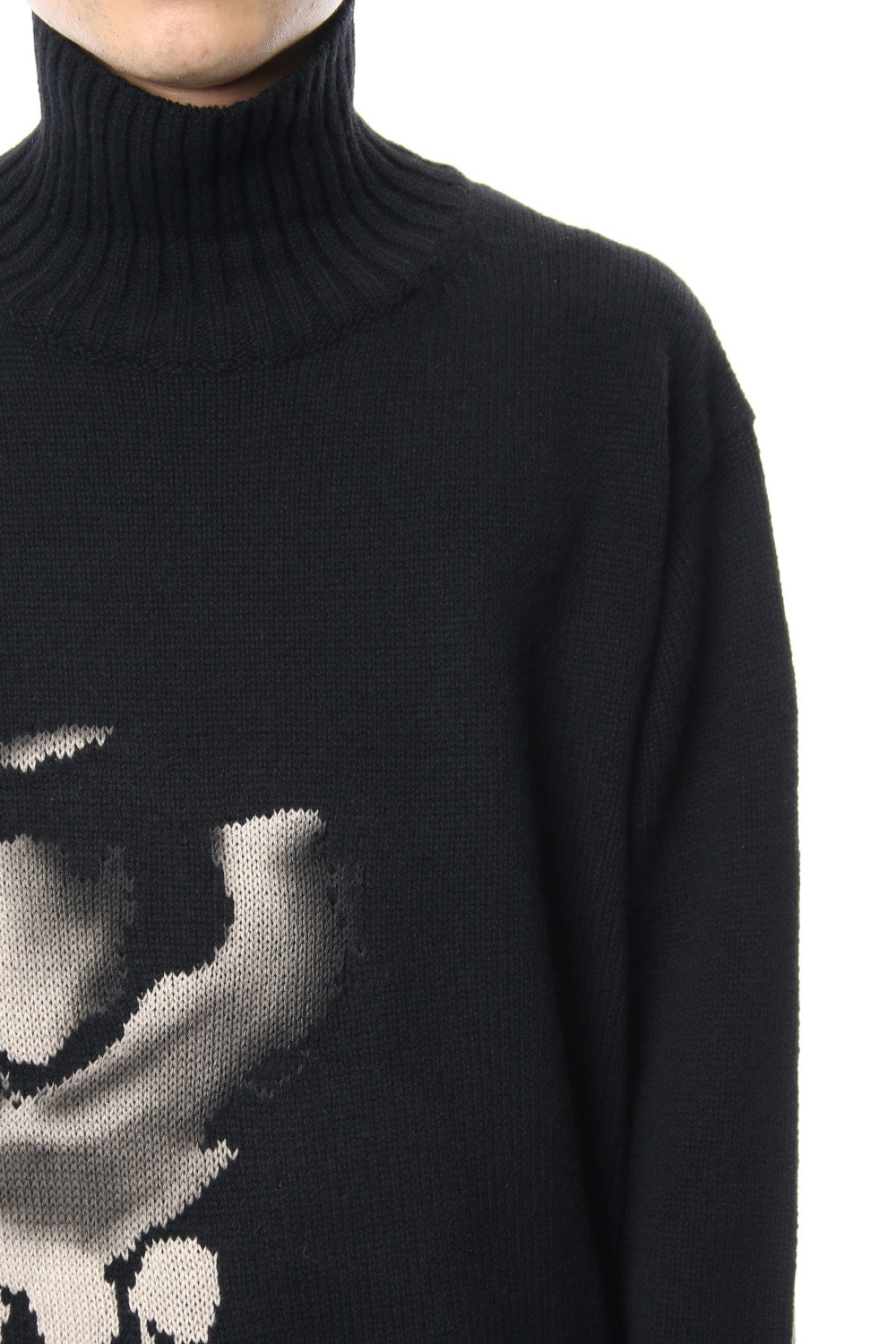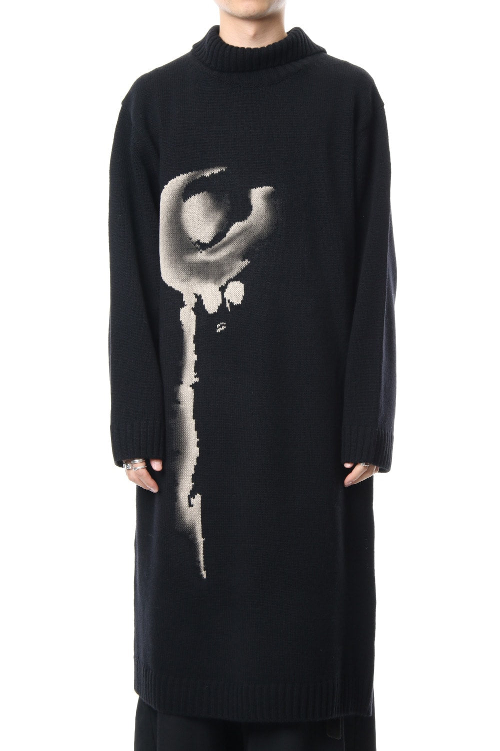 A 5 gauge high neck pullover knit featuring a knitted pattern of hand illustrations of a woman drawn on. Illustration part is expressed with knitted pattern and pigment print. Pigment prints are hand done with shading on the design pattern and drawing depth. Wool is used for the ground part, it is light and well textured. For the design pattern part, cotton was used as it is easy to be pigmented. Buttons are arranged on the left side making it possible to arrange according to your own style.