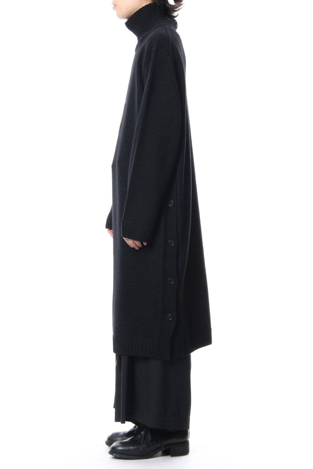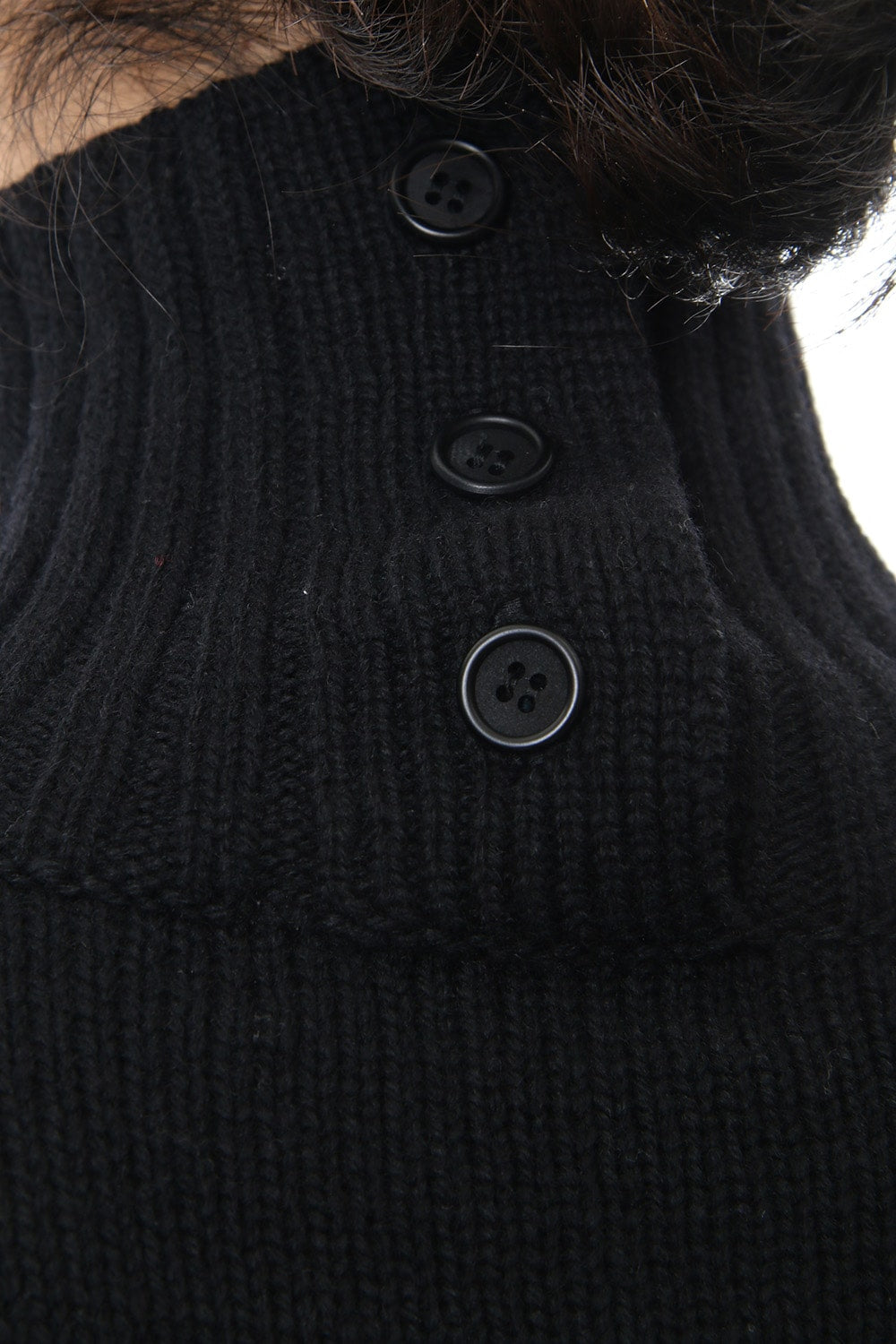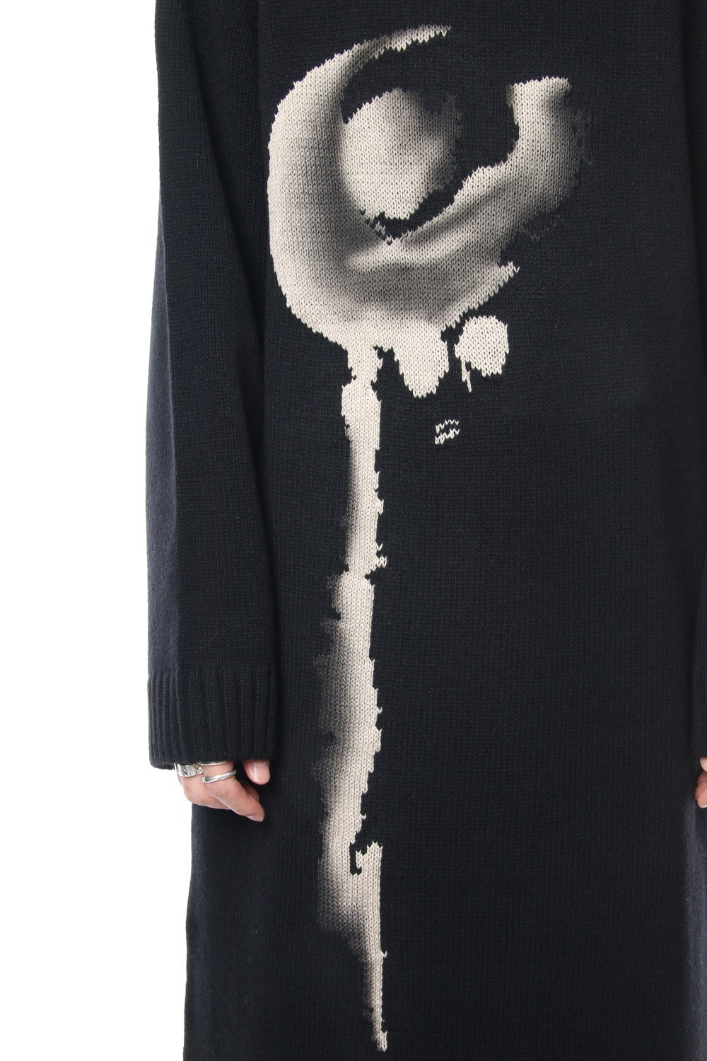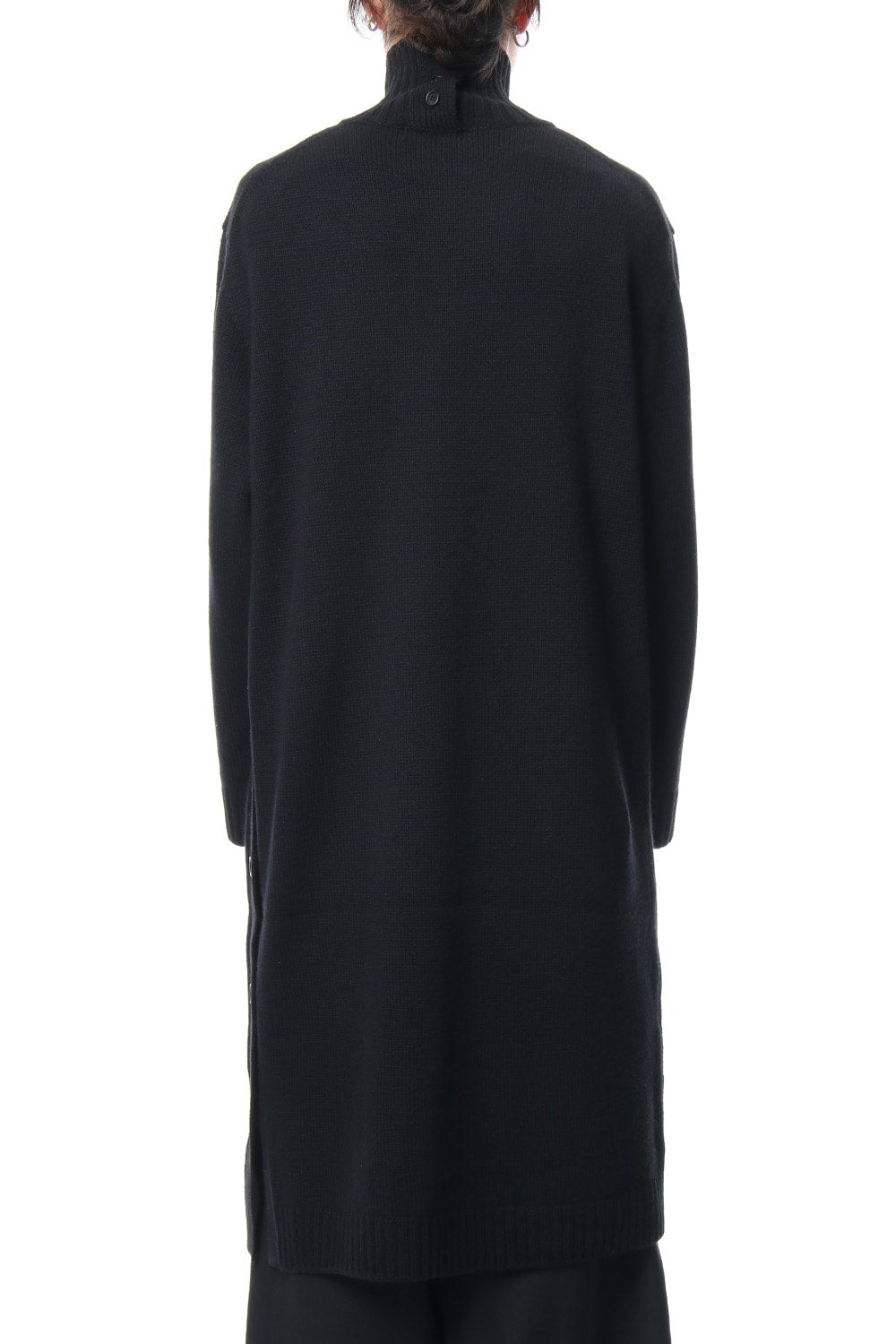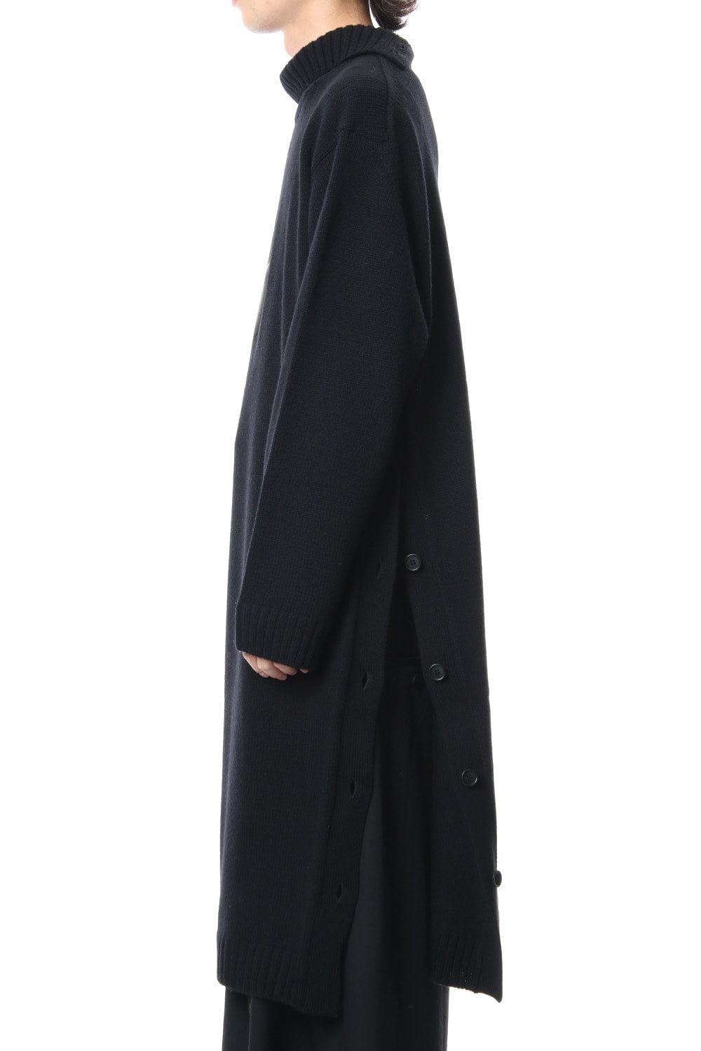 A 5 gauge high neck pullover knit featuring a knitted pattern of hand illustrations of a woman drawn on. Illustration part is expressed with knitted pattern and pigment print. Pigment prints are hand done with shading on the design pattern and drawing depth. Wool is used for the ground part, it is light and well textured. For the design pattern part, cotton was used as it is easy to be pigmented. Buttons are arranged on the left side making it possible to arrange according to your own style.