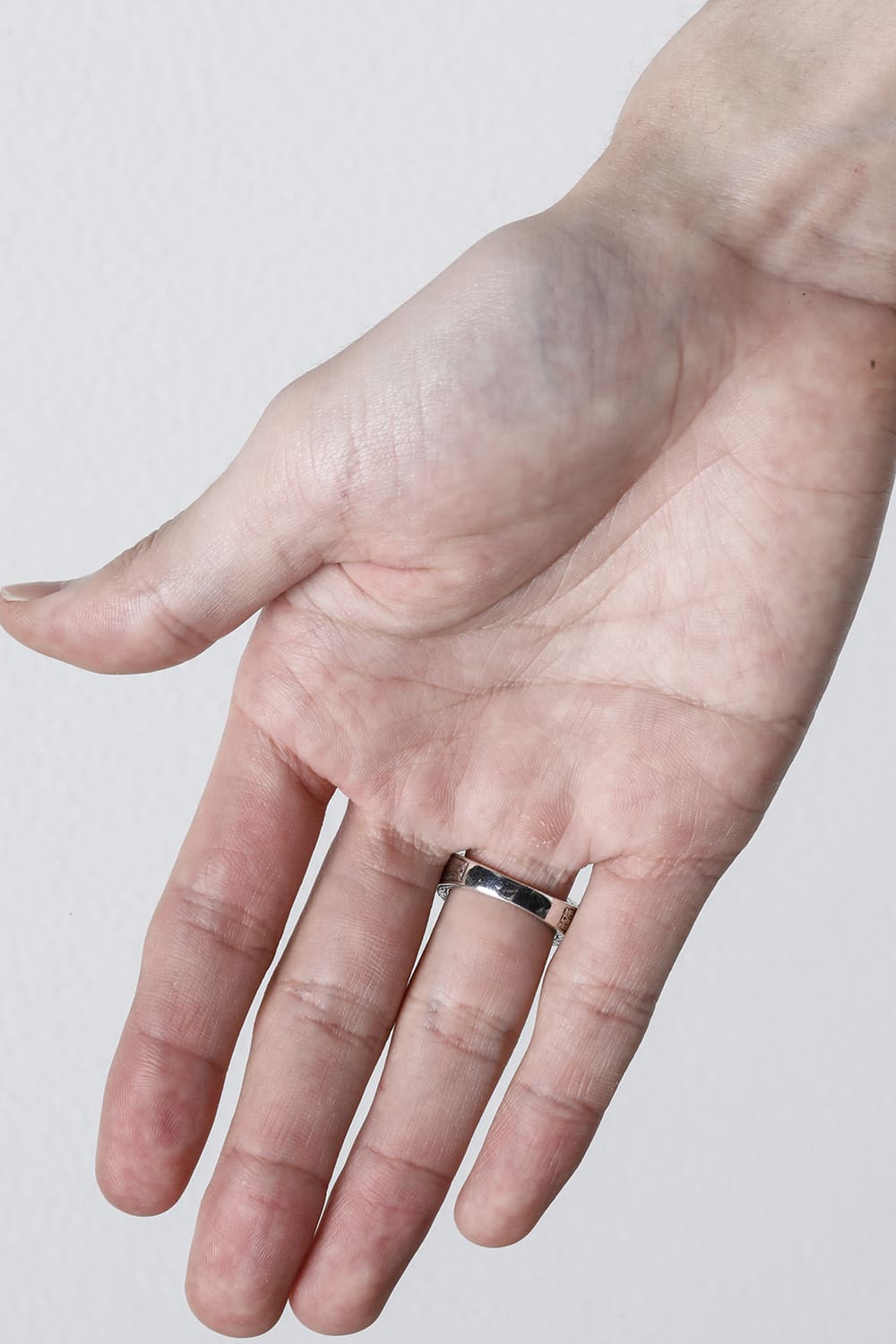This is a ring with an openwork design that is about the middle size in volume for the brand. The top part is hollow and decorated with openwork, which is the brand's specialty. The top part is made of 18K gold, and the craftsmanship can be seen from the beautiful processing to the extent that the seam between silver and gold is not visible at all. The side of the ring has a carved pattern, making it a beautiful ring from various angles.