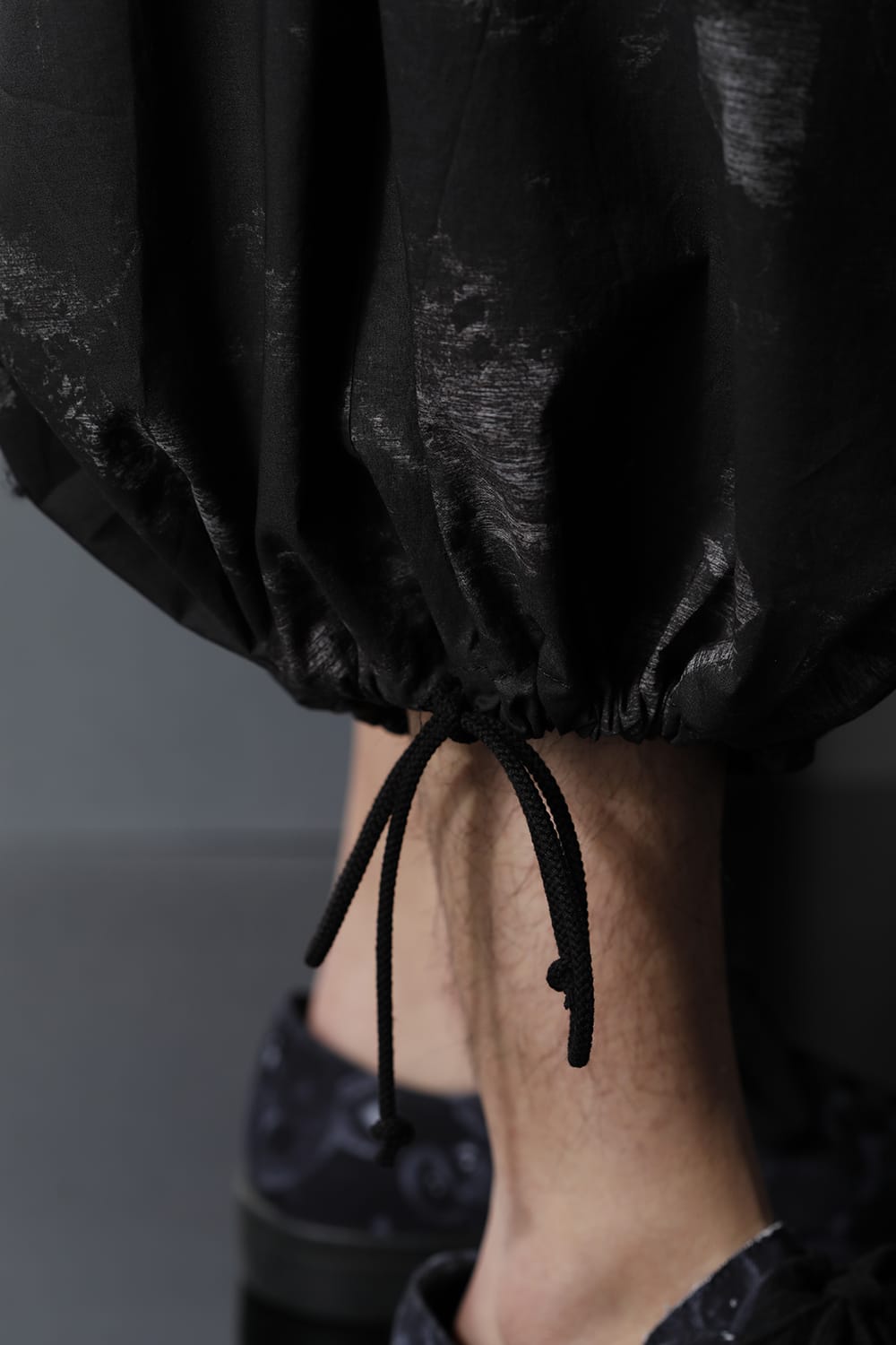 Asymmetrical pants in front and asymmetrical in back. You can enjoy changing the silhouette with the string passing through the hem.