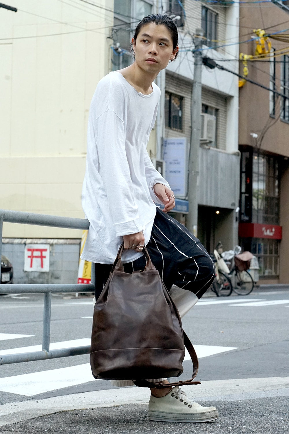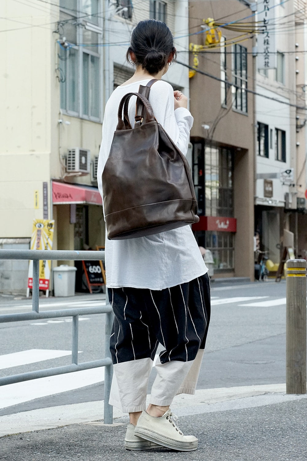 The new work "hand duffle" was announced in the collection theme of "manual work and light". It is a new shoulder strap which can be used as a duffle bag based on a vertical type middle size tote bag. Since the shoulder belt length can be adjustable, you can use and sling is diagonally. The versatility allows the carrier to use it many ways easily such as when riding bicycles and motorcycles. In addition, a magnet is arranged inside the opening upper part of the bag, and it is a 2 way specification which can enlarge the opening by removing the magnet. The material is a hand brown of Shave Steer which was newly added from 18-19 AW. The steer has a sense of texture like nubuck as the silver was shaved off a little; it was hand crafted by hand painting to dark brown to and then made into a foundation of a distinctive expression. In addition, by dyeing a thin blanc thinner than the hand painted, it gave depth to the material. It is leather which you can enjoy for a long time with the beautiful changes. The size make it great for daily use and A4 size items fits easily. Inner pocket, one with zipper.