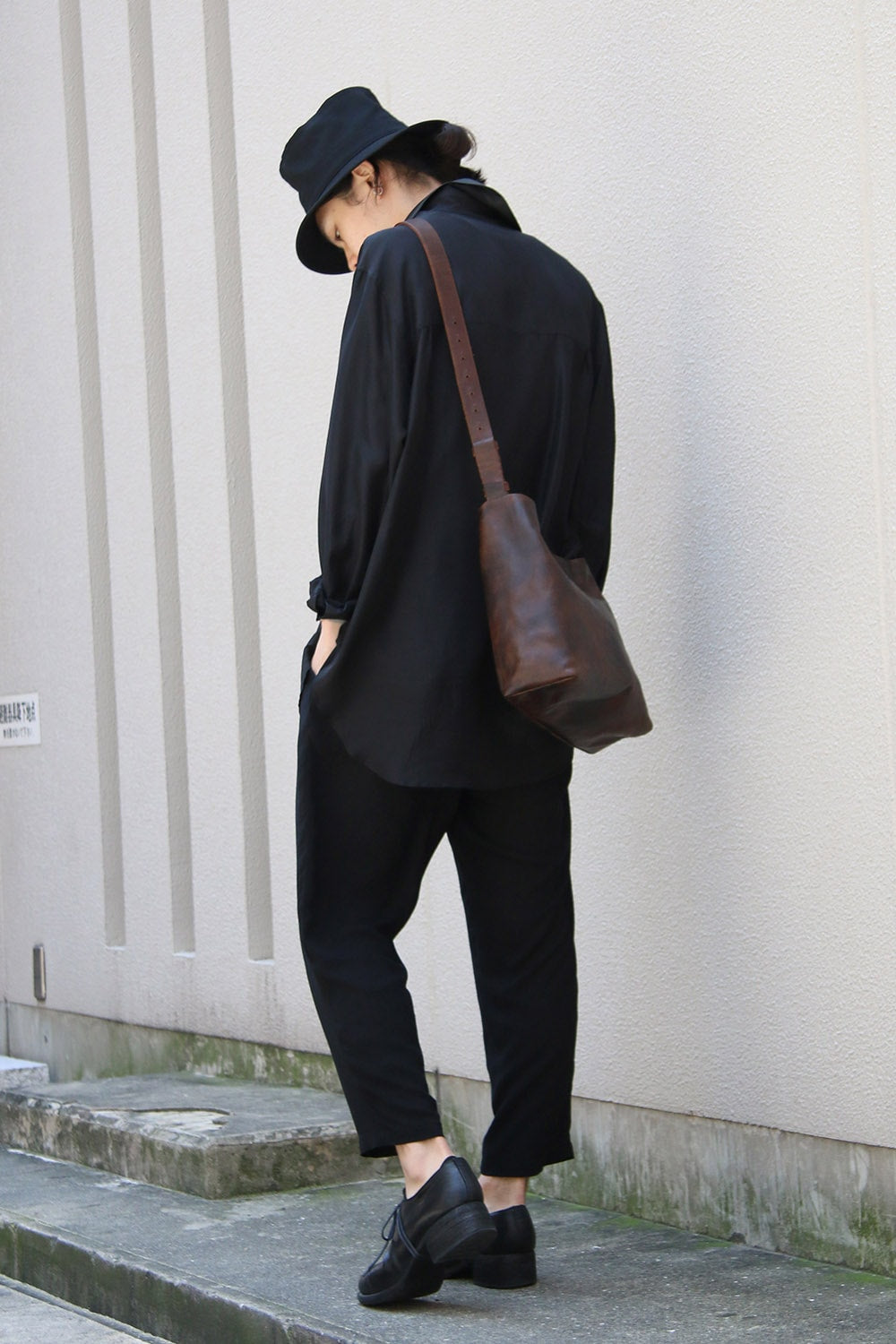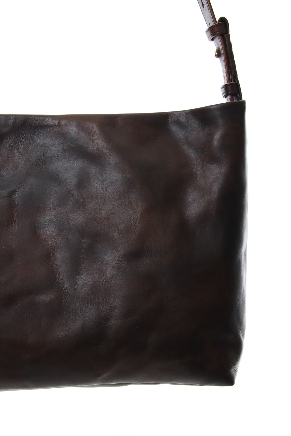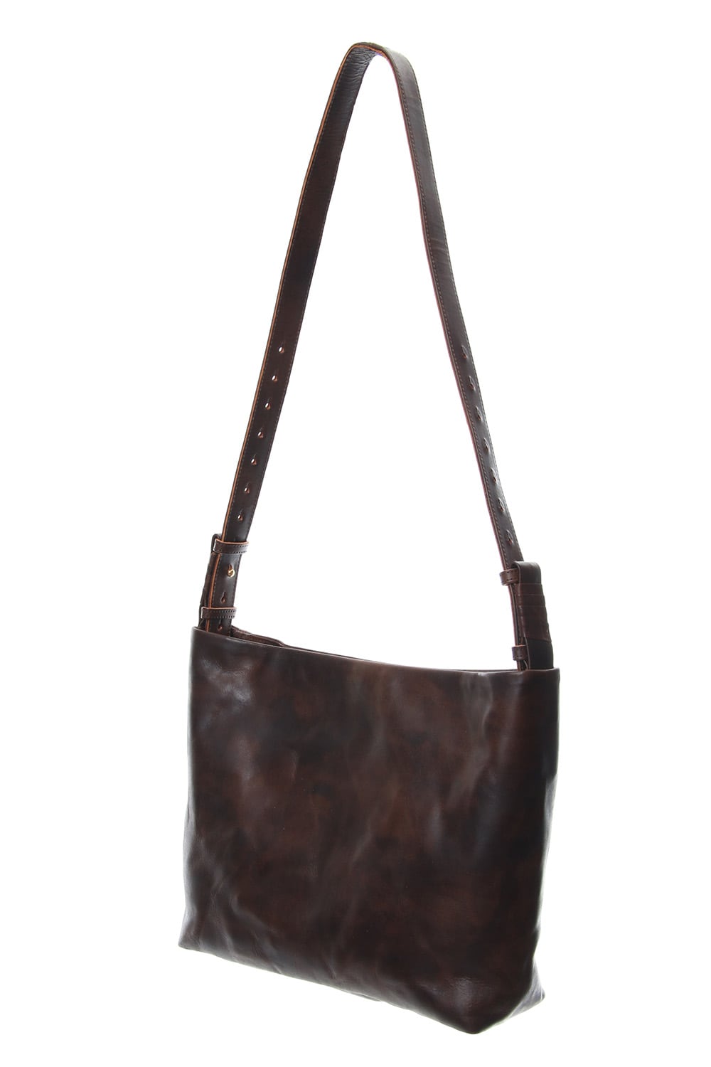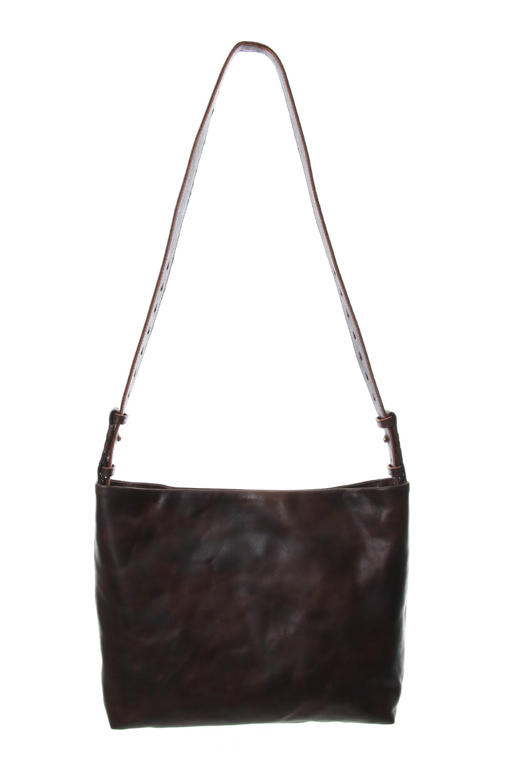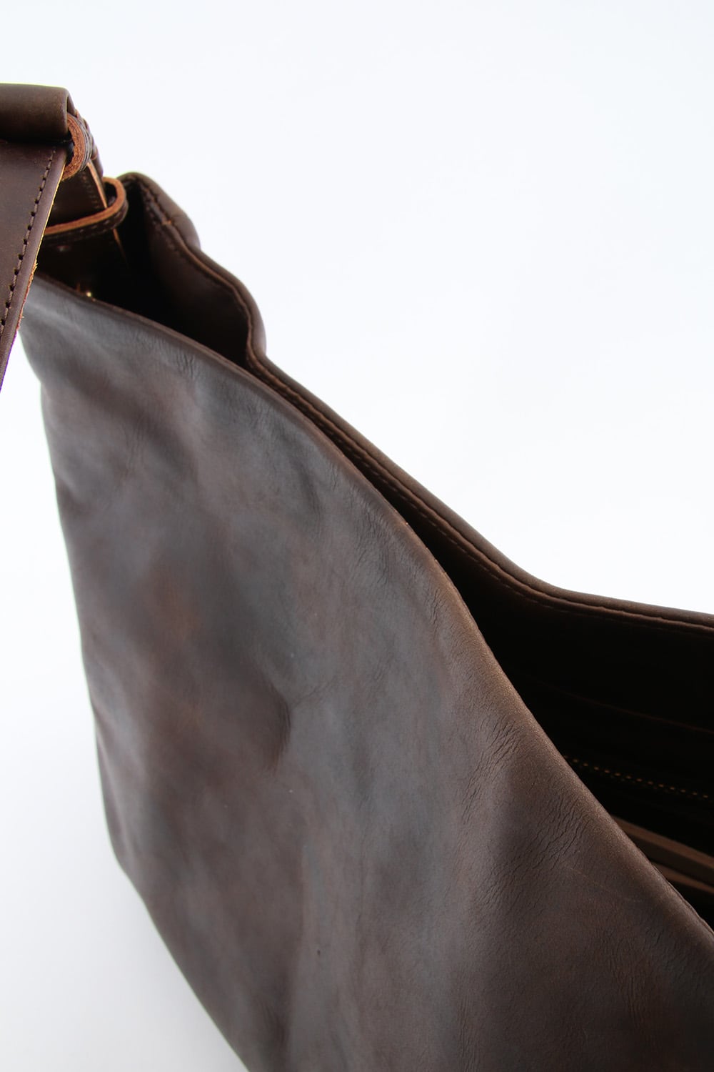 This new "hand piece shoulder bag' was announced as part of the theme "manual work and lightness" expressed by a single piece of body, minimal but functional. The opening part of the bag is closed by a magnet. When diagonally slung, it has a beautiful look that integrates style along the body. The part along the body has been treated so that seams do not hit when worn. The material is a hand brown of Shave Steer which was newly added from 18-19 AW. The steer has a sense of texture like nubuck as the silver was shaved off a little; it was hand crafted by hand painting to dark brown to and then made into a foundation of a distinctive expression. In addition, by dyeing a thin blanc thinner than the hand painted, it gave depth to the material. It is leather which you can enjoy for a long time with the beautiful changes.
