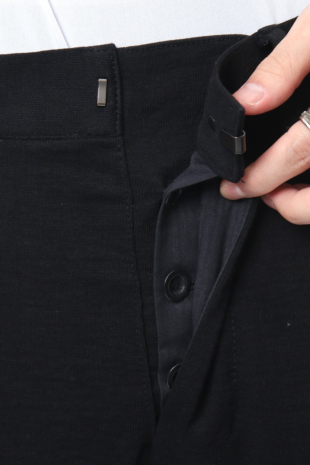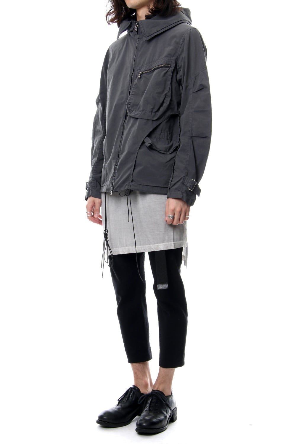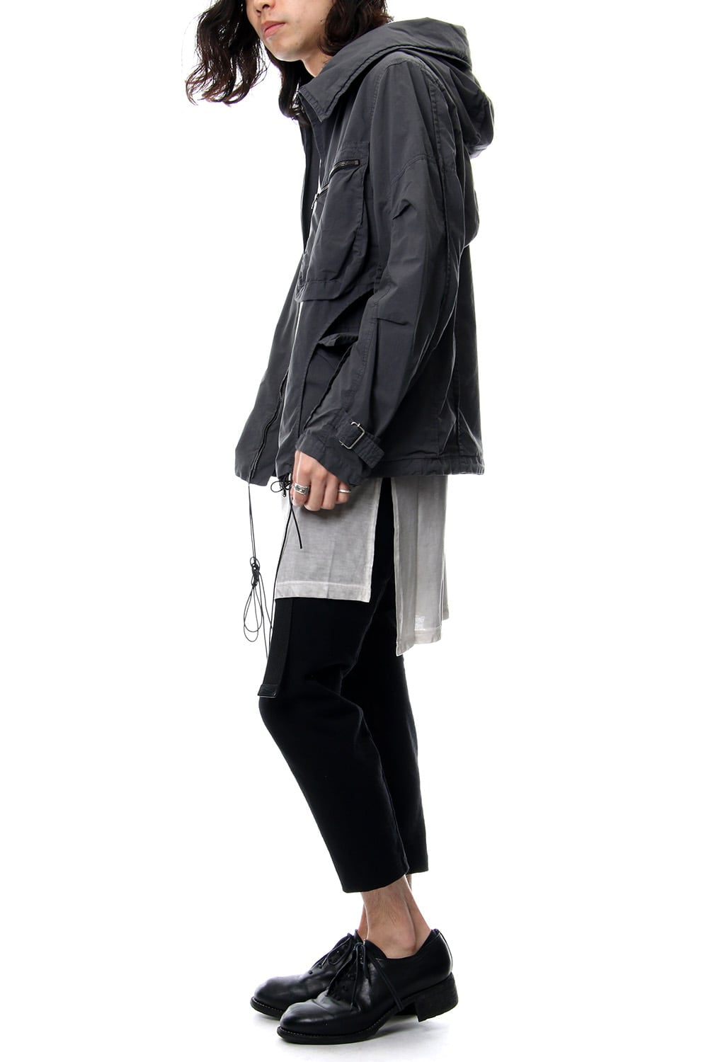 Cropped length pants with a tight silhouette which is a change in shape for this season. This season, dry touch is used and they are woven with 14/- strong twist hallow spinning. Slash pockets are arranged on the darts on the front body.