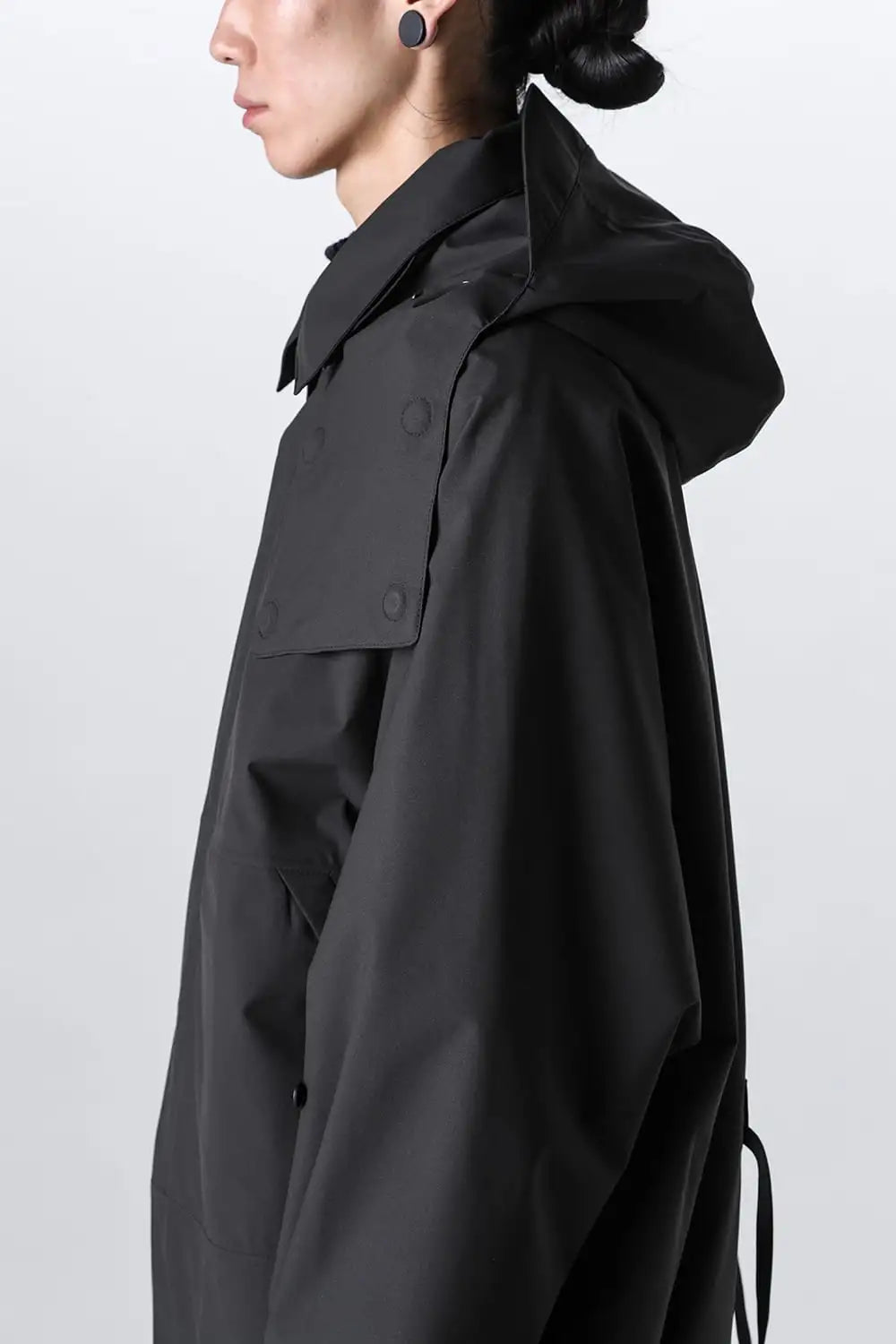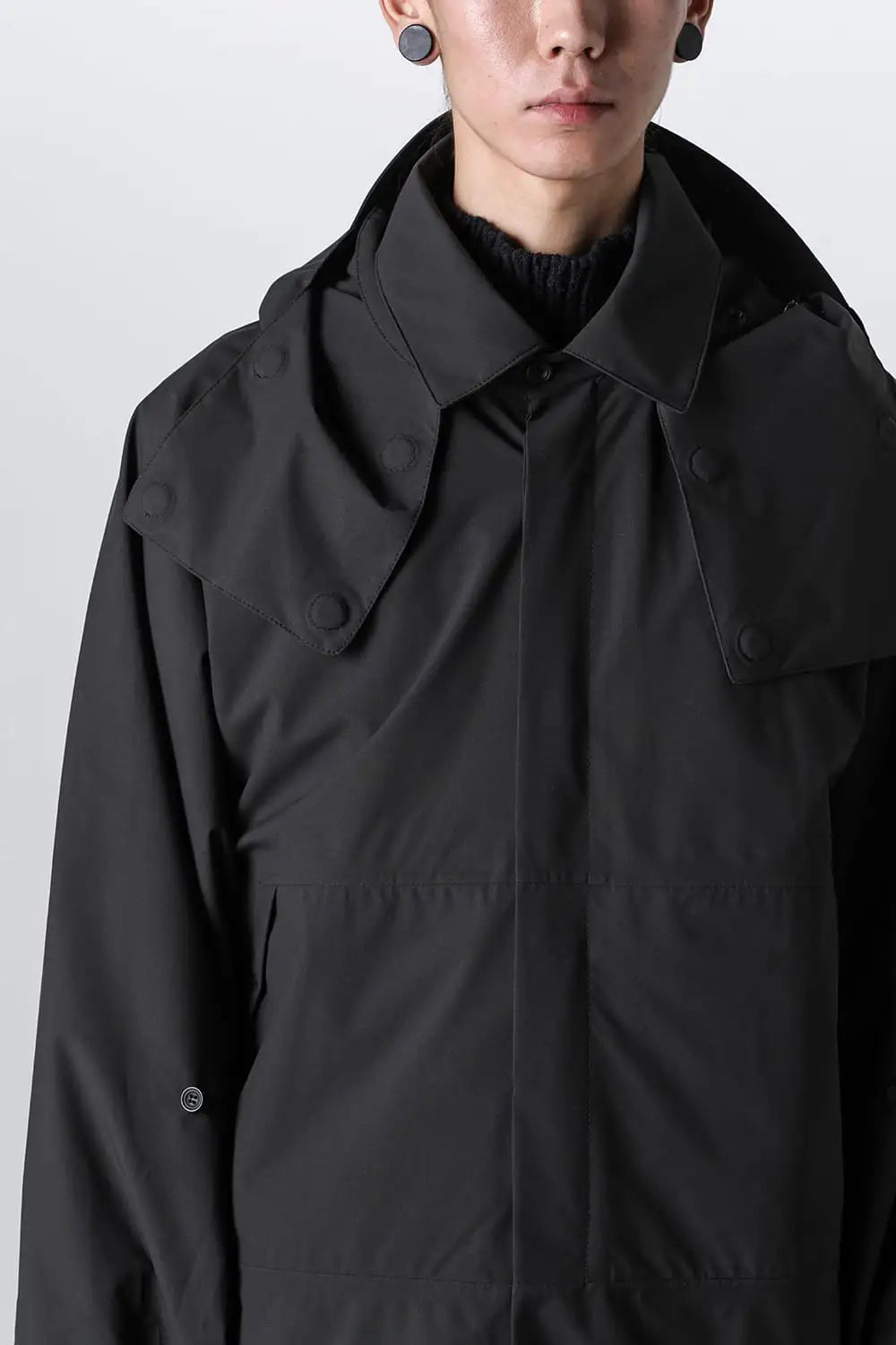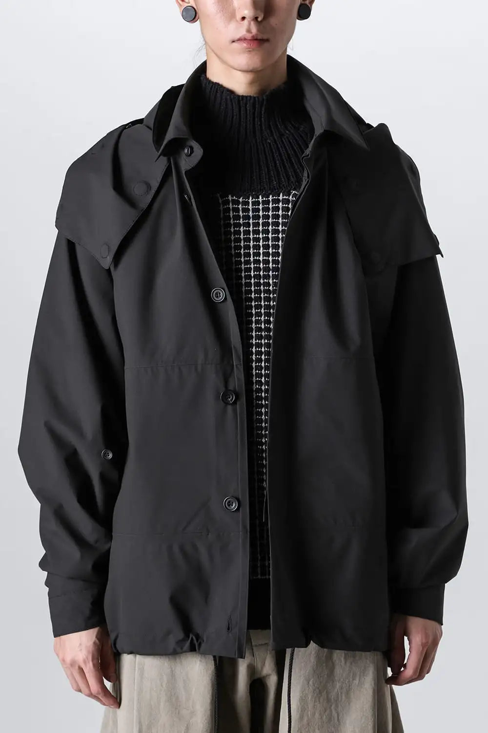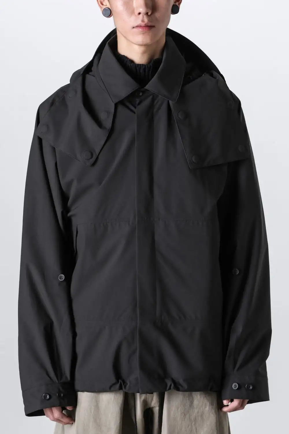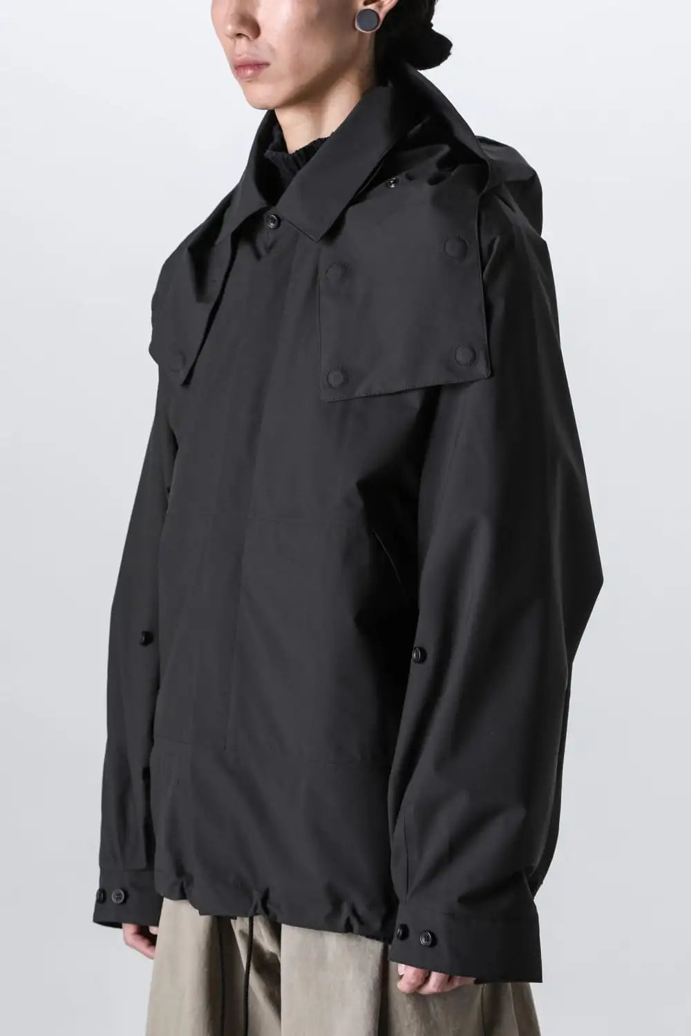 When the hood is removed, the jacket changes into a jacket with coach jacket-like details.