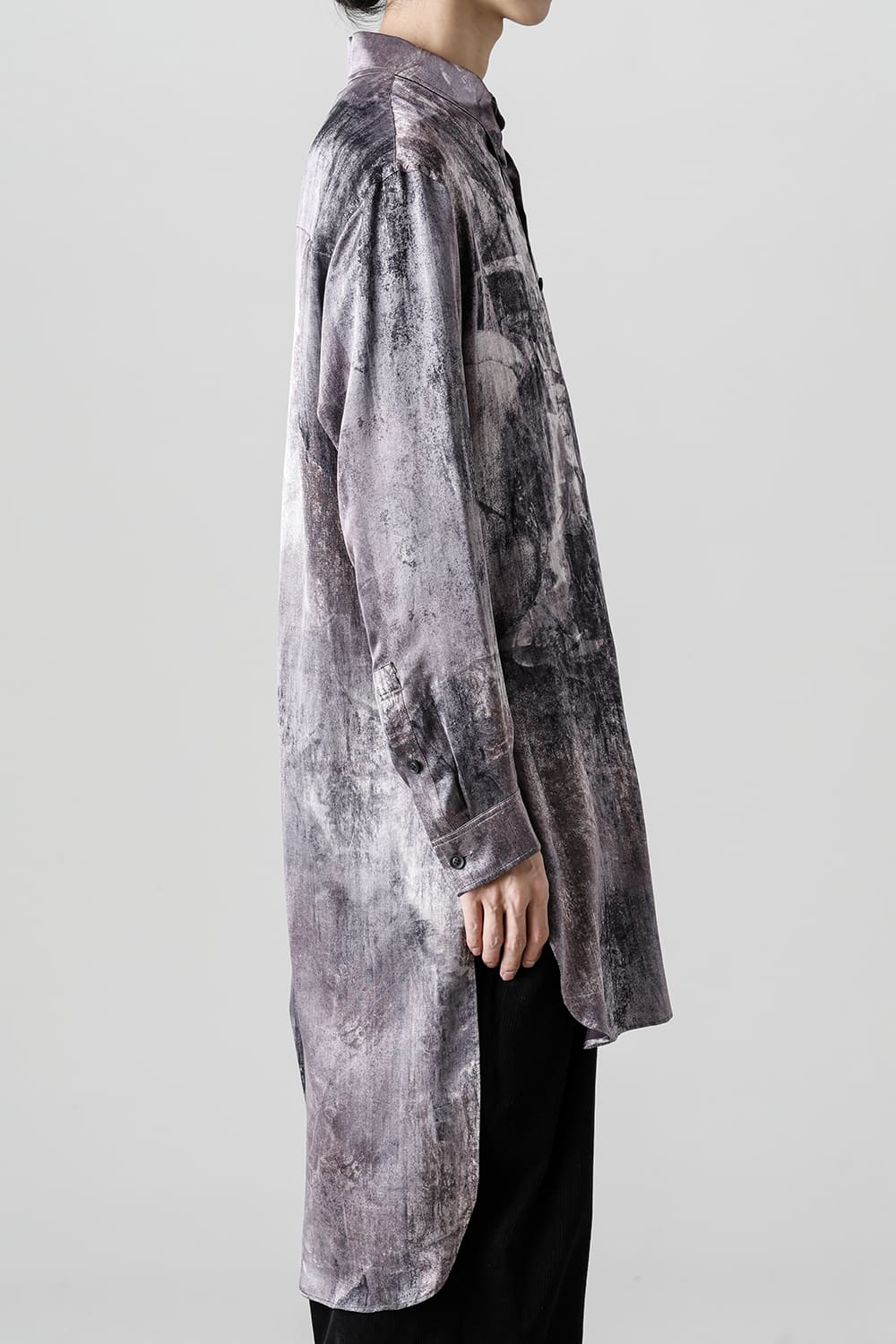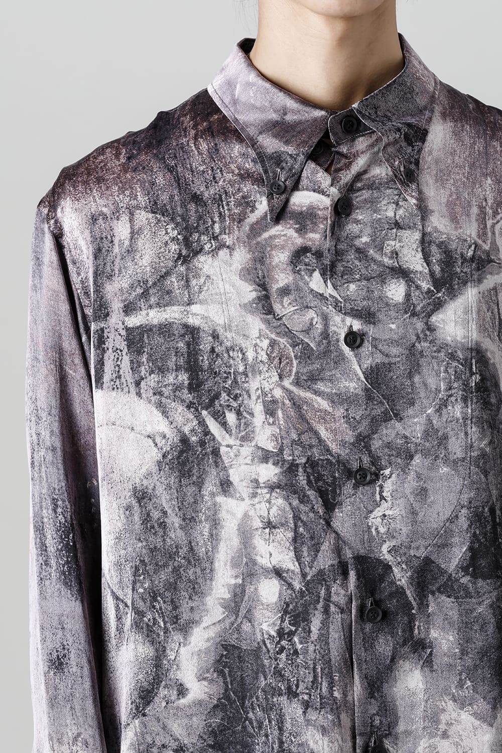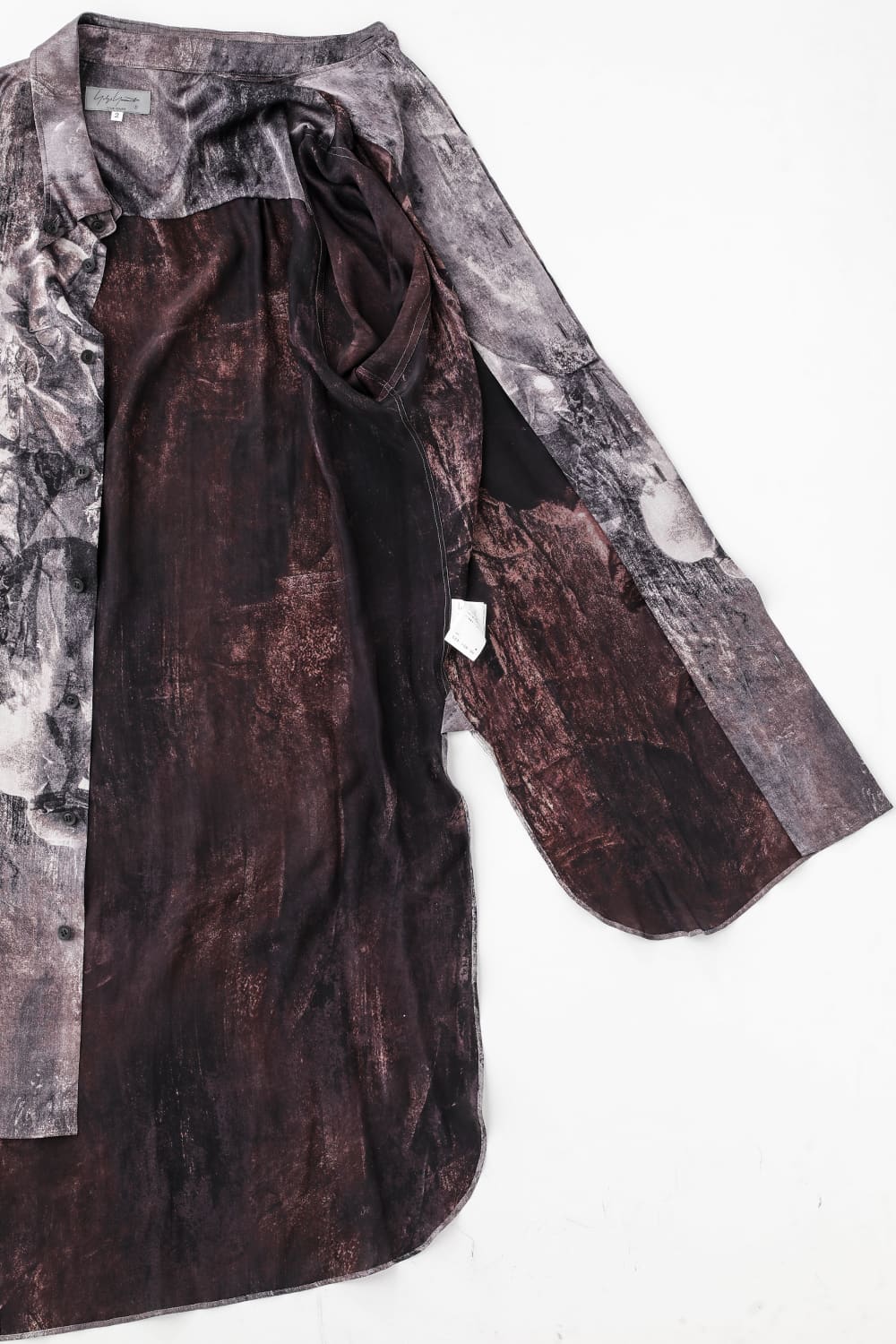 Silk satin print shirt that was worn at runway LOOK 26. Based on the works of Polish artist Zdzysław Bexinski, this item has a vivid graphic print that combines the designs of women created in the studio. The lining of 12 monme silk satin gives it an elegant texture with a slight luster. The cuttlefish breast is made of two layers, and the neck can be arranged in various ways.