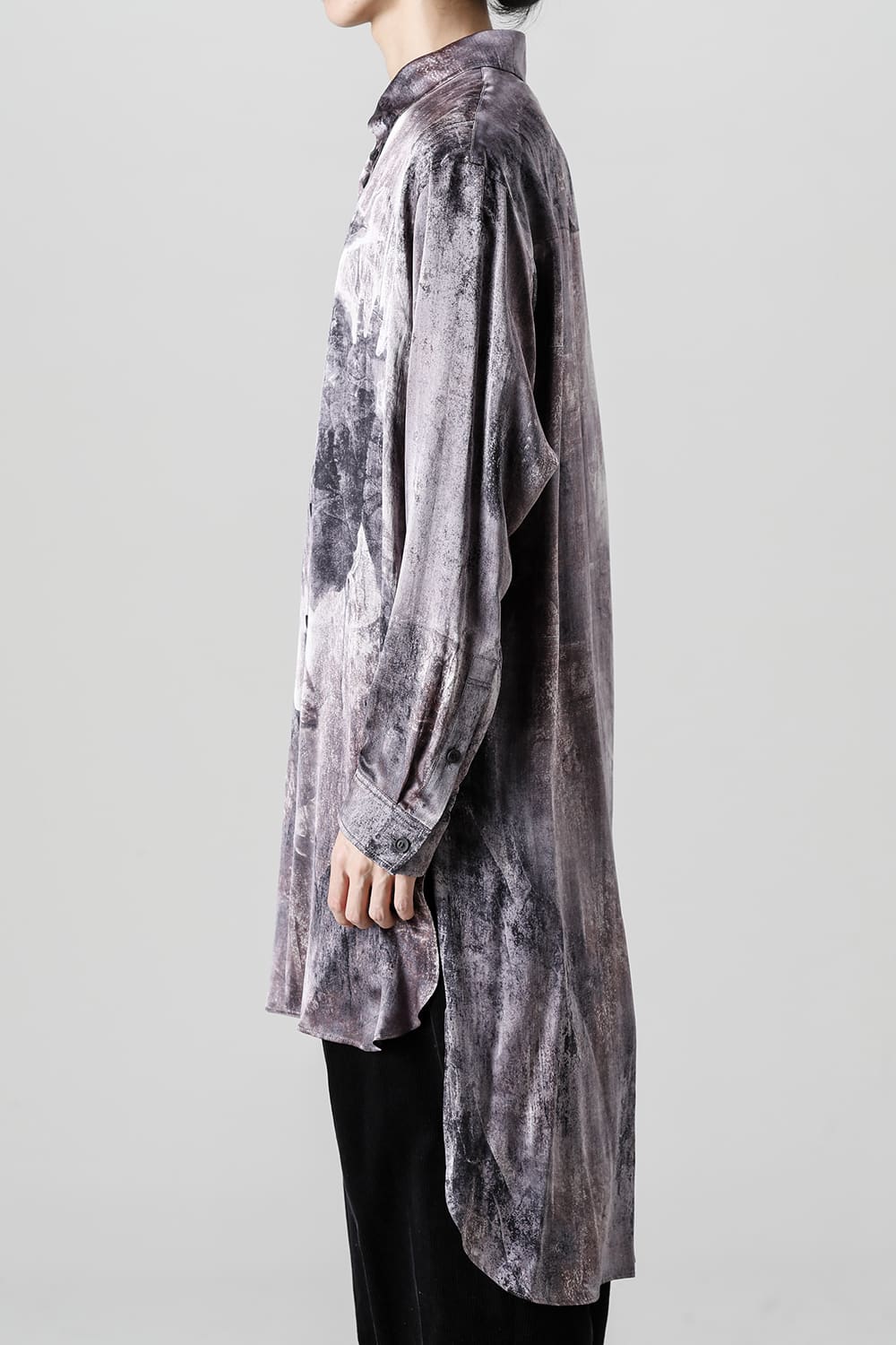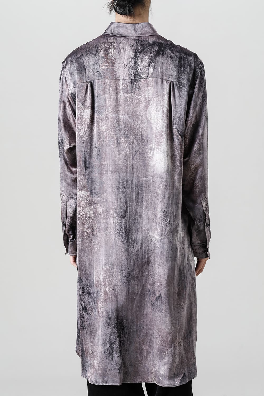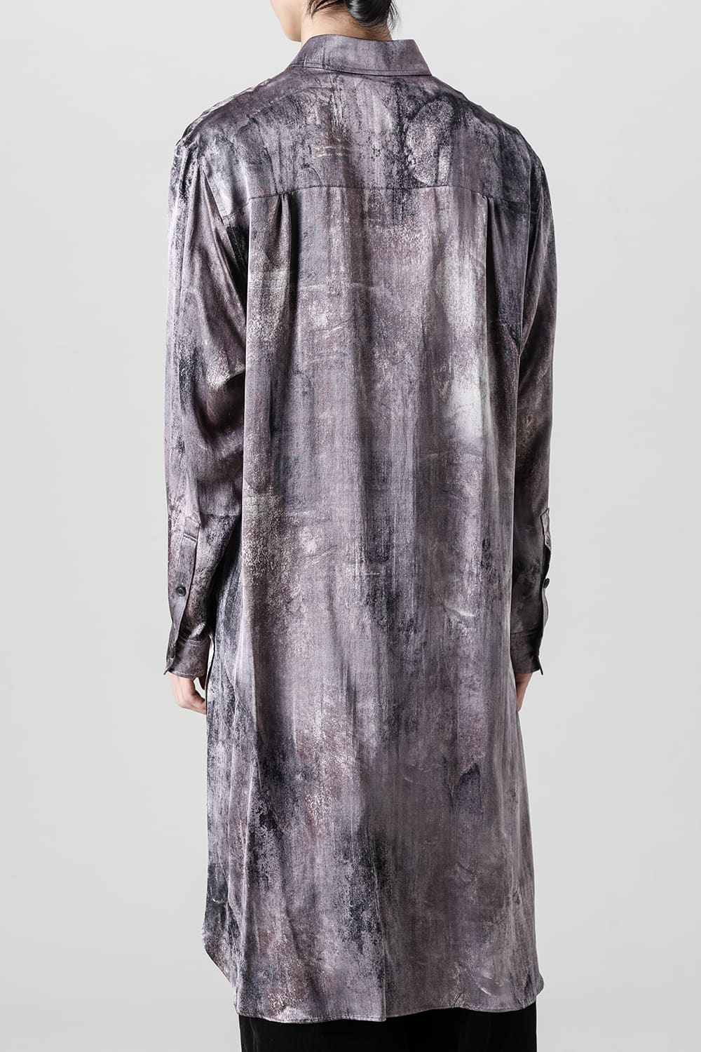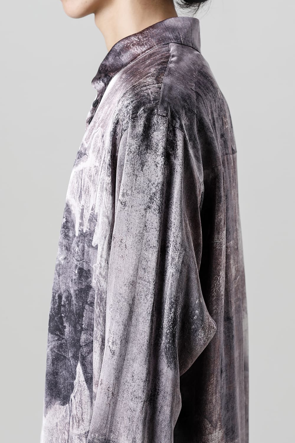 Silk satin print shirt that was worn at runway LOOK 26. Based on the works of Polish artist Zdzysław Bexinski, this item has a vivid graphic print that combines the designs of women created in the studio. The lining of 12 monme silk satin gives it an elegant texture with a slight luster. The cuttlefish breast is made of two layers, and the neck can be arranged in various ways.
