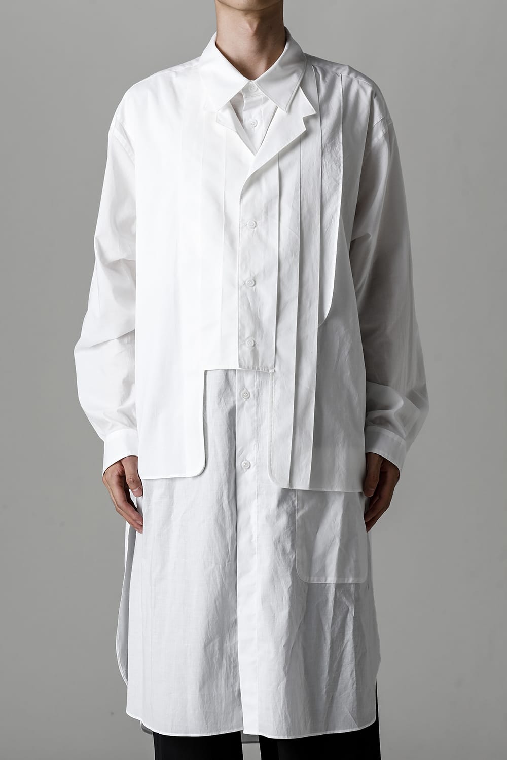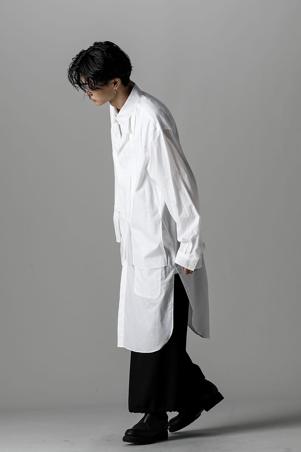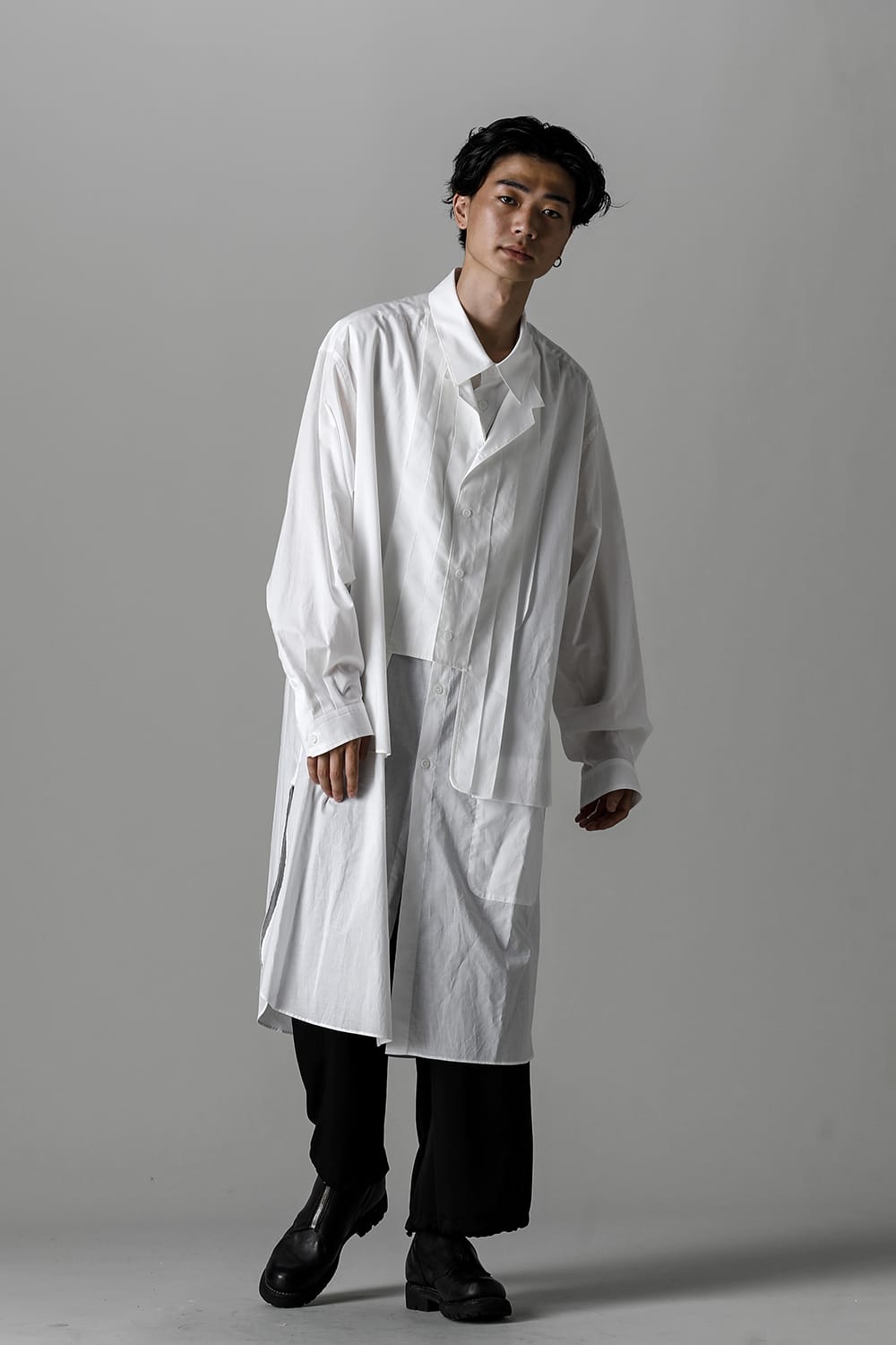 This blouse is one of the shirt series developed as the Power of the WHITE shirt series, which started to be offered from the 22-23AW collection, and was used in LOOK 35 of the collection. The layered design from the collar to the front is impressive, and this elegant shirt incorporates dress shirt details such as side slits, gathers at the back yoke, and tucking at the sleeves. The 60 count single thread count lawn fabric has a fine texture and is less transparent, and the one-washed finish gives it a soft and fluffy feel. Relaxed fit with wide body and shoulder widths. Dressy impression but very light and stress-free comfort.